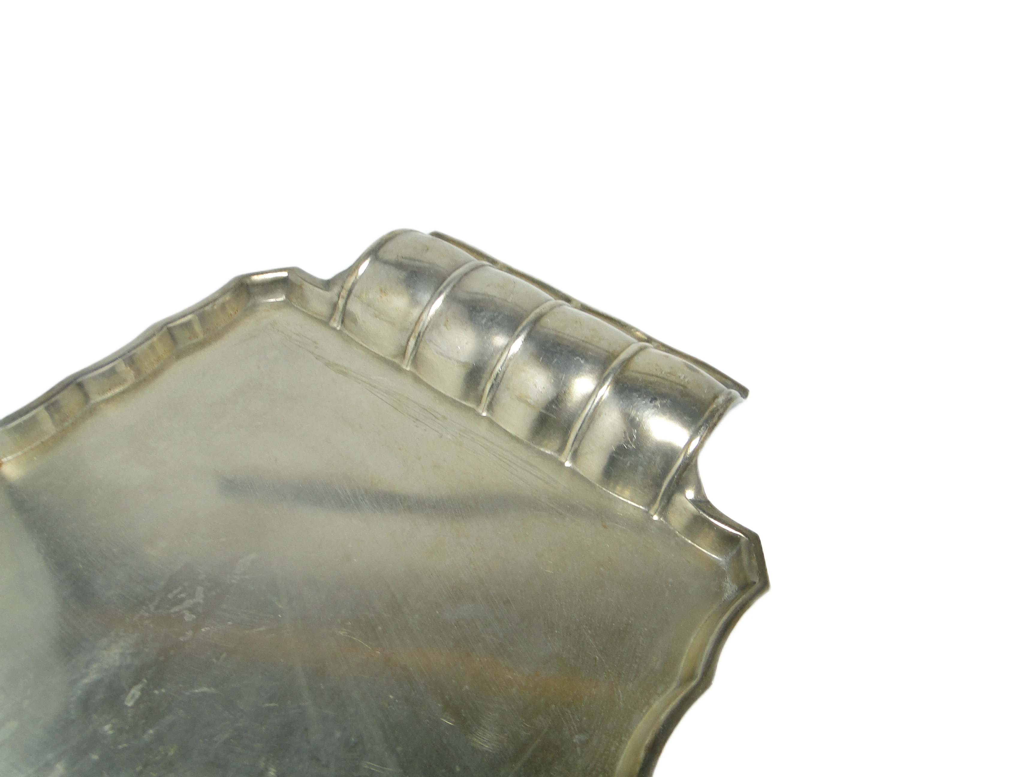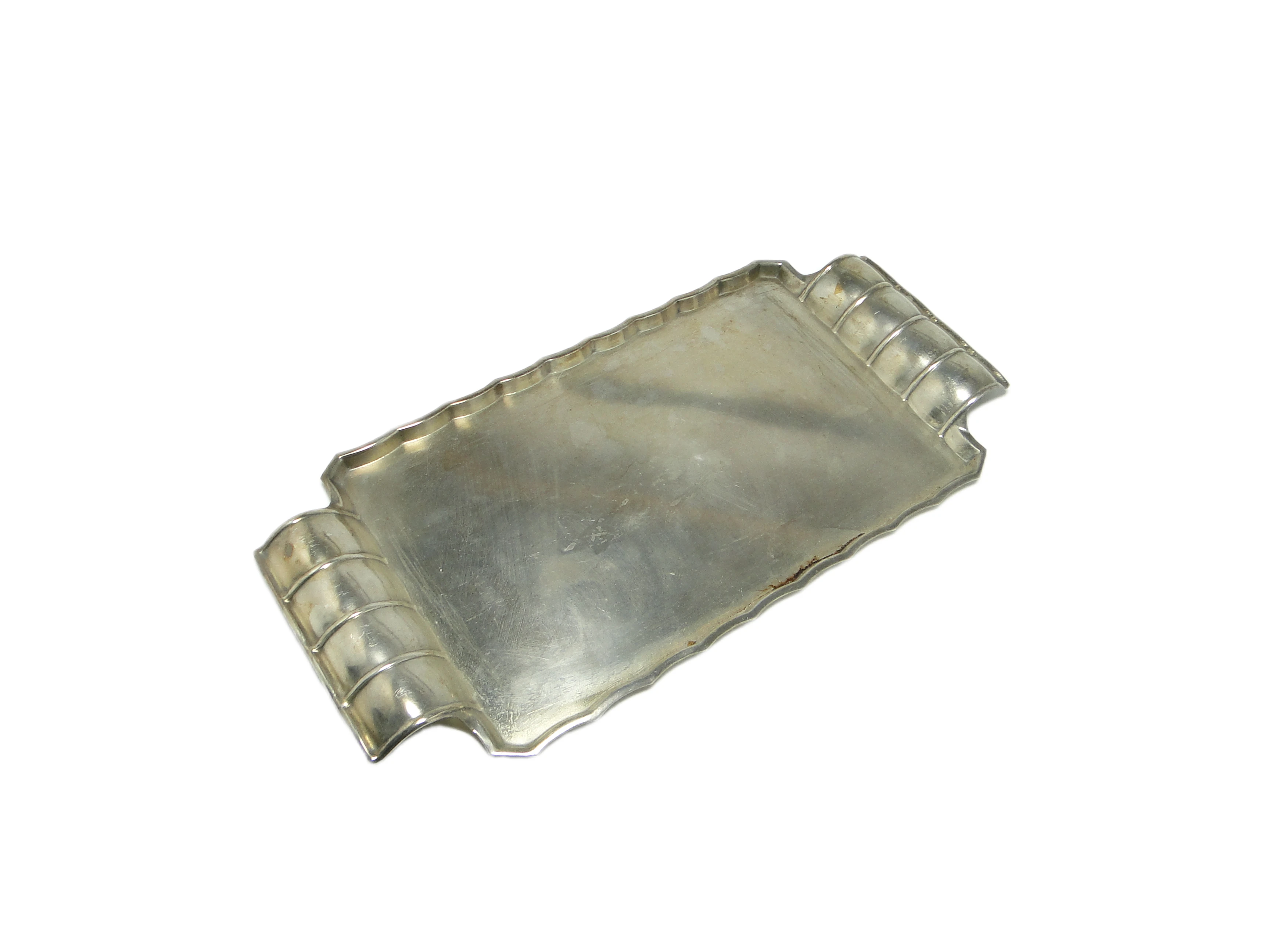 Prostokątna taca dekoracyjna wyprodukowana przez wytwórnię Szandrik na Węgrzech w latach 30. XX wieku to przykład rzemiosła art déco, w którym mosiądz srebrzony uzyskał półmatowe, lekko odbijające światło wykończenie z delikatną patyną. Charakterystyczne są geometryczne, schodkowe uchwyty na krótszych bokach – każdy zbudowany z trzech wypukłych segmentów, układających się w rytmiczny, architektoniczny detal. Obrzeże tacy subtelnie profilowano, główna płaszczyzna pozostaje gładka i niezdobiona, z widocznymi drobnymi rysami oraz śladami użytkowania typowymi dla wieku przedmiotu. Konstrukcja jest solidna, bez widocznych łączeń i napraw, a całość zachowana w bardzo dobrym stanie – obecna jest jedynie niewielka patyna i drobne zarysowania materiału.Forma tej tacy opowiada o międzywojennej fascynacji geometrią i nowoczesnością. Srebrzona powierzchnia miękko odbija światło, a profilowane uchwyty przywodzą na myśl stopnie modernistycznego foyer czy wejście do eleganckiego hotelu z lat 30. Każdy ślad czasu na powierzchni to delikatny zapis codziennych rytuałów minionych dekad – opowieść o przedmiocie, który towarzyszył spotkaniom i powolnym porankom, zachowując przy tym architektoniczną dyscyplinę oraz wyważoną, minimalistyczną dekoracyjność.Taca może zostać wyeksponowana na niskiej konsoli z ciemnego drewna, gdzie kontrast chłodnego srebra i głębokiego brązu podkreśli geometryczny charakter detalu. Dobrze sprawdzi się jako baza pod zestaw szklanych karafek, modernistycznych wazonów lub kolekcję niewielkich figurek z epoki. Wnętrza urządzone w duchu art déco, modernizmu lub eklektyczne przestrzenie kolekcjonerskie zyskają dzięki niej subtelny, architektoniczny akcent – można ją też połączyć z lustrzanymi powierzchniami lub minimalistyczną ceramiką, by wydobyć czystość formy i światłocień metalu.