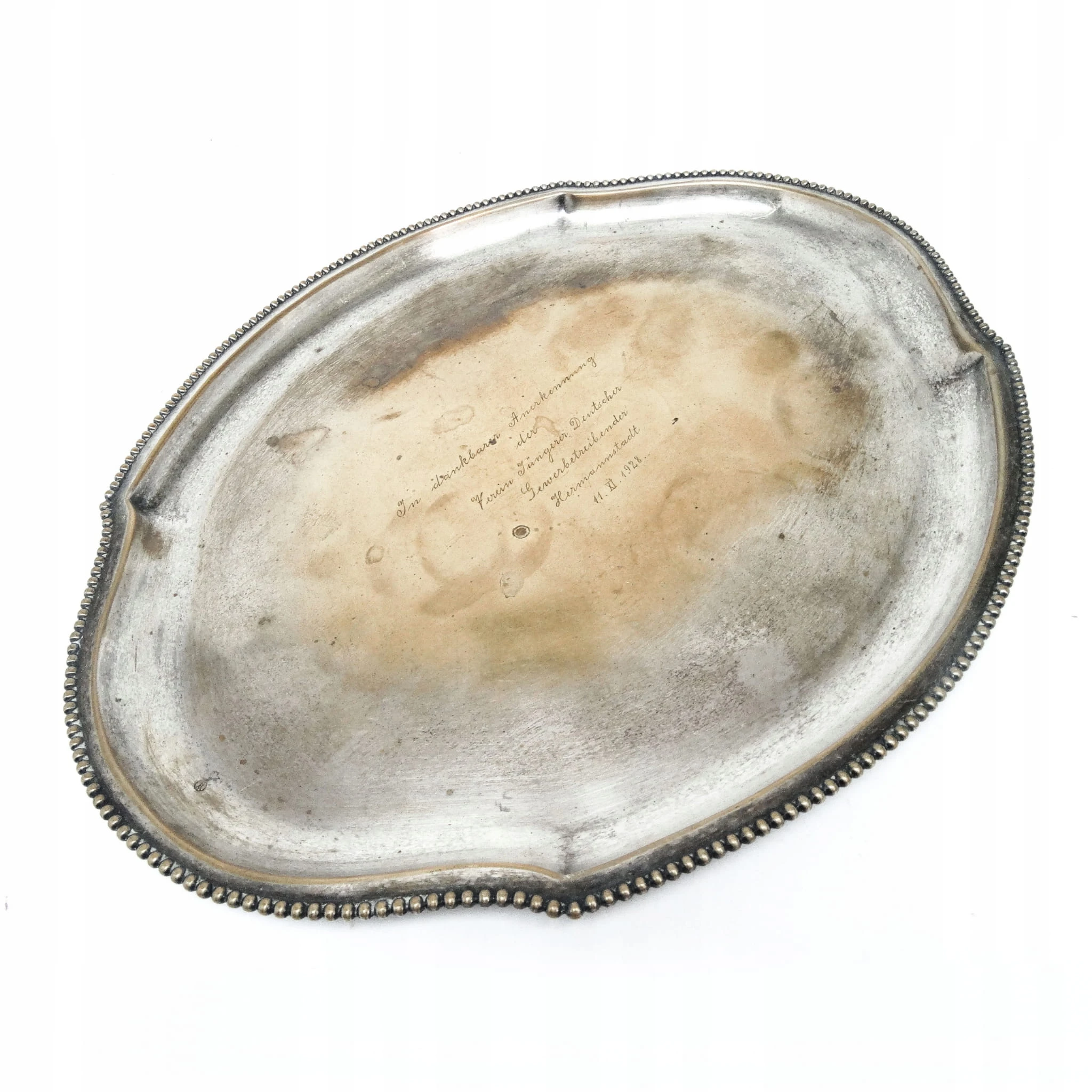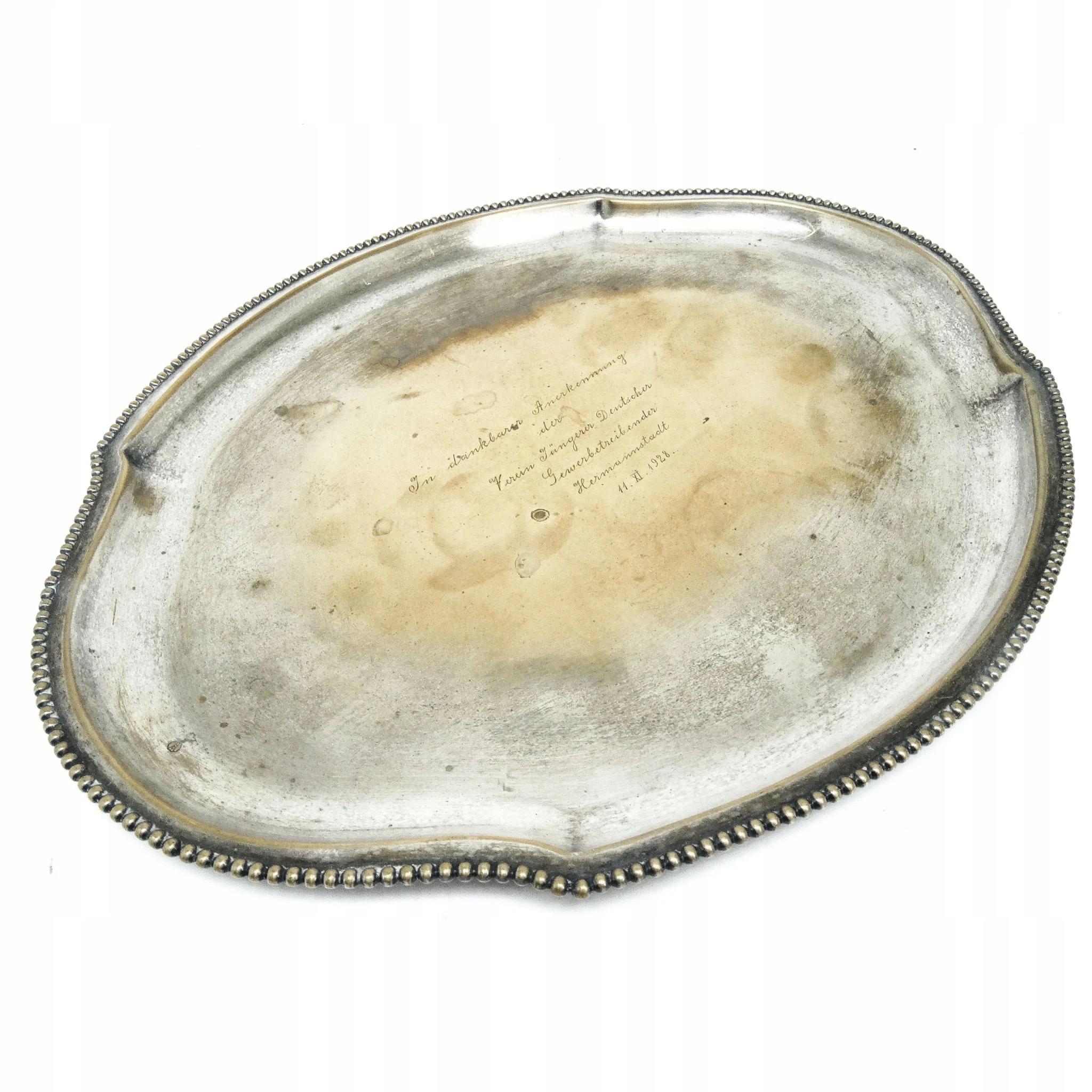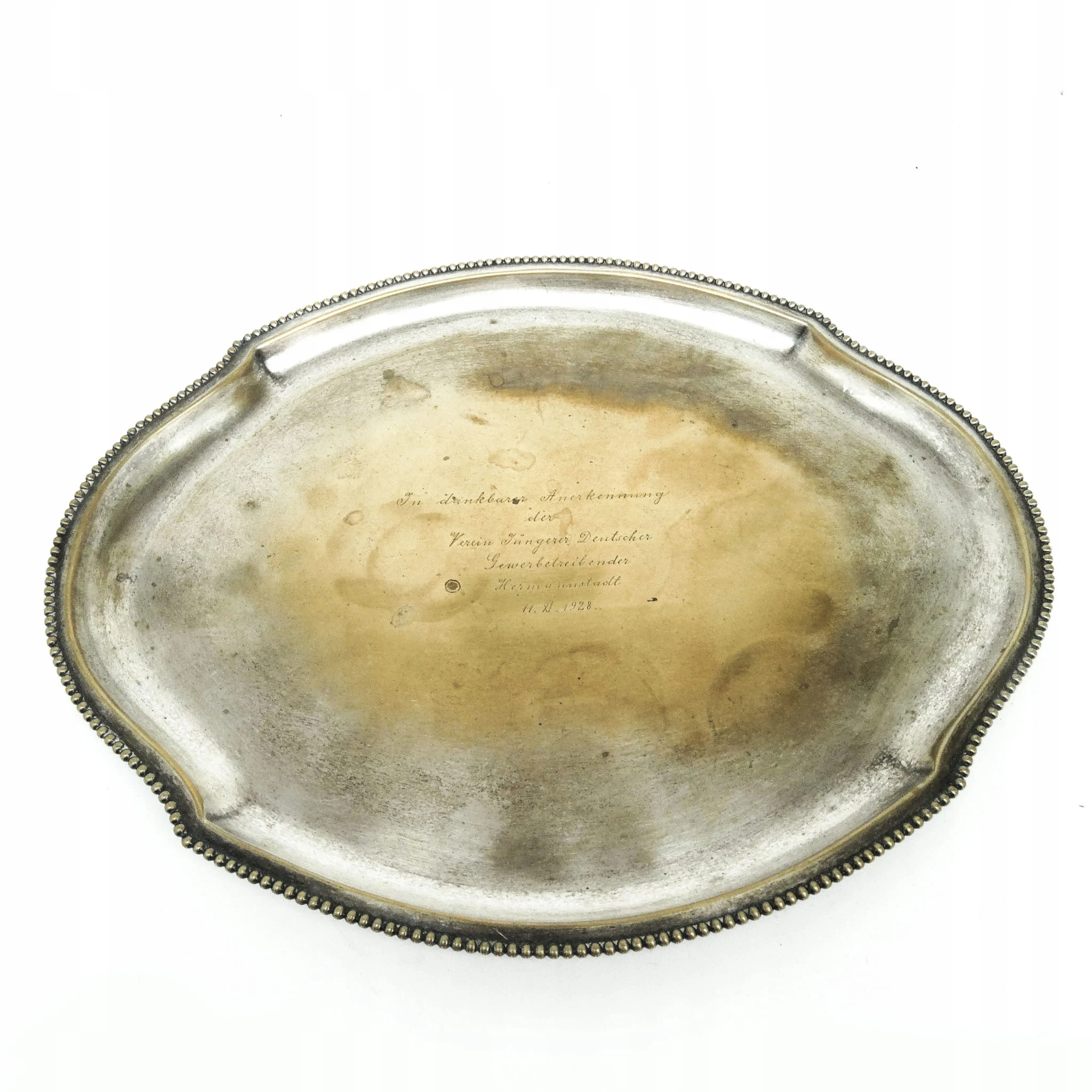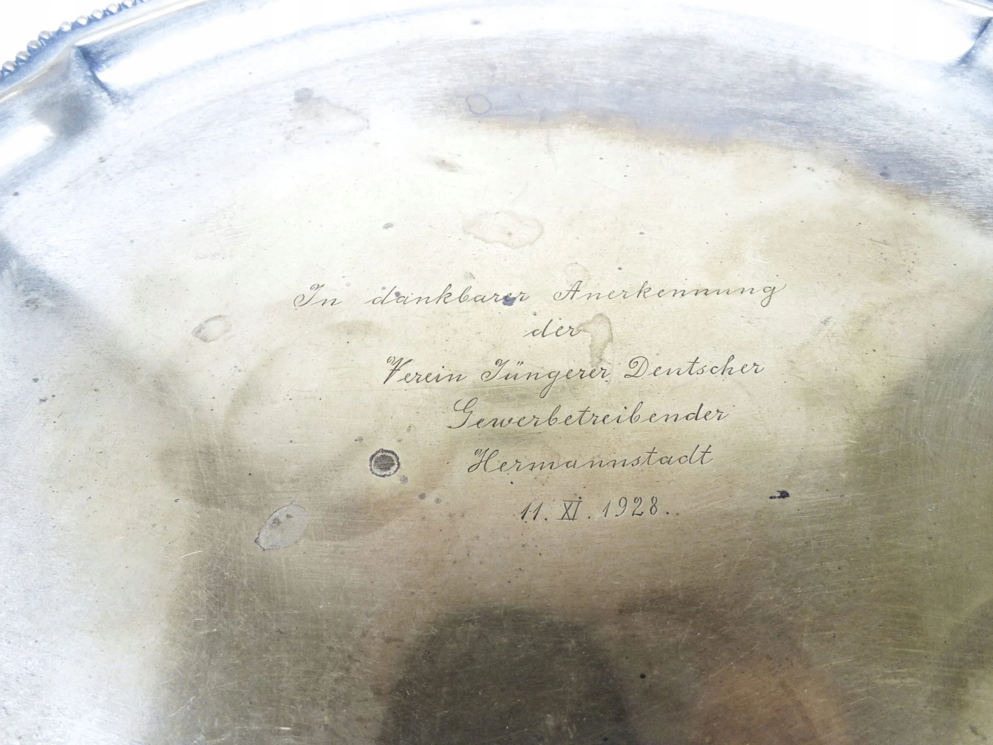 Taca została pochodzi z lat 1900-1910. Została wyprodukowana przez wytwórnię Szandrik. Sygnowana. Stan dobry. Posiada grawerunek : "In dankbarer Anerkennung der Verein Jüngerer Deutscher Gewerbetreibender Hermannstadt 11 XI 1928" ( W dziękczynnym uznaniu od Stowarzyszenia Młodszych Niemieckich Rzemieślników - (miasto) Hermannstadt 11 XI 1928)