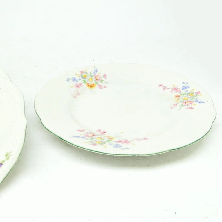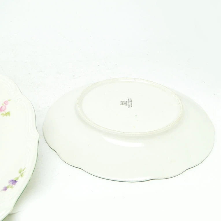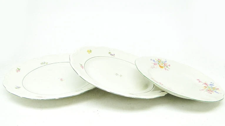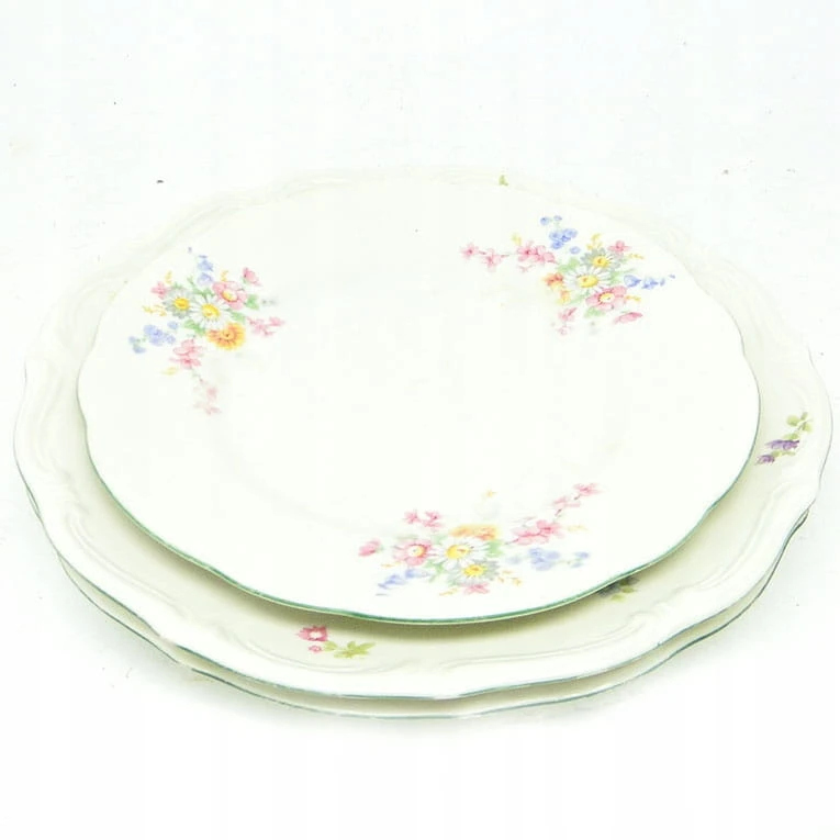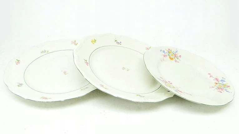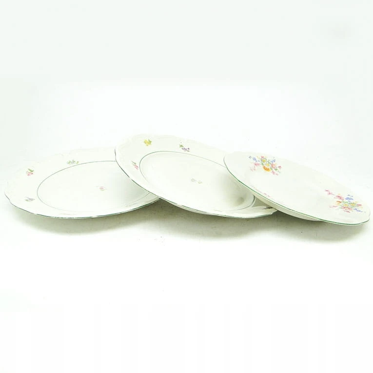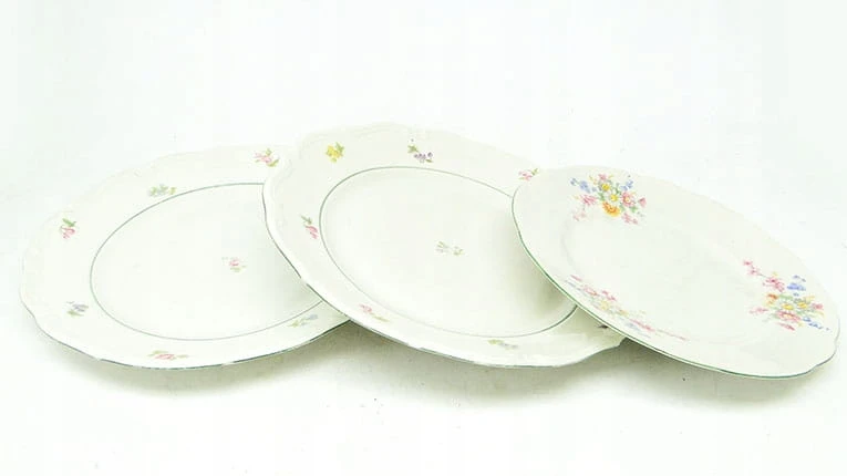 Zestaw 3 talerzy został wykonany z porcelany w Polsce w Wałbrzychu. Pochodzi z lat 40. Sygnowany Tielsch - oznaczenie używane było do połowy lat 50. Stan dobry .