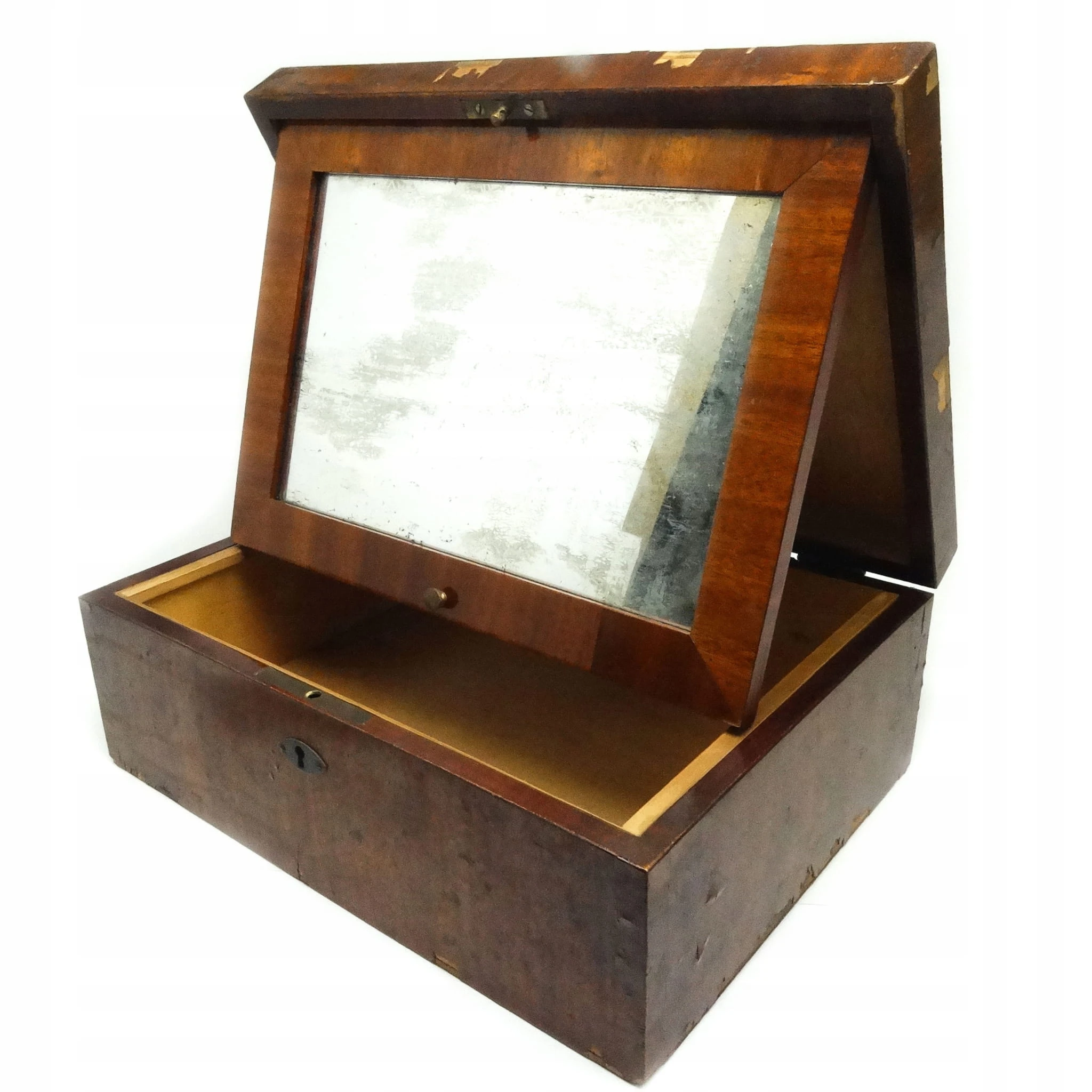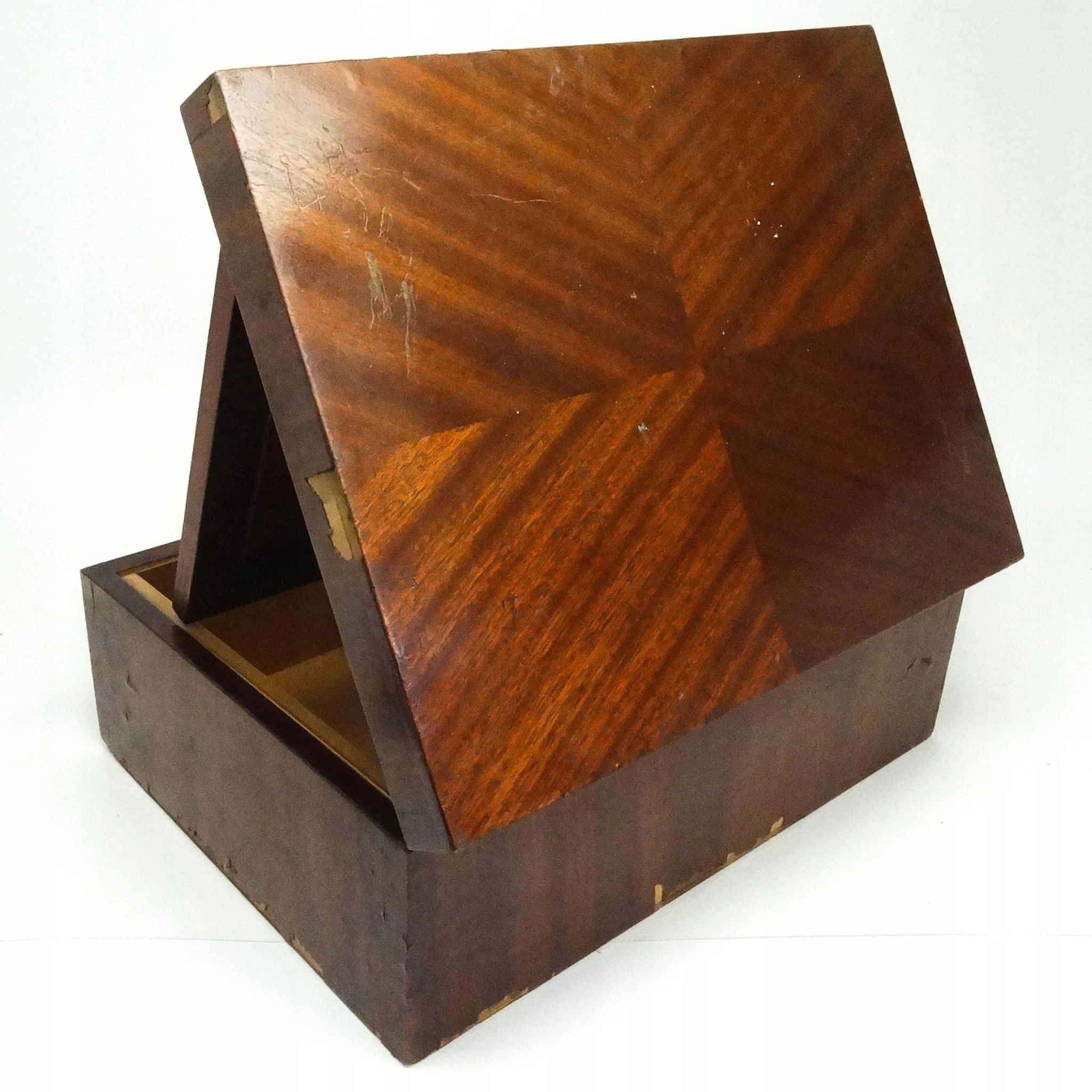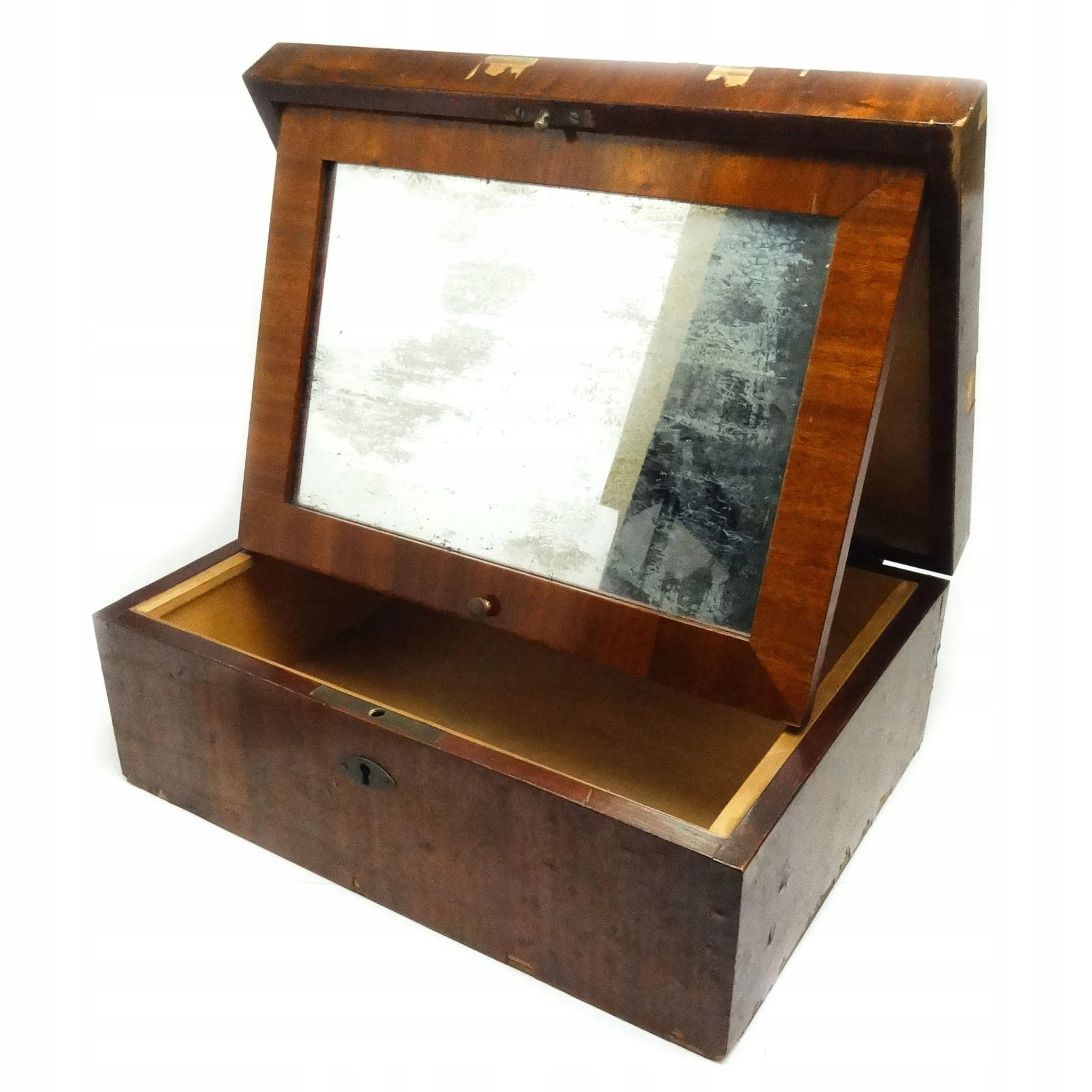 Kaseta na pierścionki i kolczyki wykonana z drewna, odpryski, wewnętrzne zapruszenia na tafli lustra