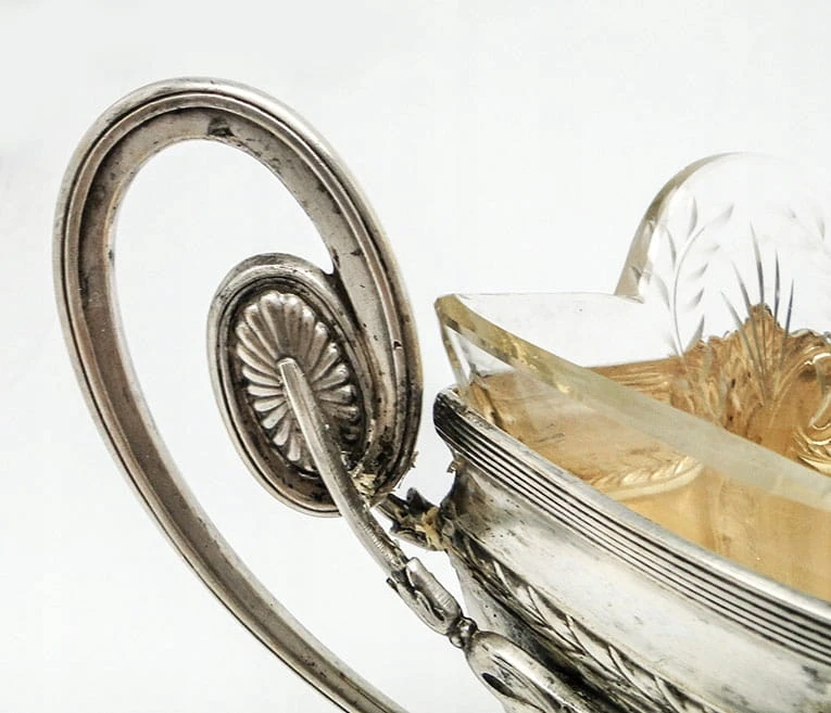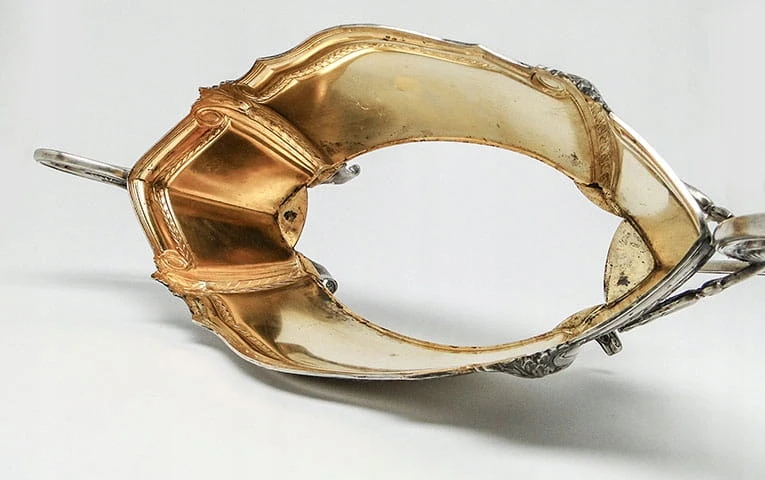 wzorzystymi uchwytami oraz ornamentami wytłoczonymi na grubym metalu, gdzie jednocześnie zachowano bardzo dużą staranność i dbałość o szczegóły oddając styl klasycystyczny. Żadniera posiada także wkład i to nie byle jaki. Jest on wykonany ze szkła szlifowanego i grawerowanego. Spód wkładu jest piaskowany.