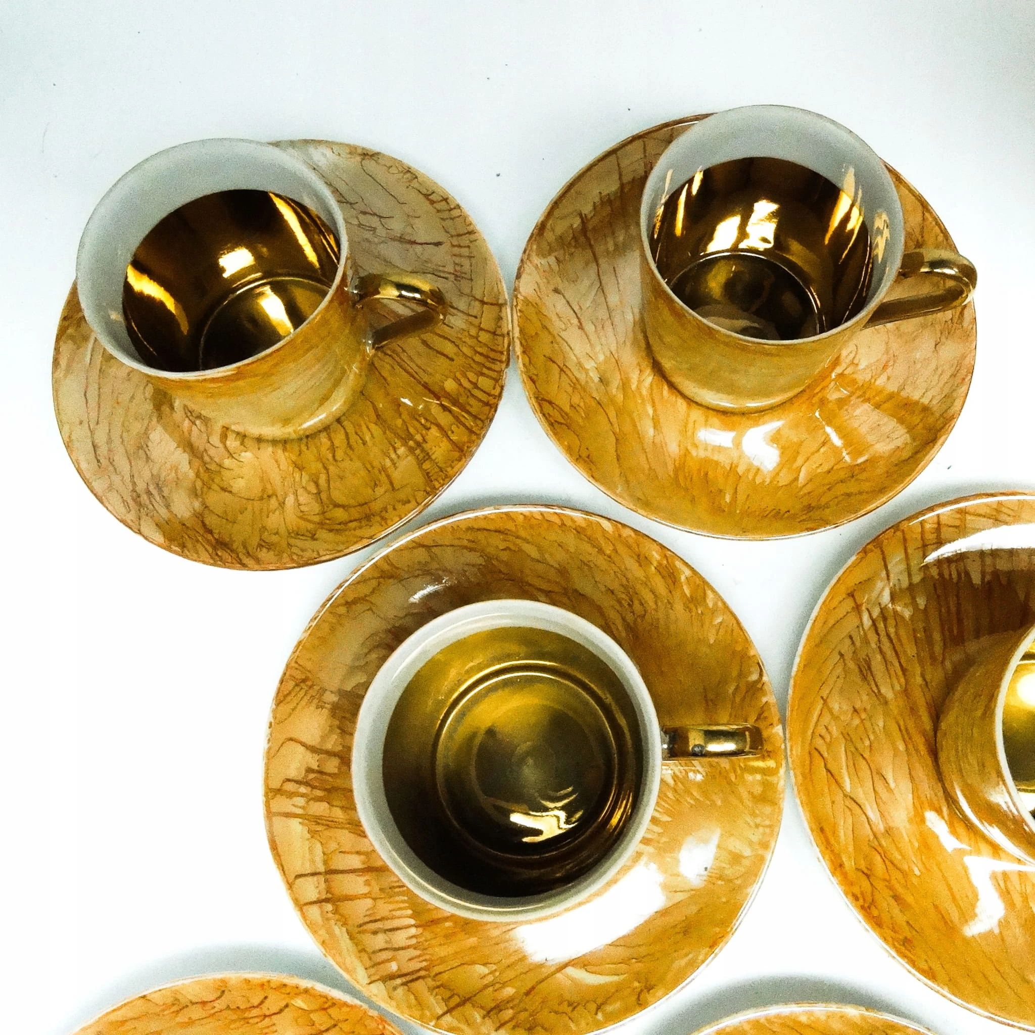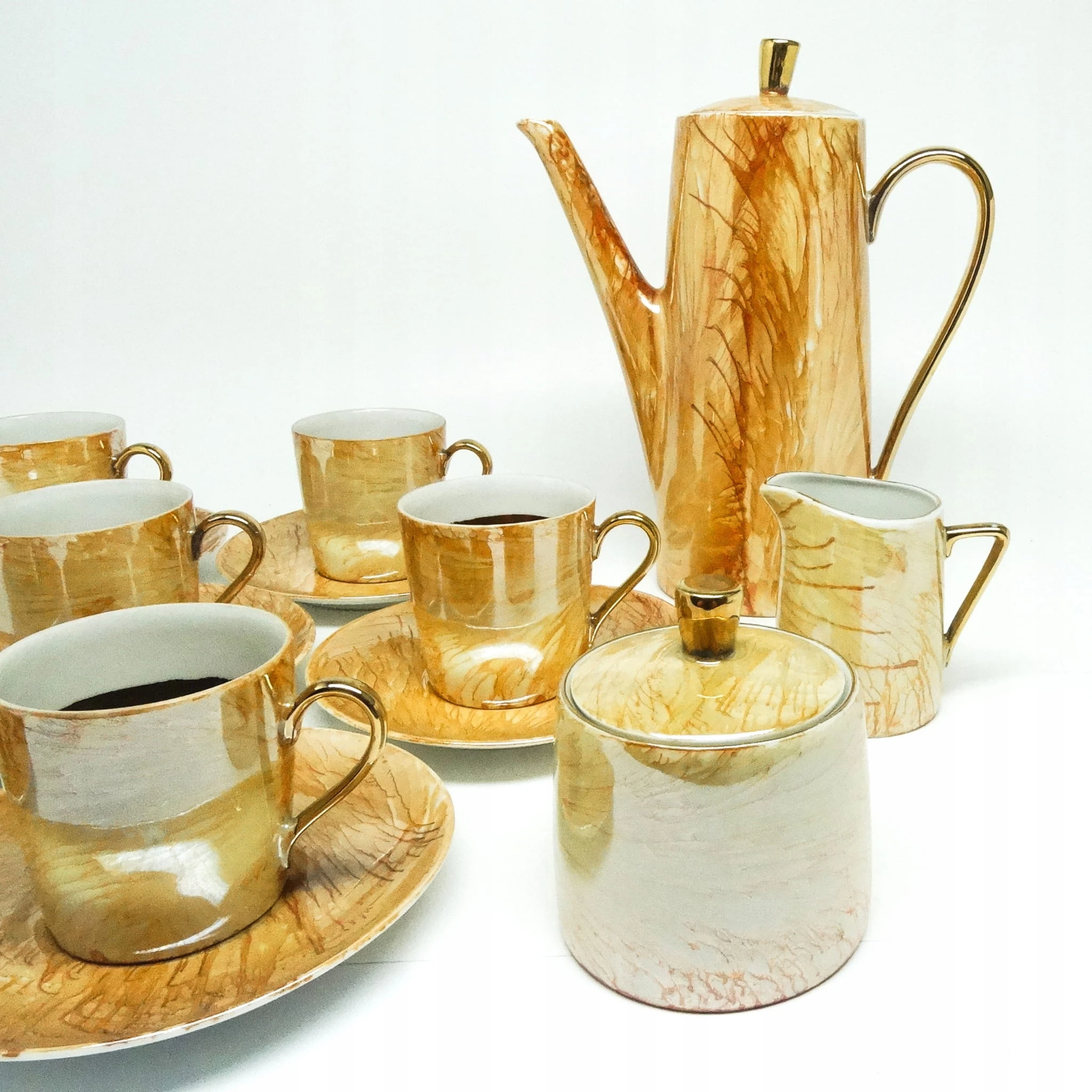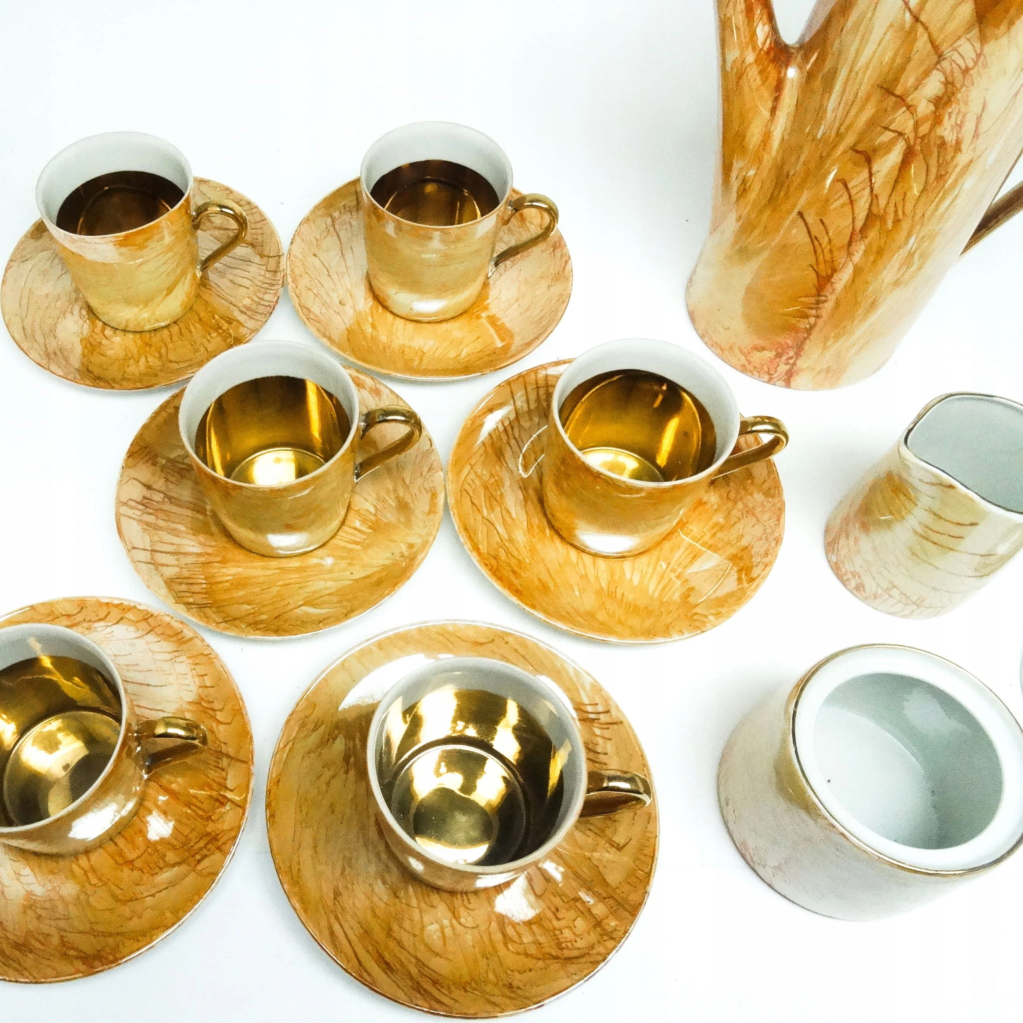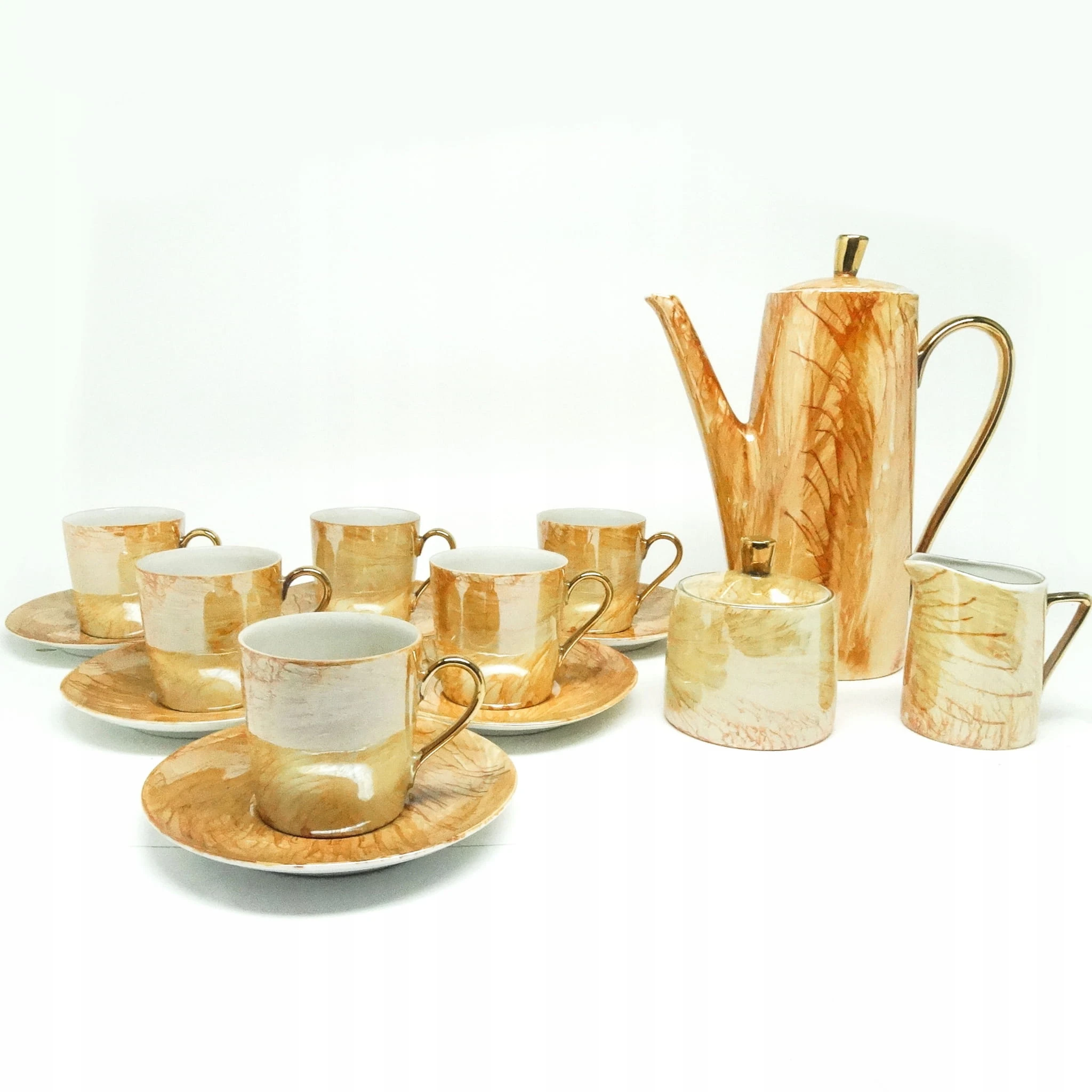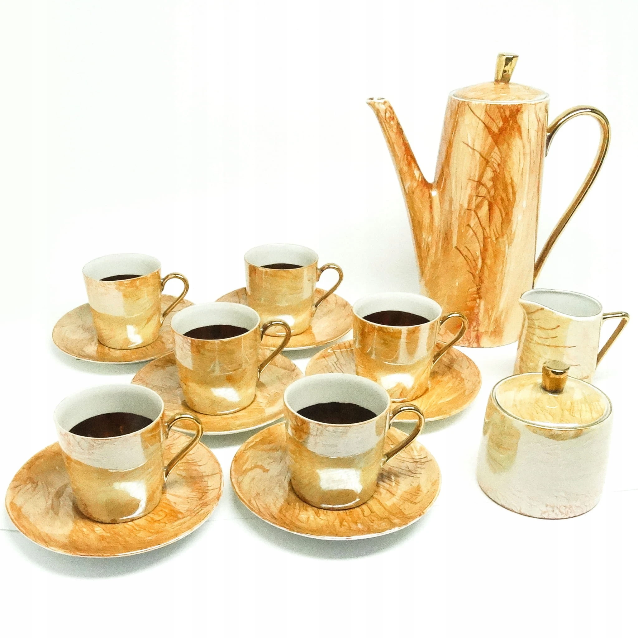 dzbanek wys 22,5 cm 6 x filiżanka wys 6,5 cm średnica 8 cm , 6 x podstawek średnica 14 cm , cukiernica wys z pokrywką 9,5 cm średnica 9 cm , mlecznik wys 8,5 cm