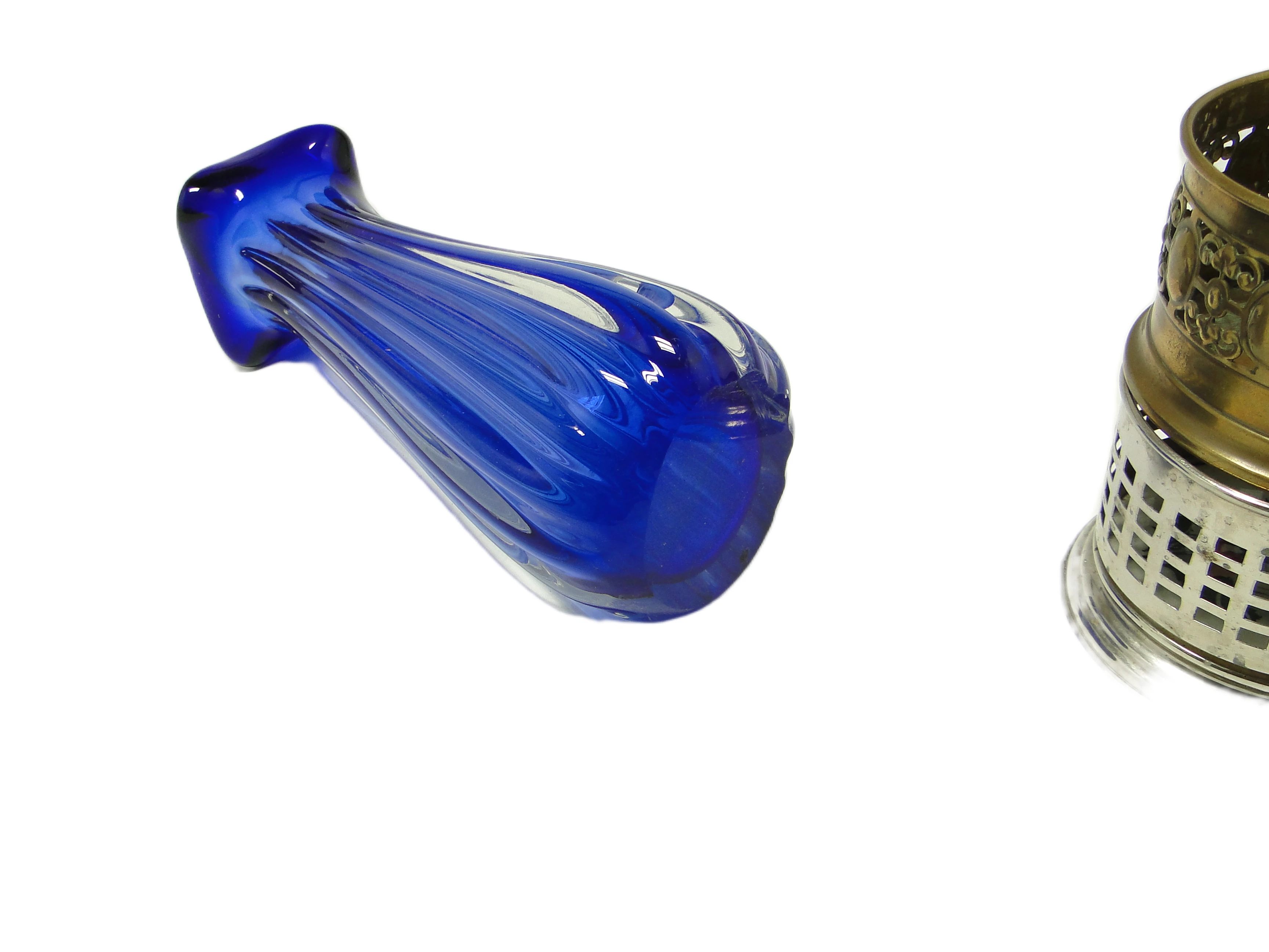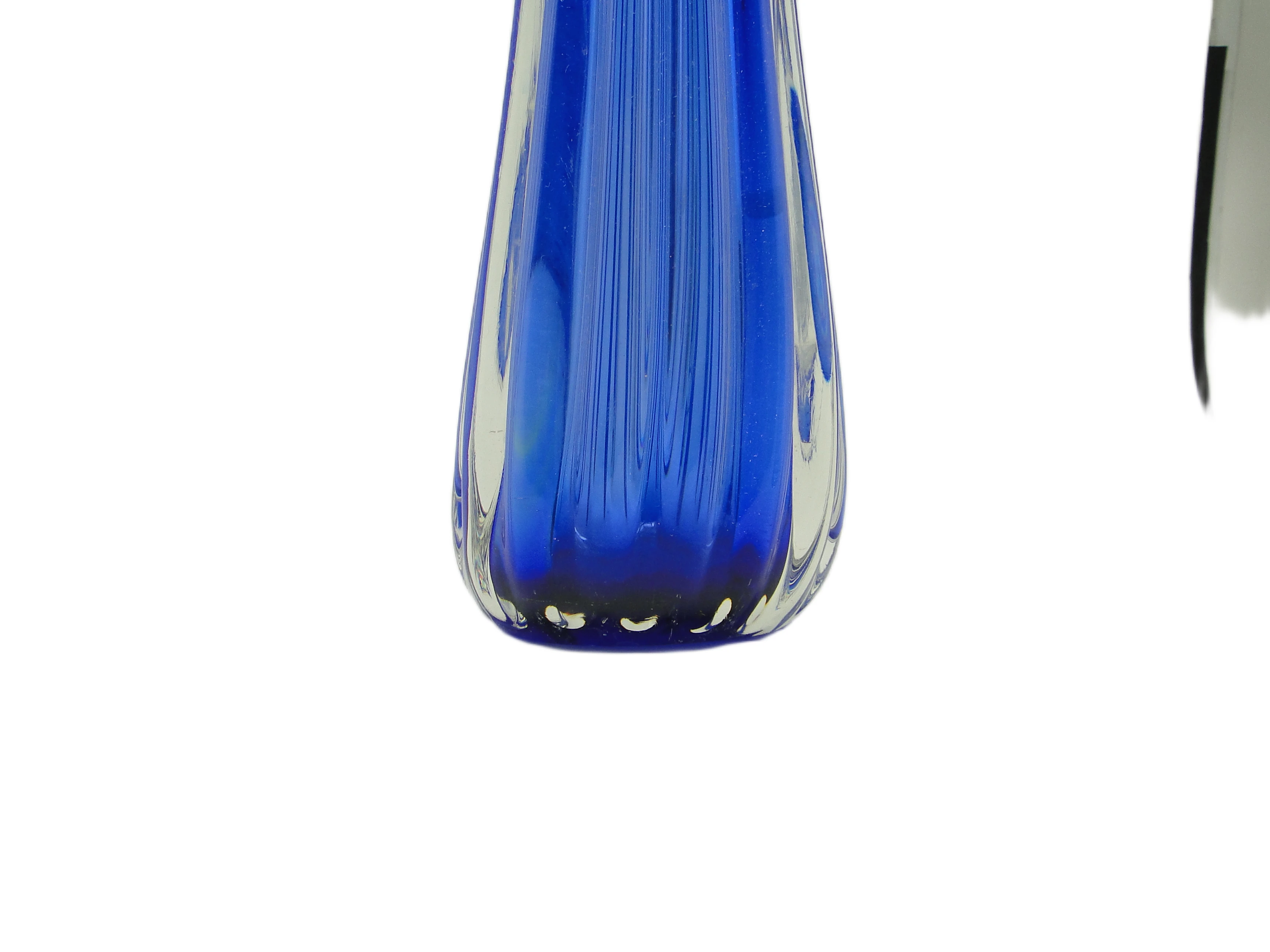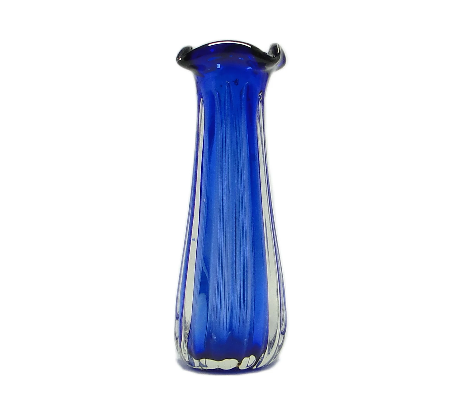 Wazon projektu Josefa Hospodki z lat 60. to przykład czeskiego szkła artystycznego w duchu mid-century modern. Został wykonany z grubego, masywnego szkła o nasyconym, kobaltowym odcieniu, który subtelnie przechodzi w przezroczystość przy podstawie, tworząc efekt ombré. Powierzchnię zdobią pionowe żłobienia, wydłużające optycznie formę i podkreślające jej rzeźbiarski charakter. Górna krawędź wazonu została uformowana w cztery dynamicznie wygięte punkty, nadając całości organiczny, niemal ekspresyjny wygląd, charakterystyczny dla projektów Hospodki. Wazon cechuje się wysokim połyskiem, gładkością i znacznym ciężarem, co świadczy o kunszcie rzemieślniczym czeskiej huty szkła. Wazon zachowany jest w bardzo dobrym stanie, bez uszkodzeń czy śladów renowacji; obecne są wyłącznie drobne oznaki upływu czasu typowe dla oryginalnych przedmiotów vintage.W tej formie pobrzmiewa głos lat 60., gdy czeskie szkło eksperymentowało ze światłem, kolorem i plastycznością. Cobaltowa głębia pochłania światło, a przezroczystość podstawy pozwala na subtelne refleksy, jakby szkło zatrzymało w sobie ruch i energię epoki. Dynamicznie wygięte krawędzie przywodzą na myśl falę lub rozwijający się pąk, sugerując poszukiwanie ekspresji i swobody w materiale. To przedmiot, który – choć użytkowy – nie ukrywa swoich artystycznych ambicji, a każdy detal zdradza fascynację eksperymentem i nowoczesną estetyką.Wazon można wyeksponować solo na dębowej konsoli lub niskiej komodzie, gdzie nasycony kobalt podkreśli strukturę naturalnego drewna. Sprawdzi się także w aranżacjach mid-century modern, w sąsiedztwie ceramiki w neutralnych barwach lub geometrycznych grafik. Można go zestawić z minimalistyczną rzeźbą, pojedynczą gałęzią lub szklaną tacą, by wydobyć jego rzeźbiarską formę. Dobrze odnajdzie się zarówno w eklektycznych, kolekcjonerskich wnętrzach, jak i w nowoczesnych przestrzeniach z przewagą jasnych powierzchni.