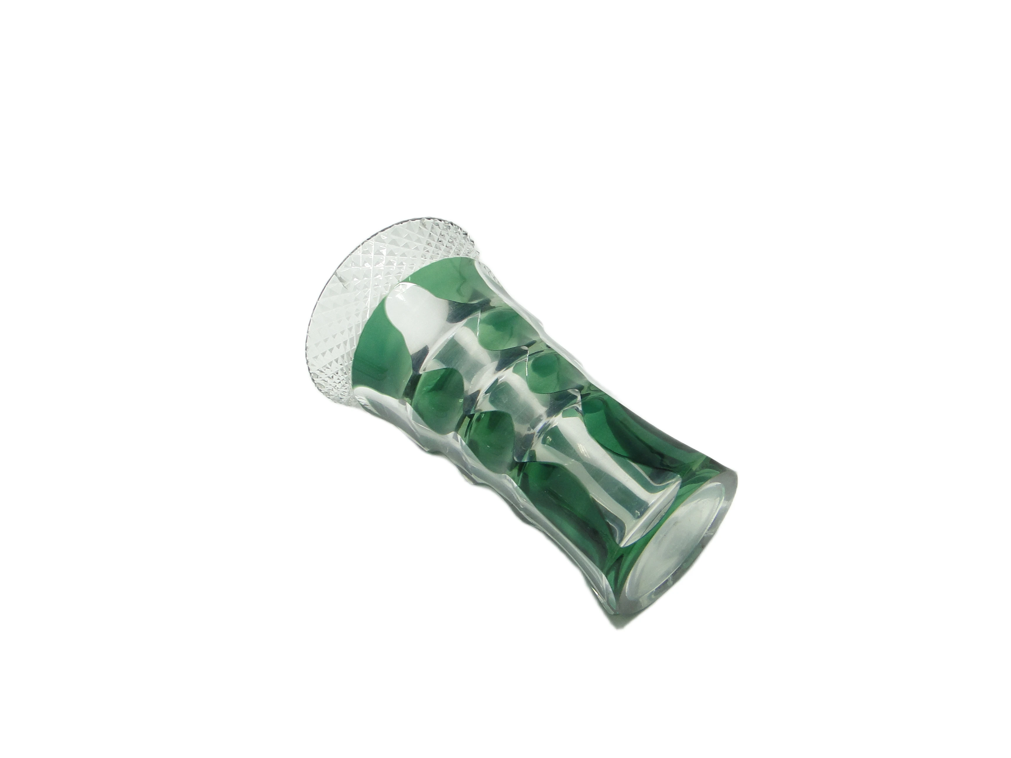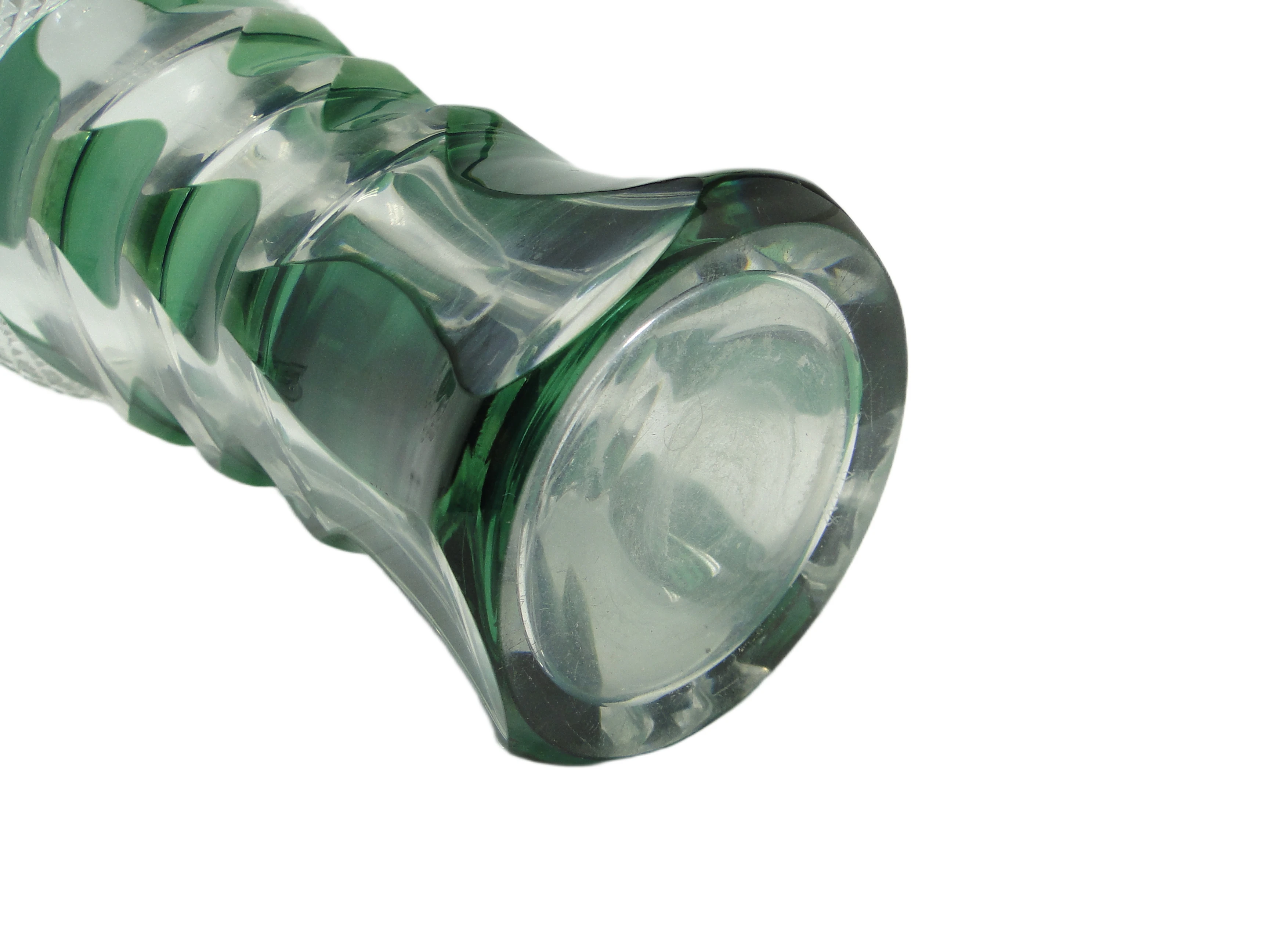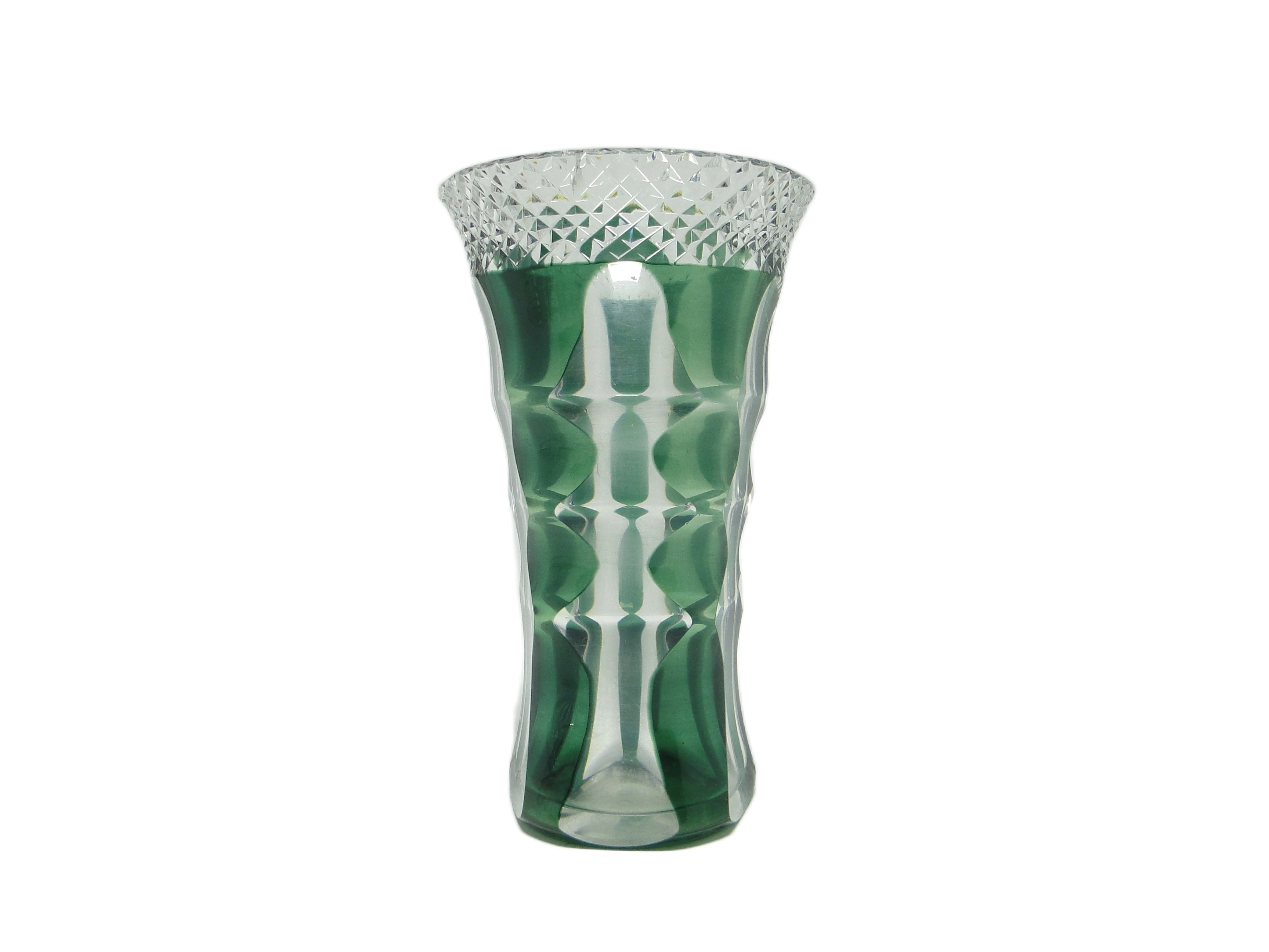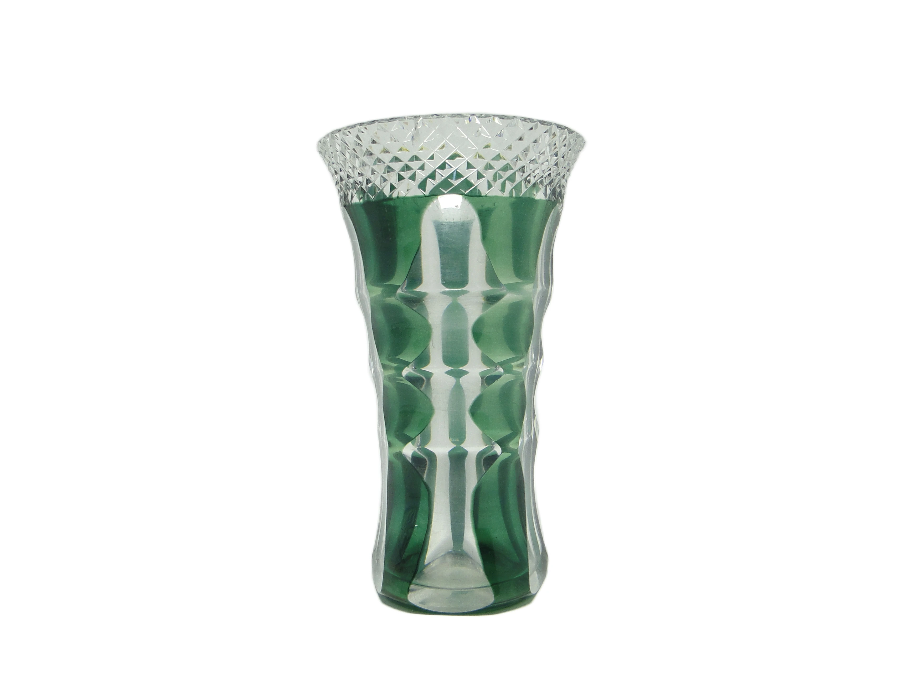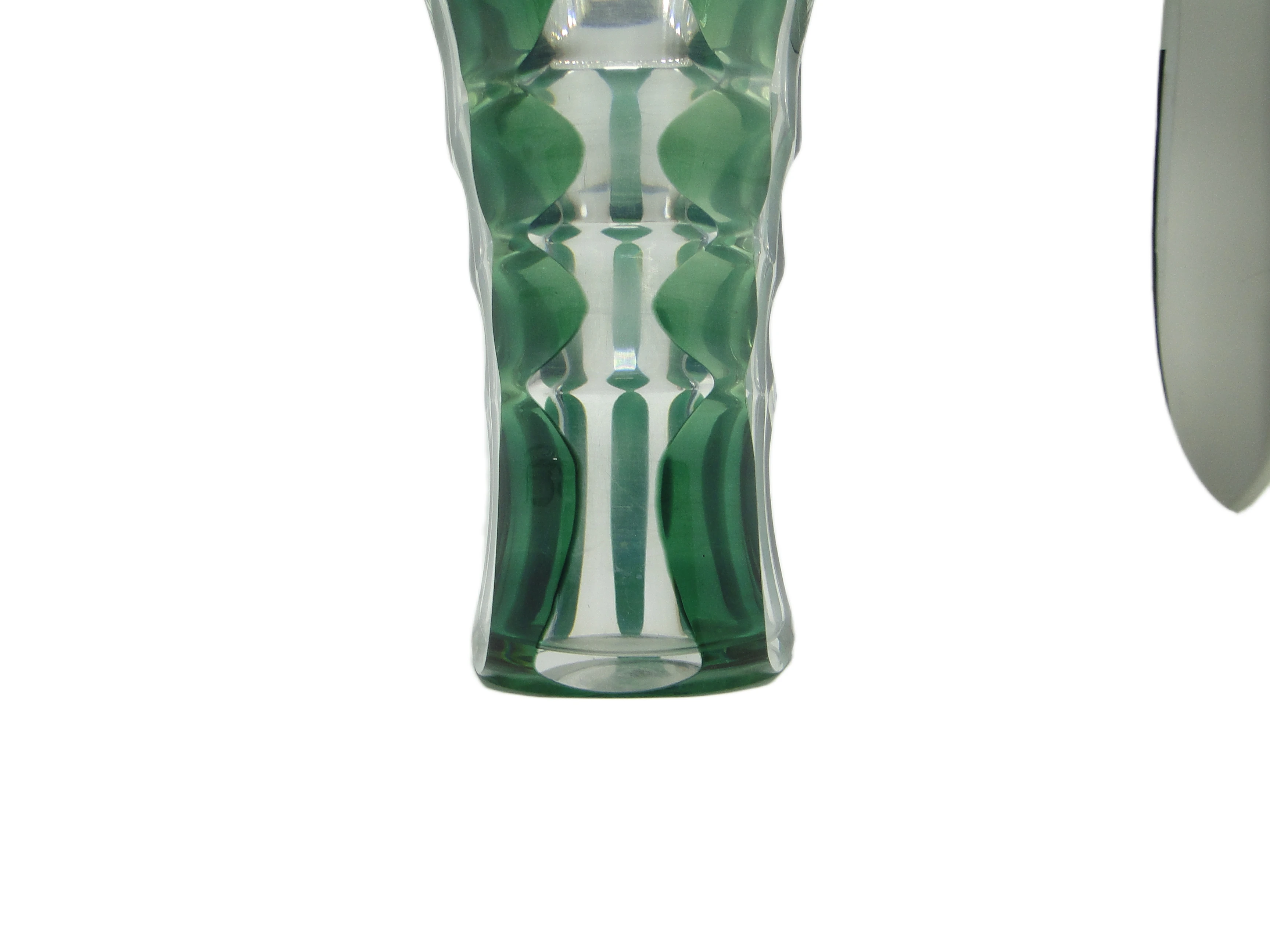 Wazon w stylu Art Deco, wykonany w Niemczech w latach 50., uformowano z grubego, półprzezroczystego szkła o chłodnej, umiarkowanie nasyconej zieleni. Smukła, wysoka sylwetka z lekko rozchylonym wylotem zyskuje dynamikę dzięki głębokim, pionowym fasetowaniom, które tworzą rytmiczną grę światła i cienia. Górna krawędź dekorowana jest wyraźnym, diamentowym szlifem – detalem nie tylko wizualnym, ale i wyczuwalnym w dotyku, kontrastującym z gładkością pozostałej powierzchni. Całość zachowuje proporcje typowe dla powojennego modernizmu, a błyszczące szkło podkreśla klarowność i głębię koloru. Wazon nie posiada dodatkowych okuć, został wykonany w całości ze szkła. Stan określany jest jako wysłużony: na rancie widoczny jest niewielki odprysk, na dnie – osad; nie widać poważniejszych uszkodzeń ani śladów napraw.Forma tego wazonu przywołuje głos lat 50., kiedy geometria i surowość modernizmu współistniały z subtelną dbałością o detal. Chłodna zieleń szkła przypomina atmosferę powojennych niemieckich wnętrz, w których prostota była synonimem nowoczesności, a drobne ozdoby – jak diamentowy szlif na rancie – świadczyły o szacunku dla rzemiosła. Wazon opowiada historię codziennych przedmiotów, które z biegiem lat stają się małymi świadkami zmieniających się gustów i nawyków, a ślady użytkowania podkreślają ich autentyczność i długą obecność w domowej scenerii.Wazon można zestawić z prostymi meblami z drewna lub metalu, by wyeksponować jego geometryczną linię. Dobrze sprawdzi się na komodzie w salonie, w towarzystwie jasnych, minimalistycznych dodatków lub pojedynczej gałązki; można połączyć go z ceramiką o gładkich powierzchniach, by wydobyć kontrast faktur. Odpowiedni będzie zarówno dla wnętrz w duchu mid-century modern, jak i eklektycznych kolekcji czy spokojnych przestrzeni vintage, gdzie stanie się subtelnym, lecz wyrazistym akcentem.