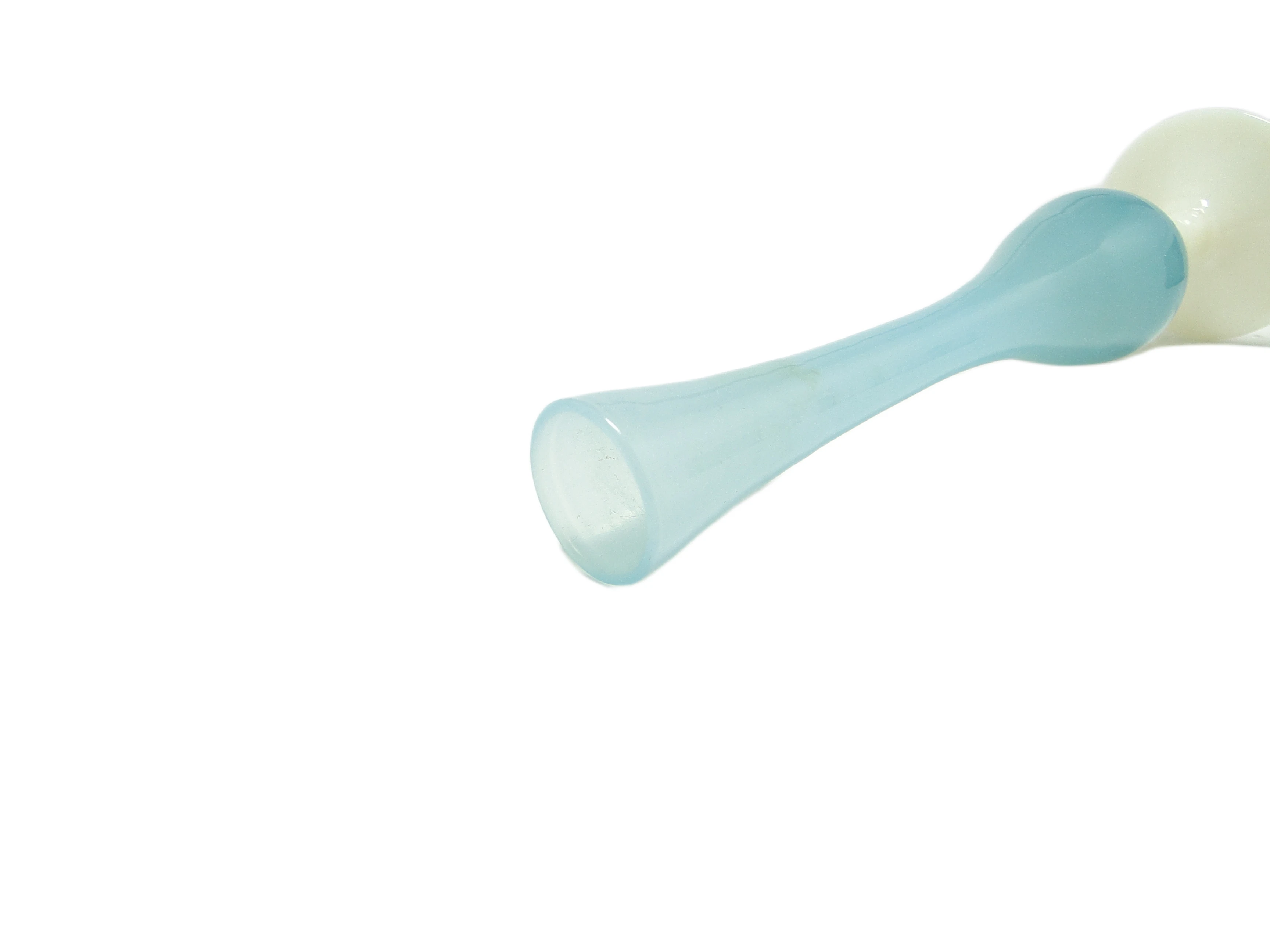 Wazon „Fiorentina” powstał w latach 50. we włoskiej hucie szkła, reprezentując estetykę mid-century modern. Wysoka, smukła sylweta z pękatą dolną częścią płynnie przechodzi w długą, wąską szyjkę, a szeroka, zaokrąglona podstawa zapewnia stabilność. Subtelny pastelowy błękit o chłodnym tonie łagodnie przechodzi w mlecznobiały kolor przy stopie, tworząc elegancki gradient w ręcznie dmuchanym szkle. Matowa, aksamitna powierzchnia pozbawiona połysku oraz drobne różnice w grubości szkła podkreślają rzemieślniczy charakter i organiczną linię formy. Brak dodatkowych zdobień akcentuje czystość projektu i wyważone proporcje, typowe dla włoskiego modernizmu połowy XX wieku. Wazon nie nosi śladów uszkodzeń ani renowacji – zachowany w bardzo dobrym stanie, z oryginalnym wykończeniem i patyną.Opływowa forma i miękki, pastelowy kolor wazonu przypominają o włoskich latach 50., kiedy szkło stawało się nośnikiem nowoczesnej lekkości. Bryła, jakby opowiadała o czasach fascynacji światłem, czystą linią i mistrzostwem rzemiosła. Matowa powierzchnia łagodnie rozprasza promienie, a błękit przywodzi na myśl poranną mgłę unoszącą się nad Toskanią – każdy detal, od harmonijnej proporcji po aksamitny dotyk szkła, niesie w sobie spokojną pewność epoki, która ceniła balans i precyzję.Wazon można zestawić z innymi dekoracjami z lat 50. lub 60., takimi jak ceramiczne figurki czy minimalistyczne grafiki, by podkreślić ducha mid-century modern. Dobrze sprawdzi się na komodzie z jasnego drewna, gdzie pastelowy błękit wydobędzie piękno naturalnych materiałów. Warto połączyć go z pojedynczą gałązką lub kwiatem o wyrazistej formie, by zachować spójną, oszczędną kompozycję. Wnętrza o stonowanej palecie – biele, szarości, beże – pozwolą wazonowi subtelnie zaistnieć, podczas gdy bardziej eklektyczne otoczenie wydobędzie z niego lekkość włoskiego designu połowy XX wieku.