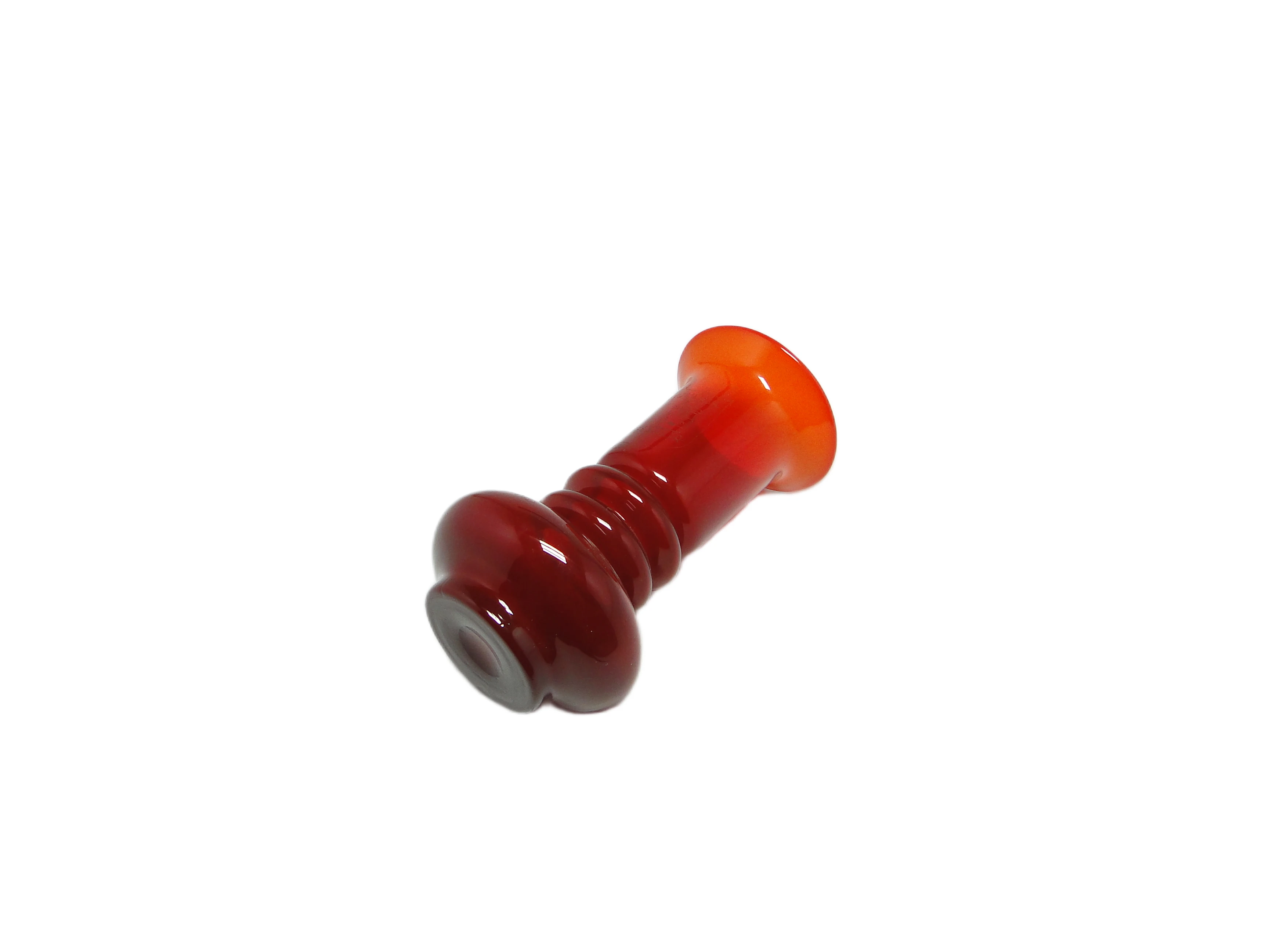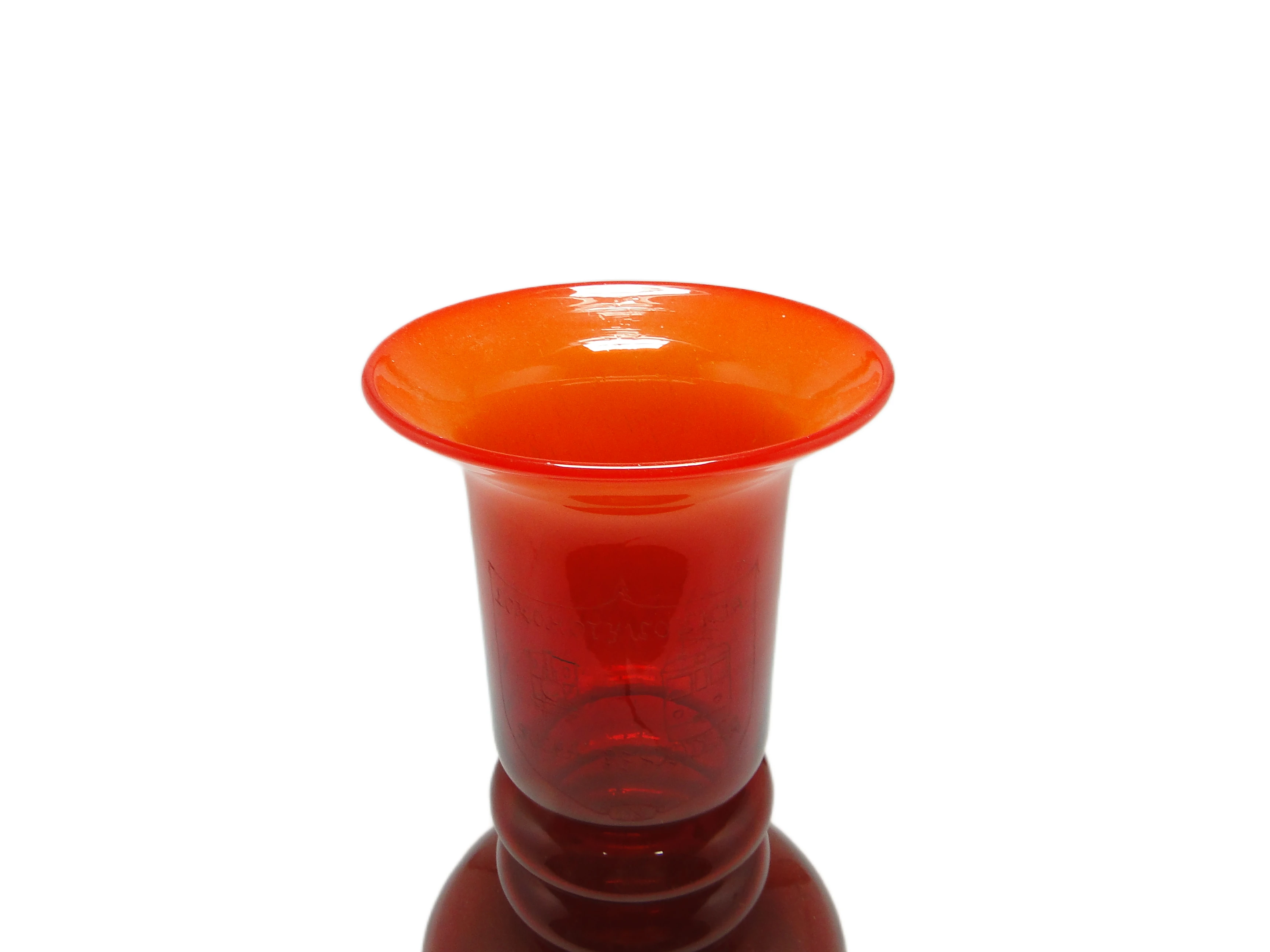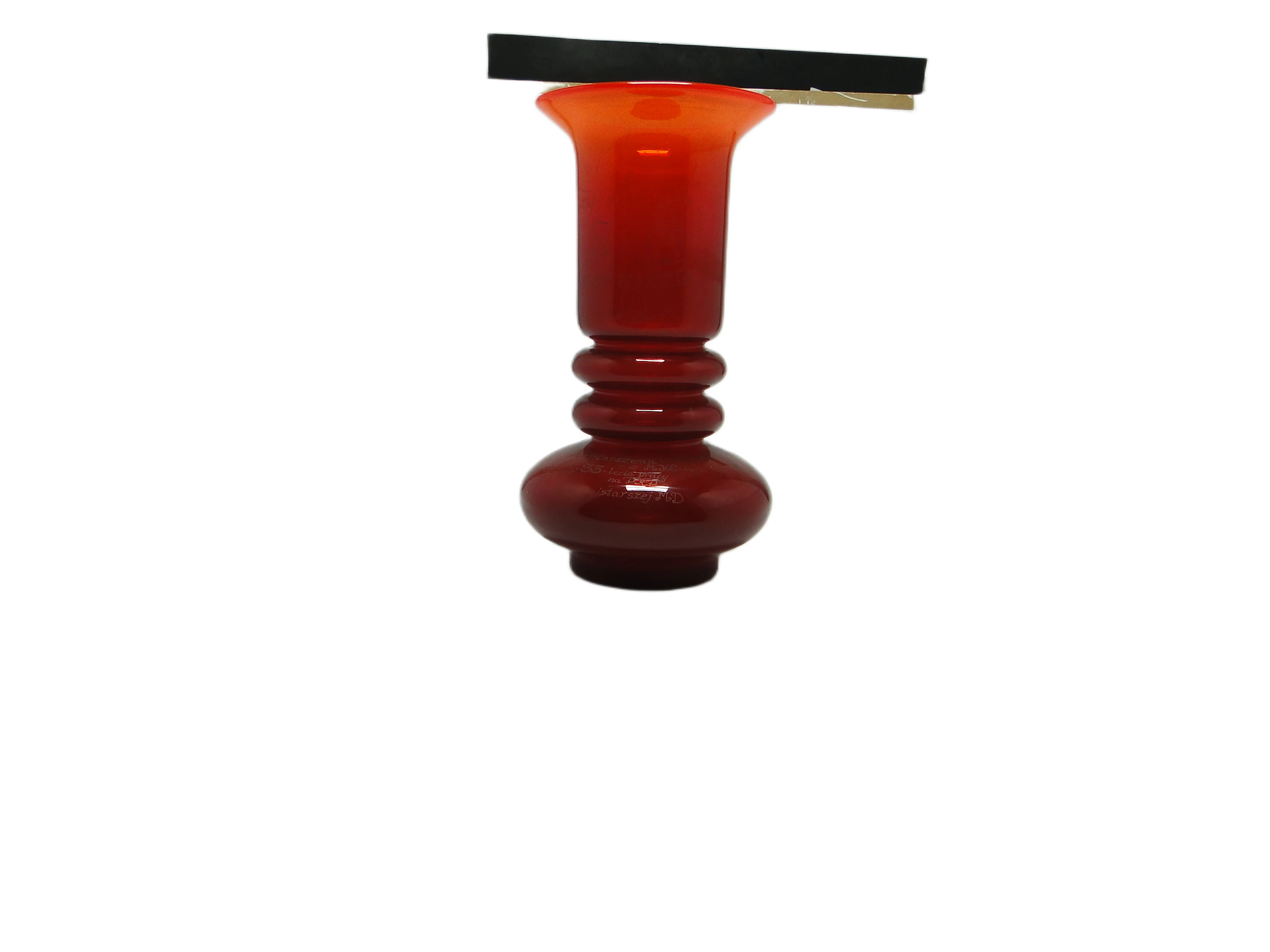 Wazon zaprojektowany przez Ludwika Fiedorowicza dla HSG Tarnowiec w Polsce to charakterystyczny przykład polskiego szkła artystycznego lat 70. Wykonany z grubego, gładkiego szkła w głębokim, nasyconym odcieniu czerwieni, który w górnej partii przechodzi płynnie w jaśniejszy, niemal pomarańczowo-czerwony ton przy rozchylonej krawędzi. Forma wazonu jest rzeźbiarska i geometryczna: szeroka, zaokrąglona podstawa stabilnie wspiera smukłą szyjkę ozdobioną dwiema symetrycznymi, pierścieniowymi wypukłościami, zwieńczoną szerokim, cylindrycznym wylotem. Całość podkreśla lustrzana, jednolita powierzchnia bez dodatkowych dekoracji, uchwytów czy okuć. Proporcje są harmonijne, a masa szkła wyczuwalna zarówno wizualnie, jak i w dotyku. Wazon zachowany w dobrym stanie vintage, z jedynie minimalnymi śladami użytkowania typowymi dla wieku. Połysk powierzchni został dobrze zachowany, brak wyszczerbień i pęknięć.Ten wazon niesie w sobie głos lat 70. – czasów, gdy polskie wzornictwo eksperymentowało z nasyceniem koloru i prostotą formy, szukając światła w codzienności PRL-u. Czerwień, która dominuje w materiale, przywołuje optymizm i energię epoki, a pierścieniowe detale w szyjce przypominają o kunszcie rzemieślniczym i wyczuciu proporcji. To przedmiot, który nawet stojąc pusty, odbija otoczenie i wpuszcza do wnętrza subtelny ruch barwy oraz światła.Wazon można zestawić z meblami z drewna o prostych liniach typowych dla mid-century modern lub postawić na niskiej komodzie fornirowanej, by podkreślić głębię jego koloru. Dobrze sprawdzi się jako solista na tle jasnej ściany, a także w towarzystwie minimalistycznych dekoracji: pojedynczej gałązki, grafiki w czarnej ramie czy ceramiki o matowym wykończeniu. We wnętrzach kolekcjonerskich, eklektycznych i tych inspirowanych vintage wazon może stanowić wyrazisty, rzeźbiarski akcent.