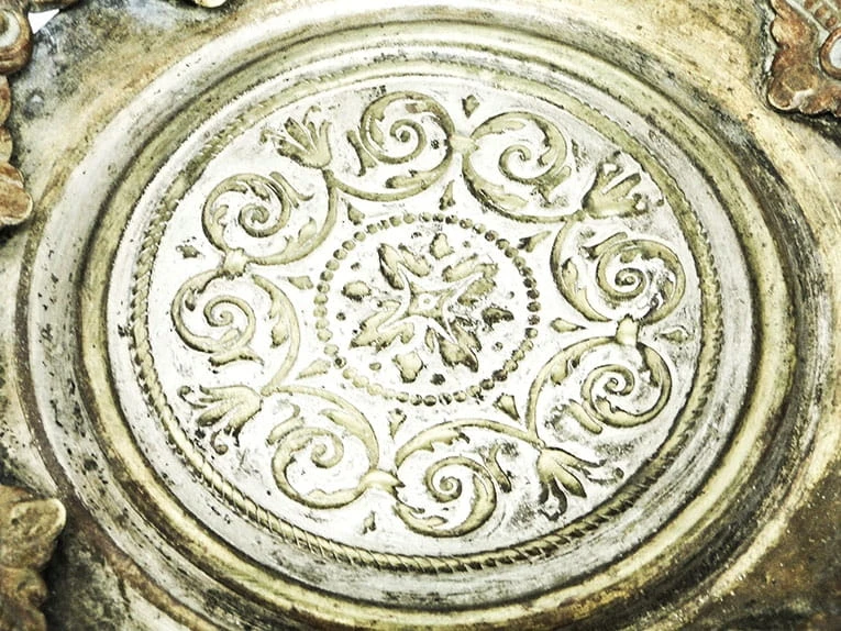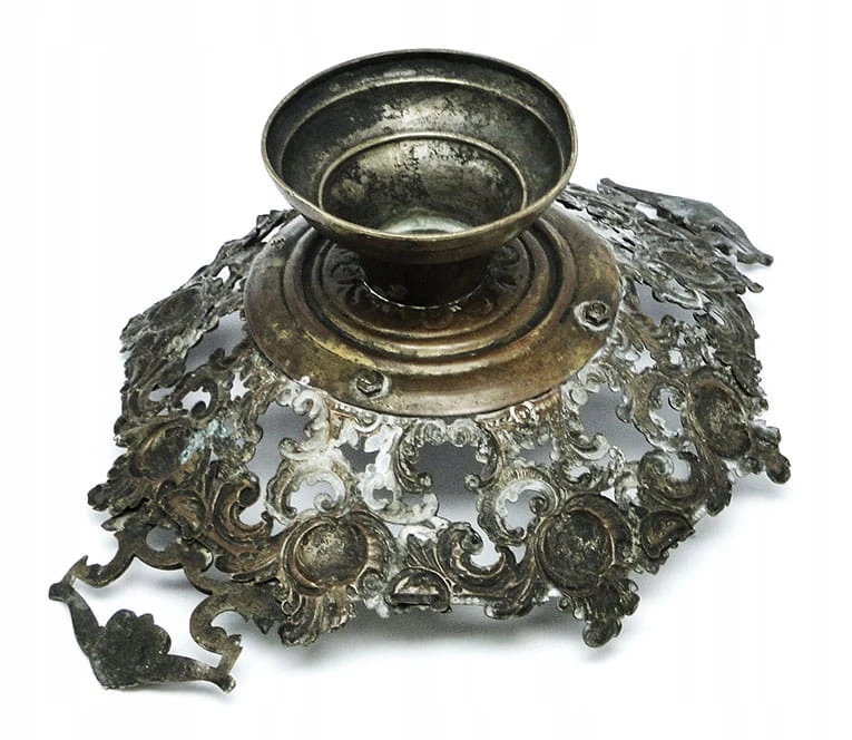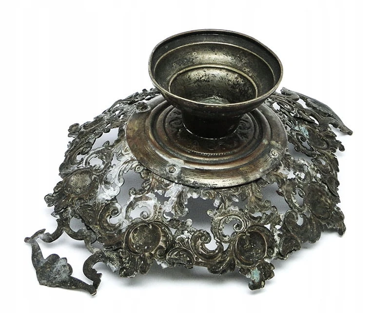 Charakteryzuje się obfitymi kwiatowymi i roślinnymi zdobieniami, które tworzą kosz. Na spodzie znajduje się stopka.