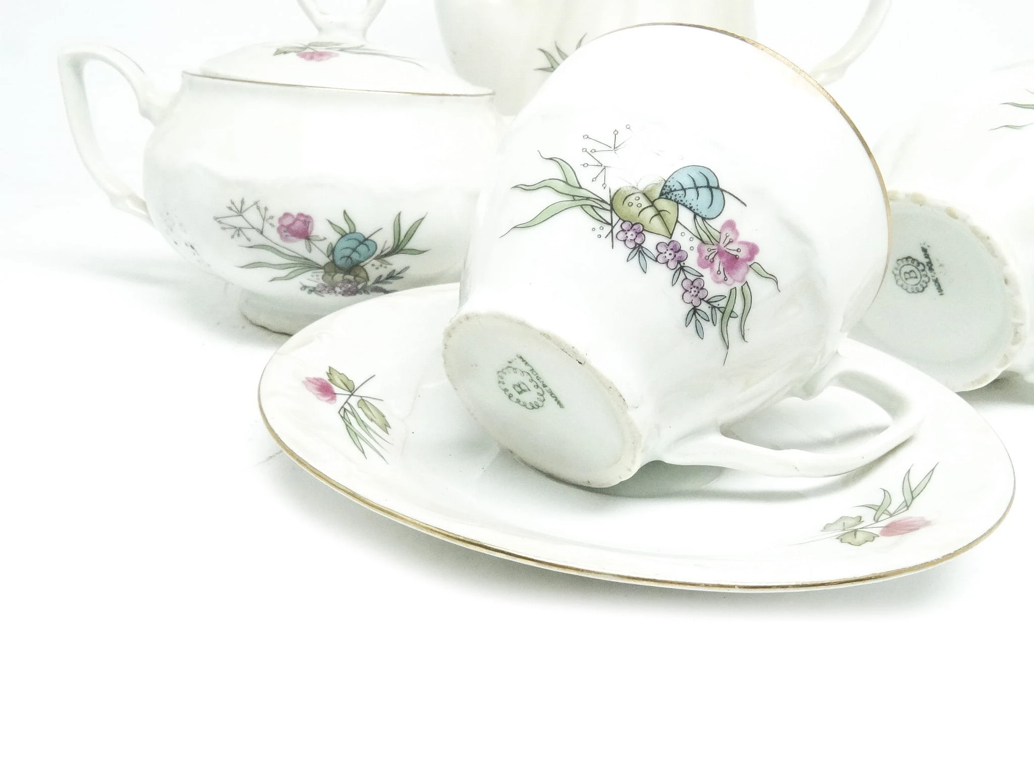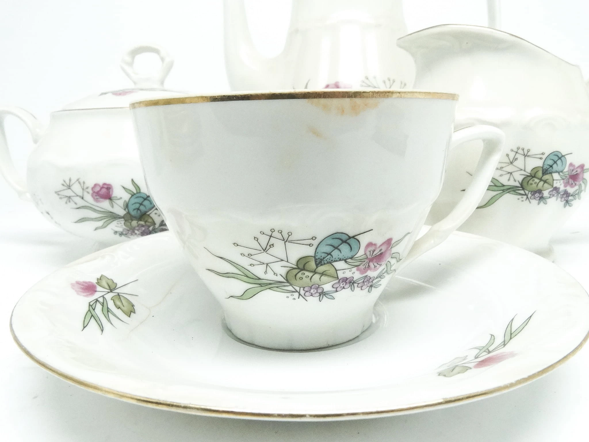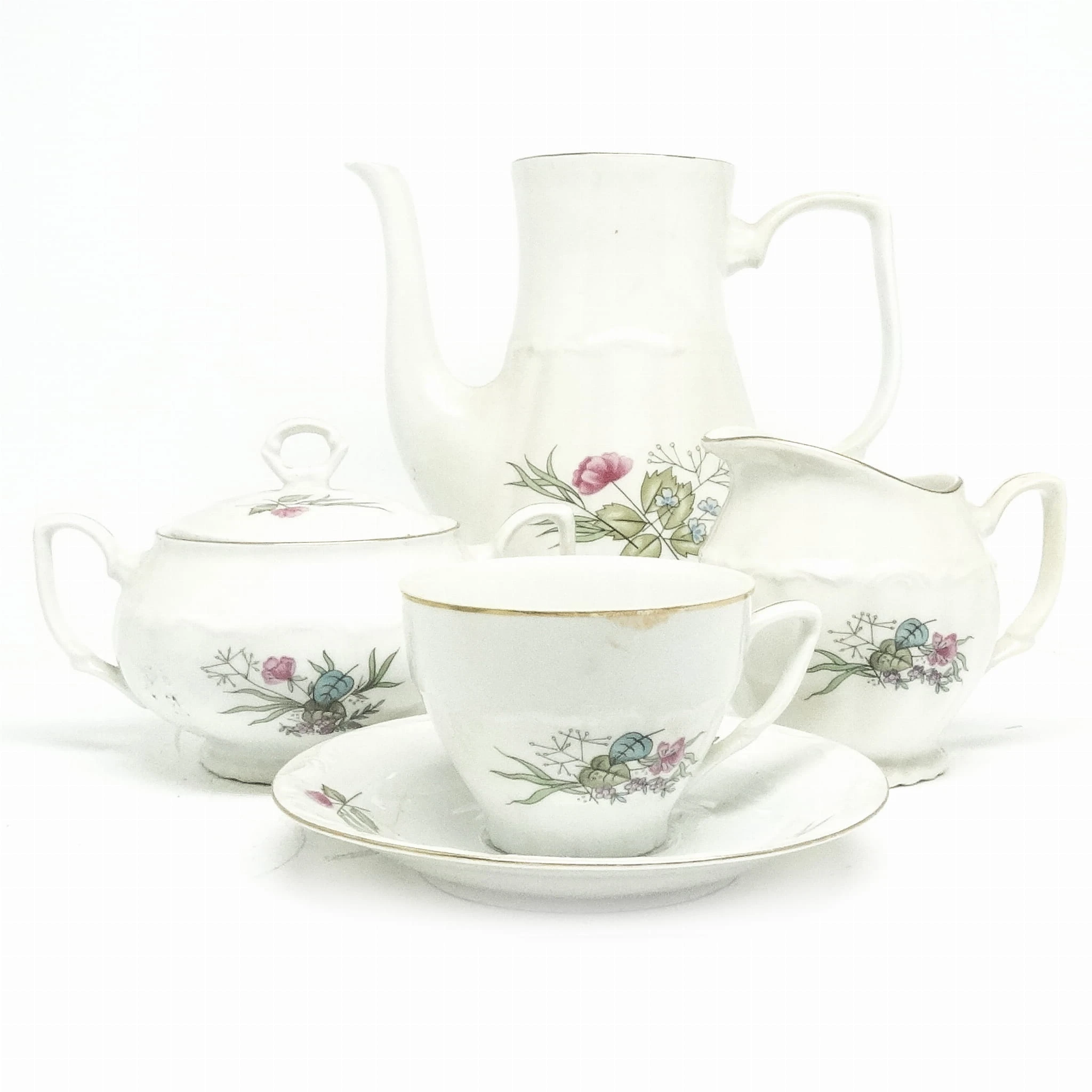 Zestaw składa się z cukiernicy mlecznika i filiżanka. Dzbanek jest dodany w gratisie.