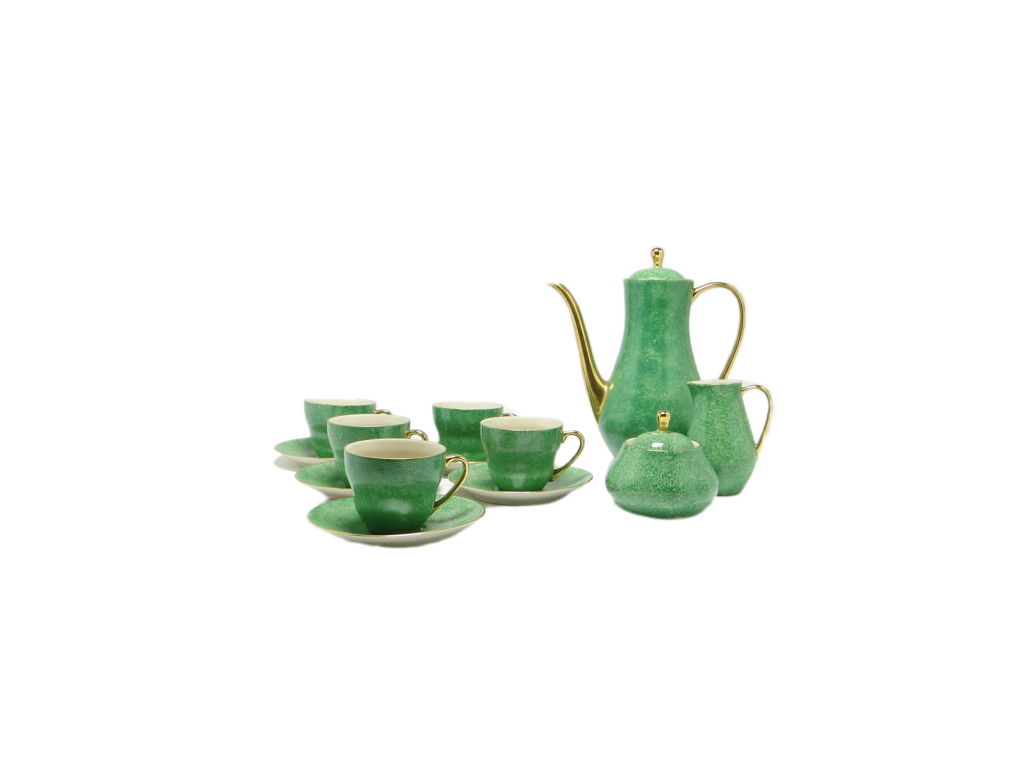 Zestaw do kawy wyprodukowany przez Porcelit Pruszków w Polsce w latach 70. XX wieku obejmuje wysoki dzbanek, cukiernicę z pokrywką, mlecznik oraz pięć filiżanek ze spodkami. Dominującym kolorem jest nasycona, jadeitowa zieleń z delikatnym, nakrapianym wzorem, który nadaje powierzchni głębi i lekkości. Wszystkie elementy wykończone są na wysoki połysk, co podkreśla intensywność barwy, a uchwyty, dzióbki i gałki zdobi polerowane złoto. Wnętrza filiżanek oraz ranty spodków pozostają w kremowej bieli, stanowiąc miękki kontrast dla zieleni. Charakterystyczne są płynne, rozchylone linie i smukłe uchwyty, typowe dla polskiego modernizmu z lat 60. i 70. Porcelit zachowuje gładką, błyszczącą powierzchnię bez uszkodzeń, a złote detale pozostają nienaruszone. Zestaw zachowany w dobrym stanie, bez śladów intensywnego zużycia czy renowacji.W tej porcelanie wybrzmiewa ton polskiej codzienności lat 70.: jadeitowa zieleń i złote akcenty opowiadają o czasach, gdy gościnność przy stole była celebracją i pretekstem do spotkań. Forma i proporcje zestawu sugerują powojenny optymizm i dążenie do nowoczesności – każdy łuk i połysk to opowieść o designie, który szukał pomostu pomiędzy funkcjonalnością a wyrazistością barw. Ten komplet wydaje się szeptać o rytuałach porannej kawy, o rozmowach prowadzonych przy stole, gdzie przedmiot codzienny nabierał wymiaru symbolicznego.Komplet można wykorzystać zarówno podczas codziennych śniadań, jak i w bardziej oficjalnej oprawie. Dobrze sprawdzi się w połączeniu z jasnym obrusem, co pozwoli wydobyć głębię zieleni i połysk złotych detali. Można go zestawić z prostą, szklaną wazą lub ceramiczną paterą w neutralnym odcieniu, by podkreślić modernistyczny rodowód. Zestaw odnajdzie się w aranżacjach inspirowanych stylem mid-century modern, a także w eklektycznych wnętrzach kolekcjonerskich, gdzie barwna ceramika odgrywa rolę wyrazistego akcentu.