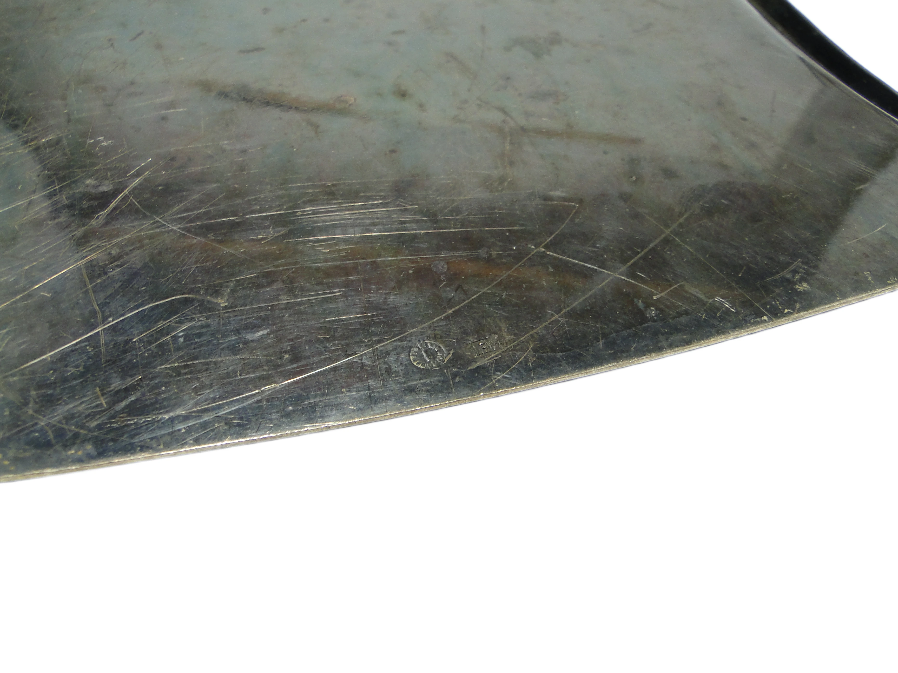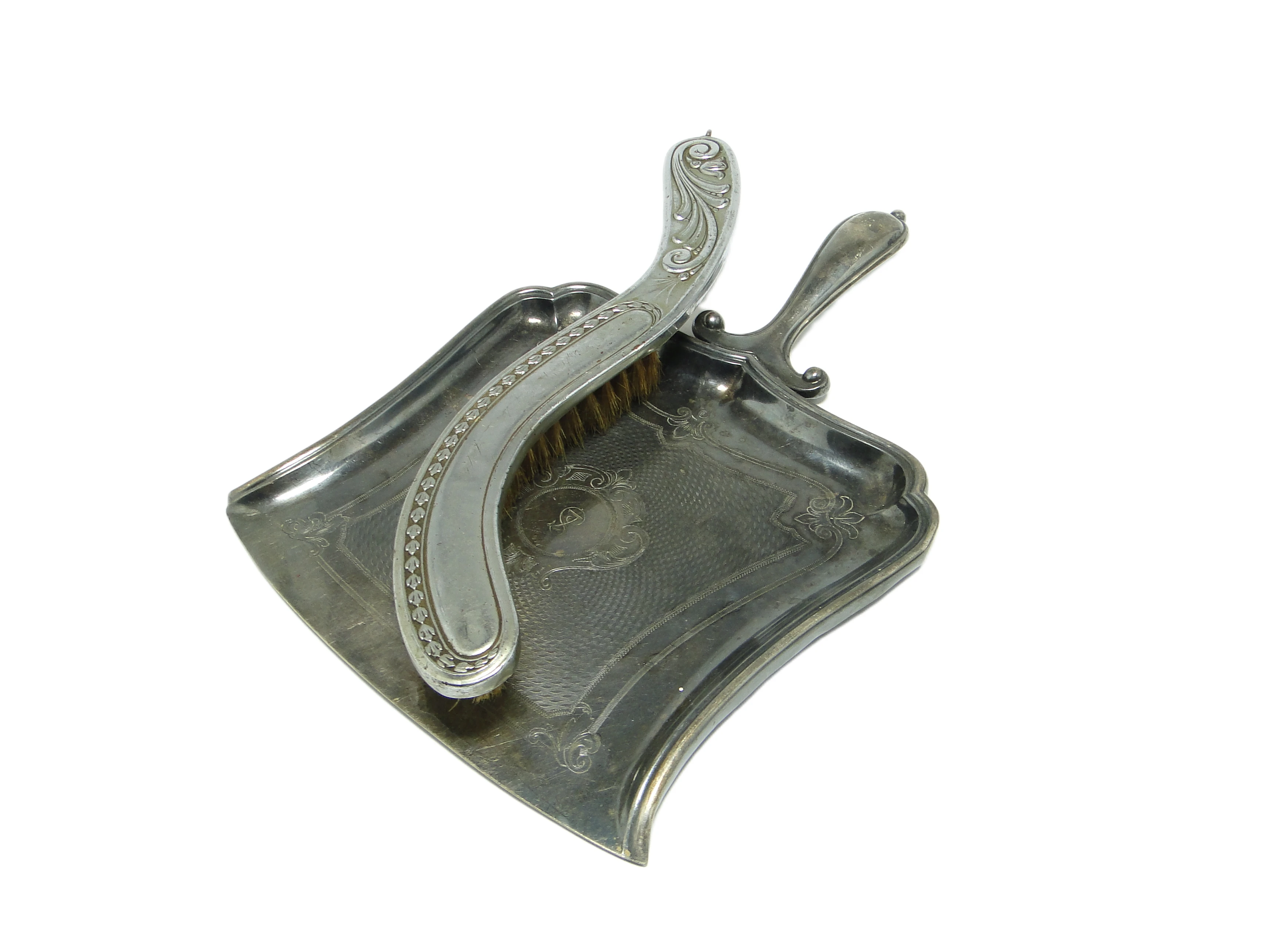 Secesyjny zestaw do okruchów z początku XX wieku wykonano z mosiądzu pokrytego srebrem. Komplet składa się z szerokiej, płaskiej szufelki o łagodnie falowanych krawędziach i profilowanej rączki oraz zmiotki z rękojeścią powtarzającą secesyjne zdobienia. Powierzchnia obu elementów utrzymana jest w subtelnym, matowym odcieniu srebra, z jednolitą patyną, przez którą miejscami przebijają ciepłe tony mosiądzu. Zarówno szufelka, jak i rączka zmiotki, zdobione są ręcznie grawerowanymi motywami roślinnymi i geometrycznymi, charakteryzującymi styl Art Nouveau: płynne, organiczne linie i stylizowane liście wprowadzają rytm i miękkość. Naturalne włosie zmiotki, najpewniej końskie, zachowało strukturę i wyraźne, lecz delikatne ślady użytkowania. Całość łączy solidną konstrukcję z precyzyjnie dopasowanymi elementami. Stan zachowania: dobry, z jednolitą patyną, drobnymi rysami i bez widocznych współczesnych ingerencji.Ten komplet opowiada historię salonowych rytuałów przełomu wieków, kiedy troska o detale była znakiem gościnności i wyszukanej codzienności. Chłodny blask srebrzonej powierzchni odbija światło w sposób miękki, jakby zachęcał do spokojnych gestów i eleganckiego porządku. Secesyjne linie przywołują dialog z naturą – ornamenty wiją się niczym rośliny, tworząc subtelny hołd dla organicznych motywów, które miały przenikać codzienność i zamieniać ją w sztukę użytkową.Zestaw można wyeksponować na konsoli z ciemnego drewna, szklanej półce lub wśród kolekcji porcelany, szkła i srebra w klasycznym lub eklektycznym wnętrzu. Doskonale odnajdzie się pośród innych antyków lub metalowych akcesoriów, ale równie ciekawie może kontrastować z minimalistycznym tłem. Warto połączyć go z miękkimi tekstyliami, kryształowymi naczyniami czy grafiką z epoki, by nadać przestrzeni historycznego wymiaru i subtelnej narracji o przeszłości.Brak dodatkowych danych technicznych i zaleceń pielęgnacyjnych. Włosie zmiotki jest naturalne, prawdopodobnie końskie. Konstrukcja solidna, metal satynowy, srebrzony z naturalną patyną, zgodnie z duchem epoki.