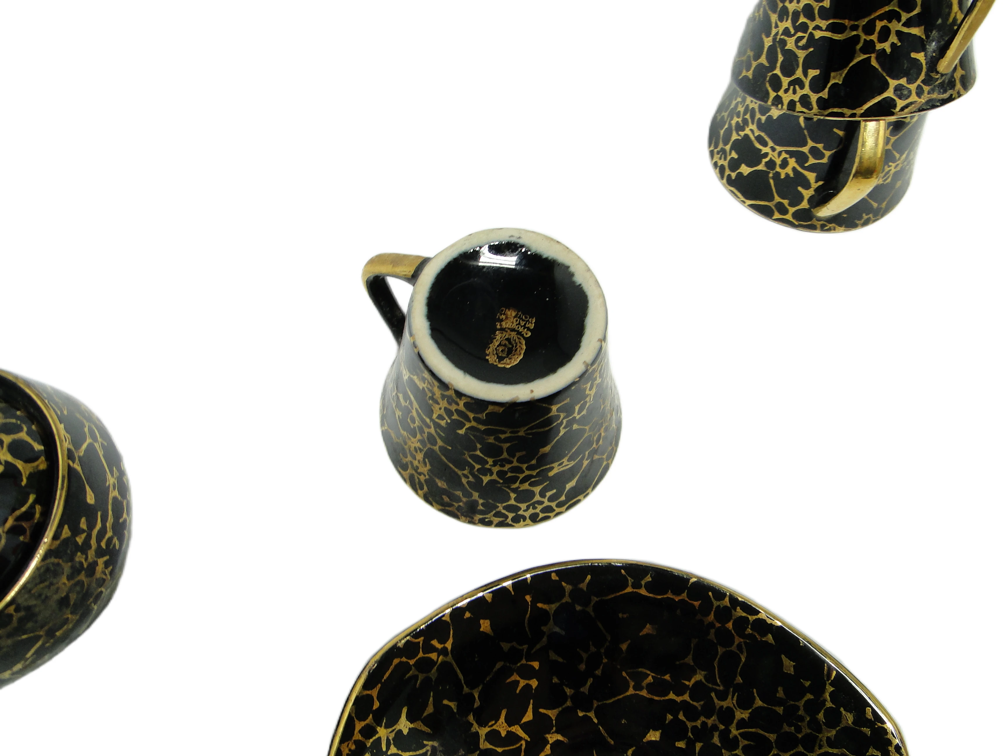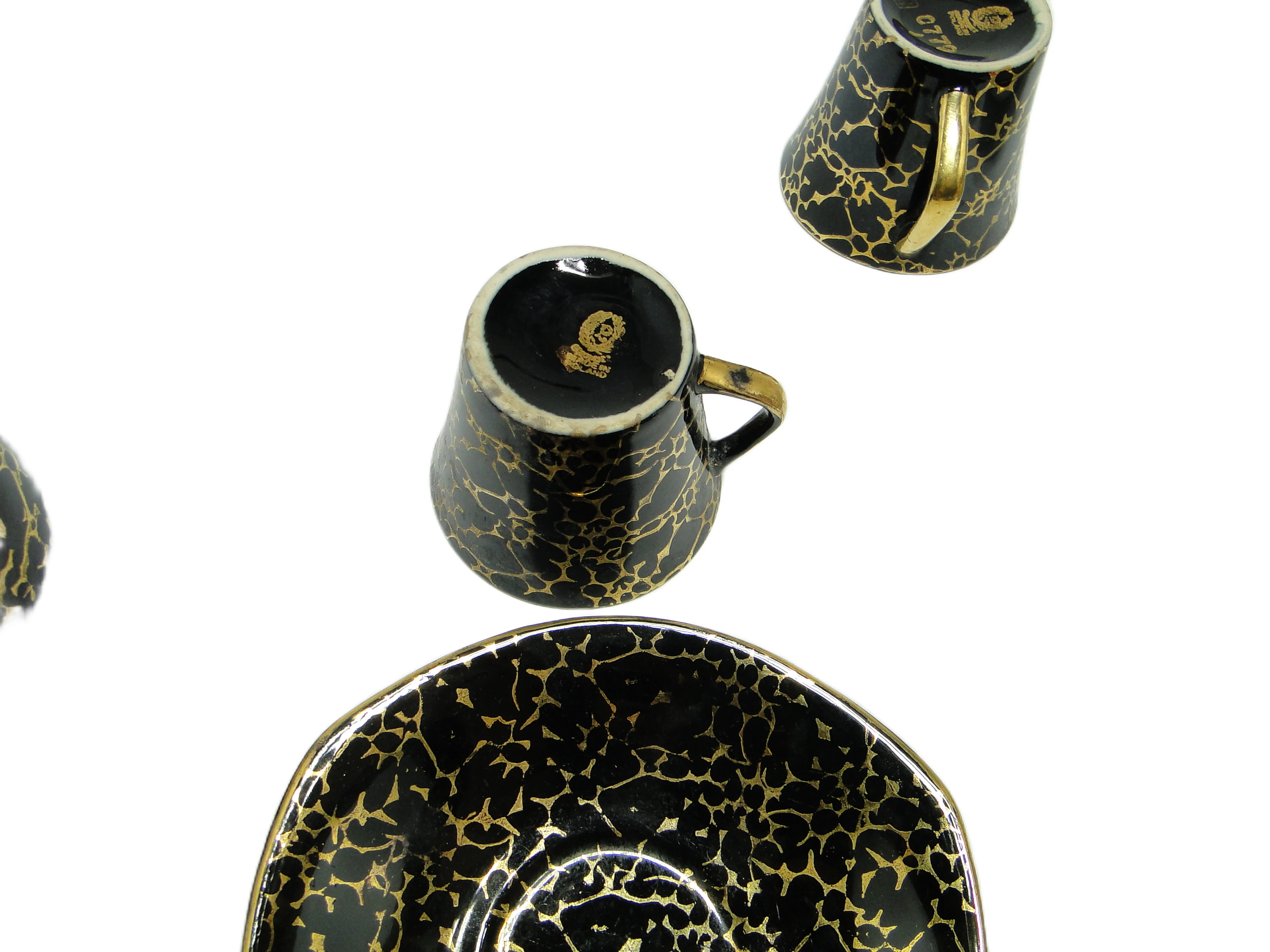 Filiżanka ze spodkiem wykonana z porcelany w Polsce w latach 70. prezentuje styl mid-century modern charakterystyczny dla wschodnioeuropejskiego wzornictwa epoki. Marmurkowe wykończenie w odcieniach fioletu, lawendy i różu, z opalizującą, perłową powierzchnią, obejmuje zarówno filiżankę, jak i spodek, tworząc unikatowy wzór o subtelnych przejściach barw. Uchwyt oraz wnętrze filiżanki są pokryte błyszczącym, metalicznym złotem, co nadaje całości wyrazisty kontrast i podkreśla eksportowy charakter produktu z czasów PRL. Geometryczny, kanciasty uchwyt oraz cylindryczna forma filiżanki i płaski spodek wpisują się w minimalistyczne założenia projektu. Porcelana jest gładka i szkliwiona, bez widocznych uszkodzeń, odprysków czy śladów zużycia; złote detale pozostają kompletne i wyraziste. Marmurkowy wzór został nałożony ręcznie, dzięki czemu każdy zestaw jest niepowtarzalny. Zestaw zachowany w bardzo dobrym stanie, bez widocznych śladów użytkowania.W tej filiżance można odnaleźć głos pokolenia lat 70., które w codziennych przedmiotach szukało odrobiny blasku i nowoczesności. Eksportowa porcelana z PRL była małą ambasadorką aspiracji – złote wnętrze odbijało światło, sugerując luksus i wyjście poza szarość codzienności, a perłowe marmurkowanie przypominało o marzeniach i tęsknocie za kolorami Zachodu. Każda filiżanka była drobnym rytuałem, zaproszeniem do świata, w którym nawet krótka przerwa na herbatę czy kawę mogła stać się oddechem od rzeczywistości.Taki zestaw można zestawić z innymi porcelanowymi elementami o metalicznych detalach lub ustawić na minimalistycznej tacy, gdzie stanie się centralnym punktem kompozycji. Dobrze sprawdzi się w salonie utrzymanym w duchu mid-century modern, ale odnajdzie się również w eklektycznych wnętrzach kolekcjonerskich, gdzie liczy się historia przedmiotów. Warto połączyć go ze szklanymi wazonami lub tekstyliami w odcieniach fiołka, by podkreślić opalizujący efekt i wydobyć głębię koloru.