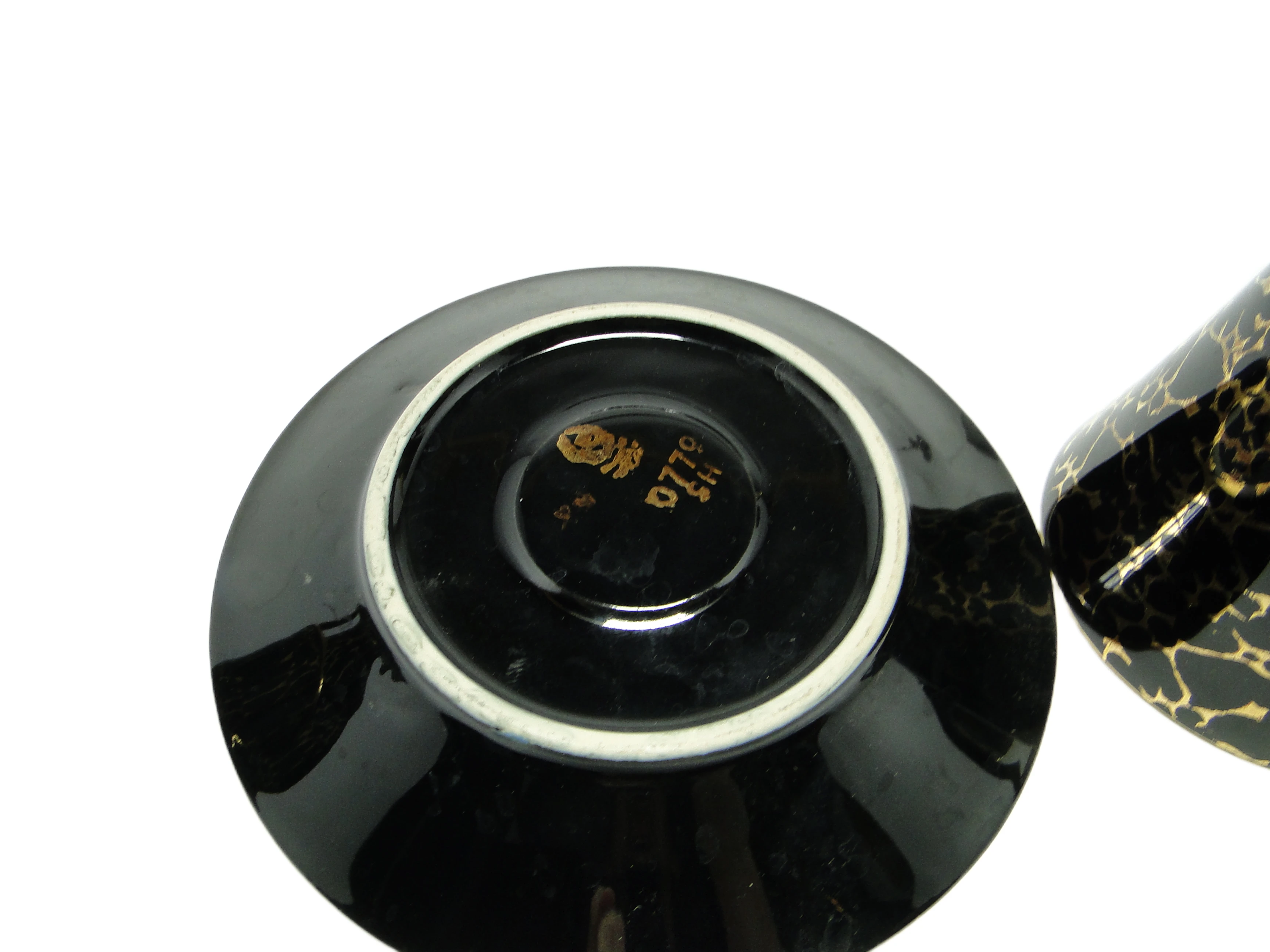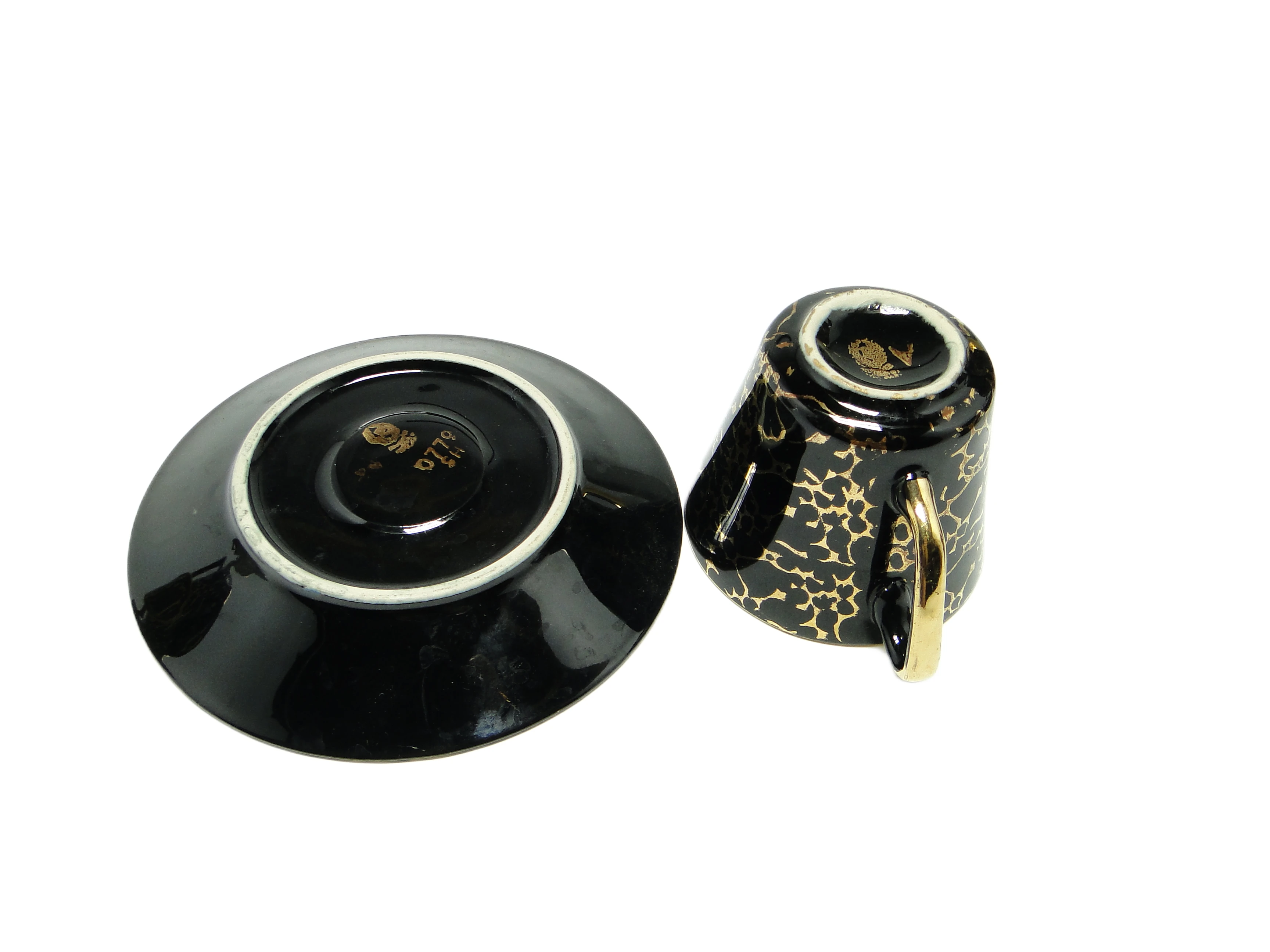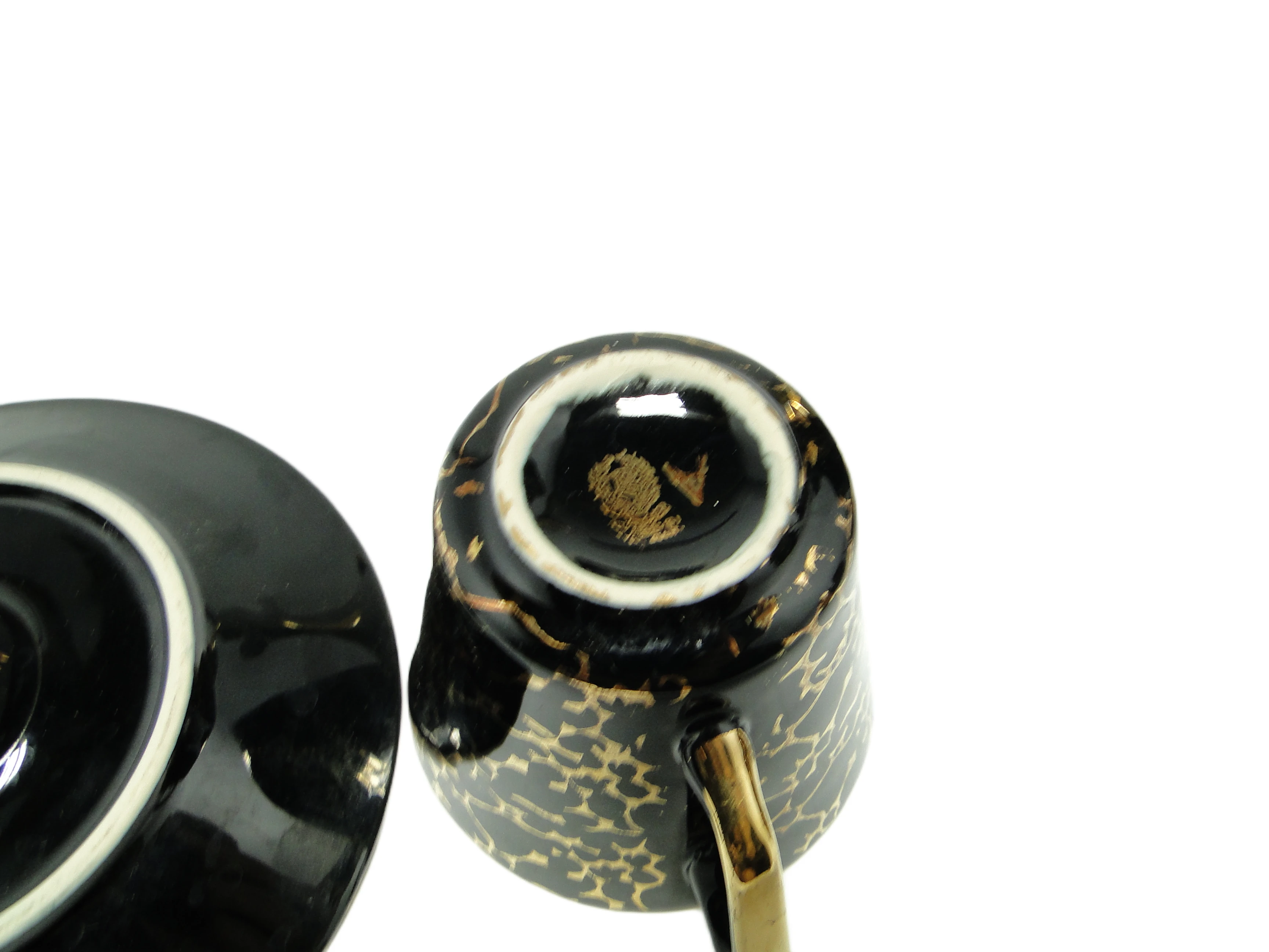 Zestaw filiżanki ze spodkiem Ira, wyprodukowany przez fabrykę Chodzież w Polsce w latach 70., stanowi przykład polskiej porcelany stołowej utrzymanej w duchu późnego modernizmu. Całość wykonano z porcelany o gładkiej, lustrzanej powierzchni, wykończonej na wysoki połysk. Dominującą barwą jest głęboka czerń, która efektownie odbija światło. Zewnętrzne powierzchnie filiżanki oraz spodka pokrywa nieregularny wzór złotych spękań, naniesiony techniką tamponażu, przywodzący na myśl abstrakcyjne grafiki lub popękaną ziemię. Forma filiżanki jest lekko stożkowa, z wyraźnie zarysowanym, kanciastym uchwytem ozdobionym złotym akcentem. Spodek powiela motywy filiżanki, a jego rant podkreśla cienka, złota linia. Zestaw zachował się w bardzo dobrym stanie, bez uszkodzeń i z wyrazistymi złoceniami, typowymi dla ostrożnie używanych wyrobów z epoki.W tej porcelanie zapisana jest historia polskiego designu lat 70., gdy odważne kontrasty i geometryczne formy były odpowiedzią na potrzebę nowoczesności w codziennym życiu. Czerń powierzchni odbija światło jak ciemna tafla szkła, a złote desenie układają się niczym ślady po wyschniętej ziemi lub grafiki z galerii modernistycznych. Każdy łyk napoju staje się powrotem do epoki, w której funkcjonalność szła w parze z dekoracyjnością, a prostota formy była nośnikiem wyrazu.Zestaw ten można wyeksponować na jasnym, minimalistycznym stole, gdzie czarno-złote motywy będą grały główną rolę. Dobrze sprawdzi się w towarzystwie szkła o prostym szlifie lub ceramiki w neutralnych odcieniach, akcentując kontrast i nowoczesny charakter aranżacji. Wnętrza inspirowane stylem mid-century modern, z elementami naturalnego drewna i tekstyliami w stonowanych barwach, pozwolą porcelanie z Chodzieży zaistnieć jako subtelny, kolekcjonerski akcent.