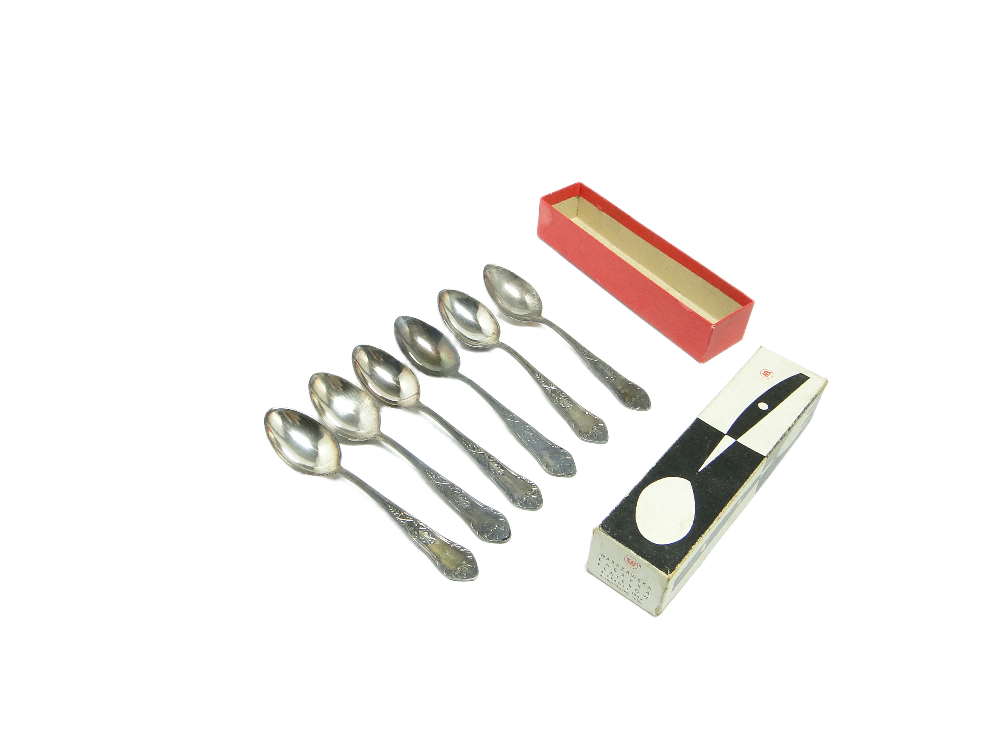 Zestaw sześciu łyżeczek do herbaty „Aleksandria” pochodzi z Polski z lat 70. XX wieku i stanowi przykład rzemiosła stołowego inspirowanego barokiem, charakterystycznego dla epoki powojennej. Każda łyżeczka została wykonana z mosiądzu pokrytego warstwą srebra, co nadaje całości chłodny, srebrzysty odcień z matowym wykończeniem i naturalnym połyskiem szczególnie widocznym na czaszach i trzonkach. Smukłe, lekko zakrzywione trzonki kończą się poszerzoną, zaokrągloną główką ozdobioną wyrazistym reliefem z motywami roślinnymi i ornamentalnymi, które nawiązują do estetyki baroku, tak popularnej w dekoracjach stołowych połowy XX wieku. Ozdobny wzór jest starannie wykonany i obejmuje górną część każdego trzonka, a przejścia między czaszą a trzonkiem są płynne, podkreślając dokładność wykonania. Zestaw zachowany jest w oryginalnym kartonowym pudełku z czerwonym wieczkiem i grafiką vintage, całość nosi minimalne ślady użytkowania typowe dla wieku, bez widocznych uszkodzeń czy napraw – stan określany jako bardzo dobry.W tych łyżeczkach pobrzmiewa echo domowych ceremonii lat 70., kiedy rytuał popołudniowej herbaty był okazją do spotkań i rozmów. Reliefowe ornamenty, lekko zmatowione srebro i subtelna patyna przywołują atmosferę dawnych stołów, gdzie każdy detal miał znaczenie, a przedmioty codziennego użytku projektowano z myślą o trwałości i dekoracyjności. Delikatny połysk srebrzonego mosiądzu opowiada o chwilach, gdy zestawu używano z troską i szacunkiem, wyjmując go na specjalne okazje.Zestaw „Aleksandria” można wykorzystać zarówno w klasycznych aranżacjach stołu z porcelanową zastawą i lnianą serwetą, jak i w kolekcjonerskich, eklektycznych kompozycjach zestawionych z szklanymi filiżankami vintage czy minimalistyczną tacą. Warto połączyć go ze srebrną cukierniczką lub zestawić z nowoczesnymi elementami, by uzyskać dialog między tradycją a współczesnością. Łyżeczki dobrze odnajdą się zarówno podczas kameralnych spotkań, jak i większych przyjęć o klasycznym lub mieszanym charakterze.