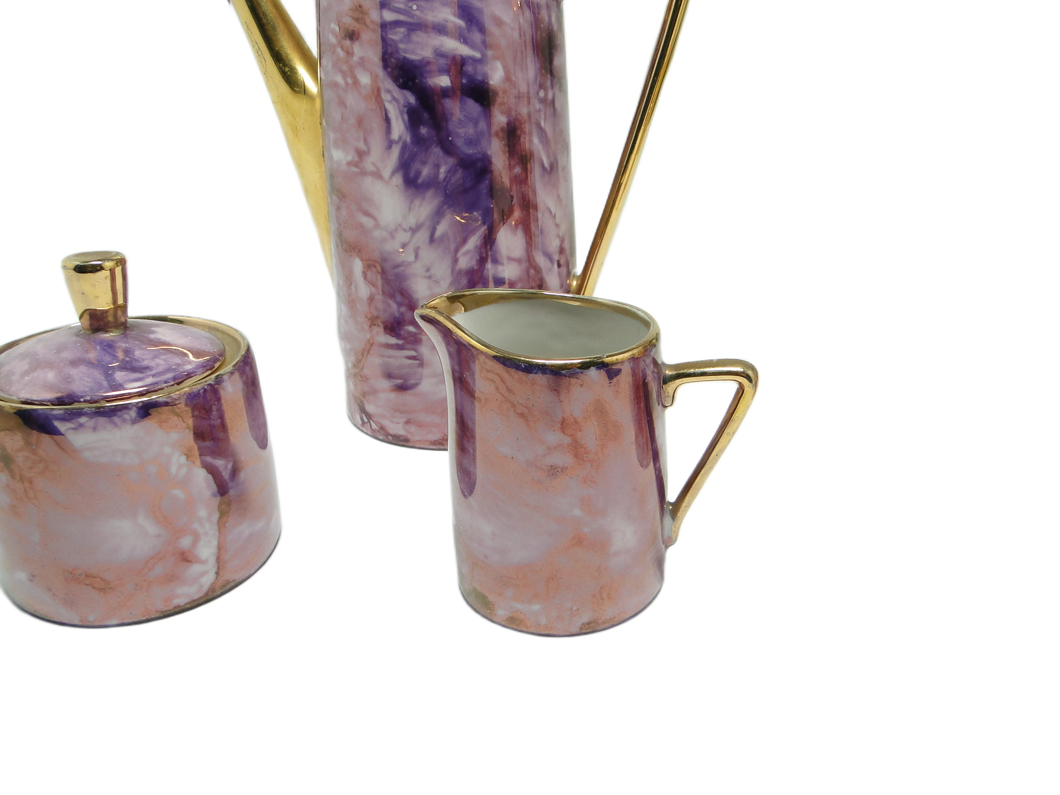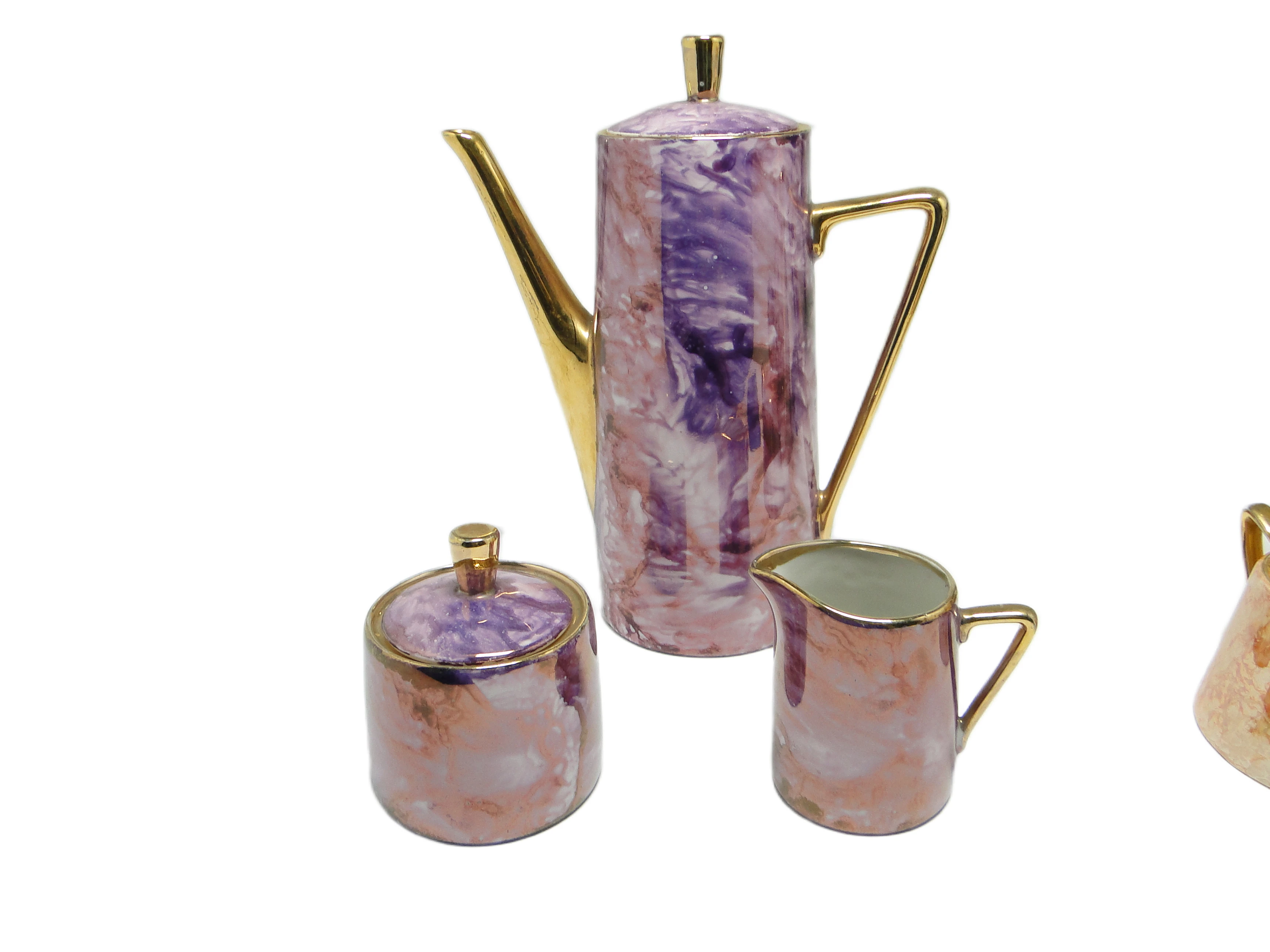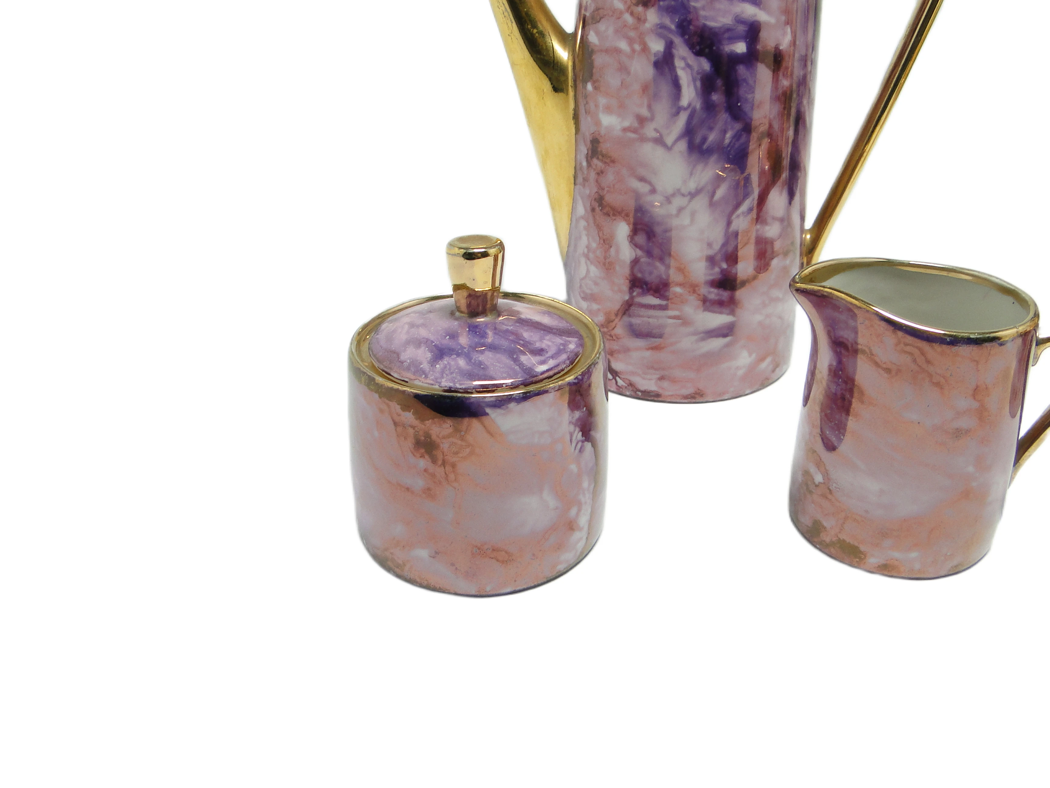 Zestaw stołowy Krzysztof z lat 70. to propozycja polskiej porcelany utrzymanej w nurcie mid-century modern. Składa się z wysokiego dzbanka, mlecznika oraz cukiernicy, z których każdy wykonano z porcelany o marmurkowej mieszance bieli, pastelowego różu i fioletu, rozmieszczonej nieregularnie na powierzchni. Smukłe, cylindryczne formy i wyraziste, geometryczne linie korespondują z estetyką epoki, a całość dopełniają lśniące, metaliczne złote akcenty: dzióbki, uchwyty i pokrywki. Powierzchnia porcelany jest gładka i błyszcząca, a złote detale zachowały pełen blask bez oznak matowienia. Precyzyjne wykonanie widoczne jest w płynnych łączeniach i starannie wyprofilowanych uchwytach. Zestaw nie posiada widocznych odprysków ani pęknięć; zachowany w dobrym stanie, z minimalnymi śladami użytkowania typowymi dla przedmiotów vintage.W tej porcelanie można usłyszeć cichy głos lat 70., kiedy marzenia o nowoczesności splatały się z przywiązaniem do rzemieślniczej dbałości o detal. Marmurkowe desenie i połyskujące złoto przywołują obraz porannego stołu, na którym codzienny rytuał kawy czy herbaty nabiera odświętnego tonu. Każdy element tego serwisu zdaje się zatrzymywać rytm dnia, zapraszając do celebrowania chwili i docenienia finezji wykończenia, jakby drobny gest – postawienie dzbanka – miał znaczyć więcej niż zwykły ruch.Zestaw można wykorzystać podczas serwowania kawy lub herbaty w salonie lub jadalni. Jego wyrazista, pastelowa kolorystyka dobrze współgra z neutralnymi tłami, ale można go także zestawić z ceramiką użytkową lub szklanymi paterami o prostych formach. Sprawdzi się w aranżacjach mid-century modern, jak i w kolekcjonerskich wnętrzach o eklektycznym charakterze. Warto połączyć go z minimalistycznym obrusem lub drewnianą tacą, by wydobyć głębię kolorów i podkreślić blask złotych detali.