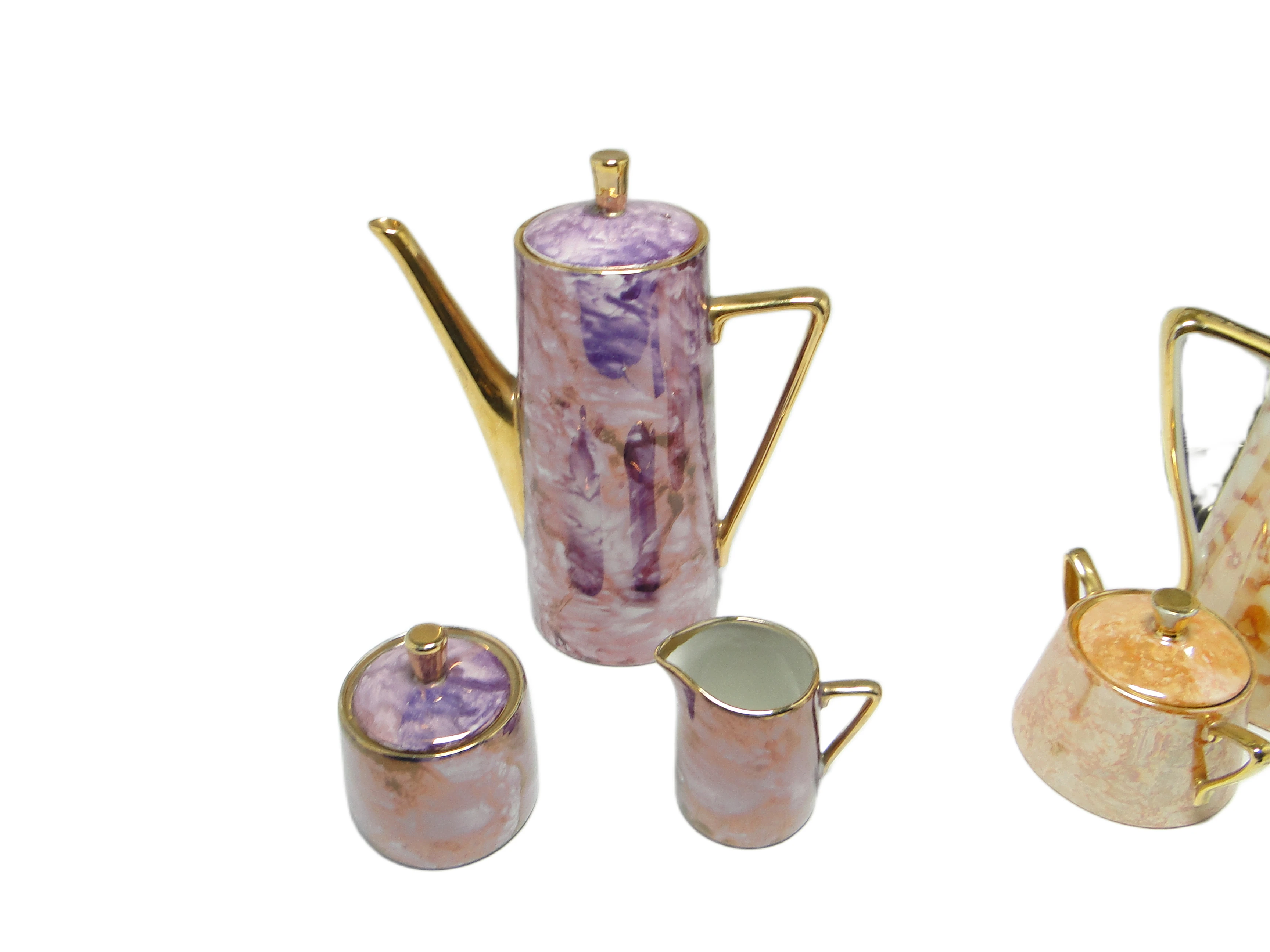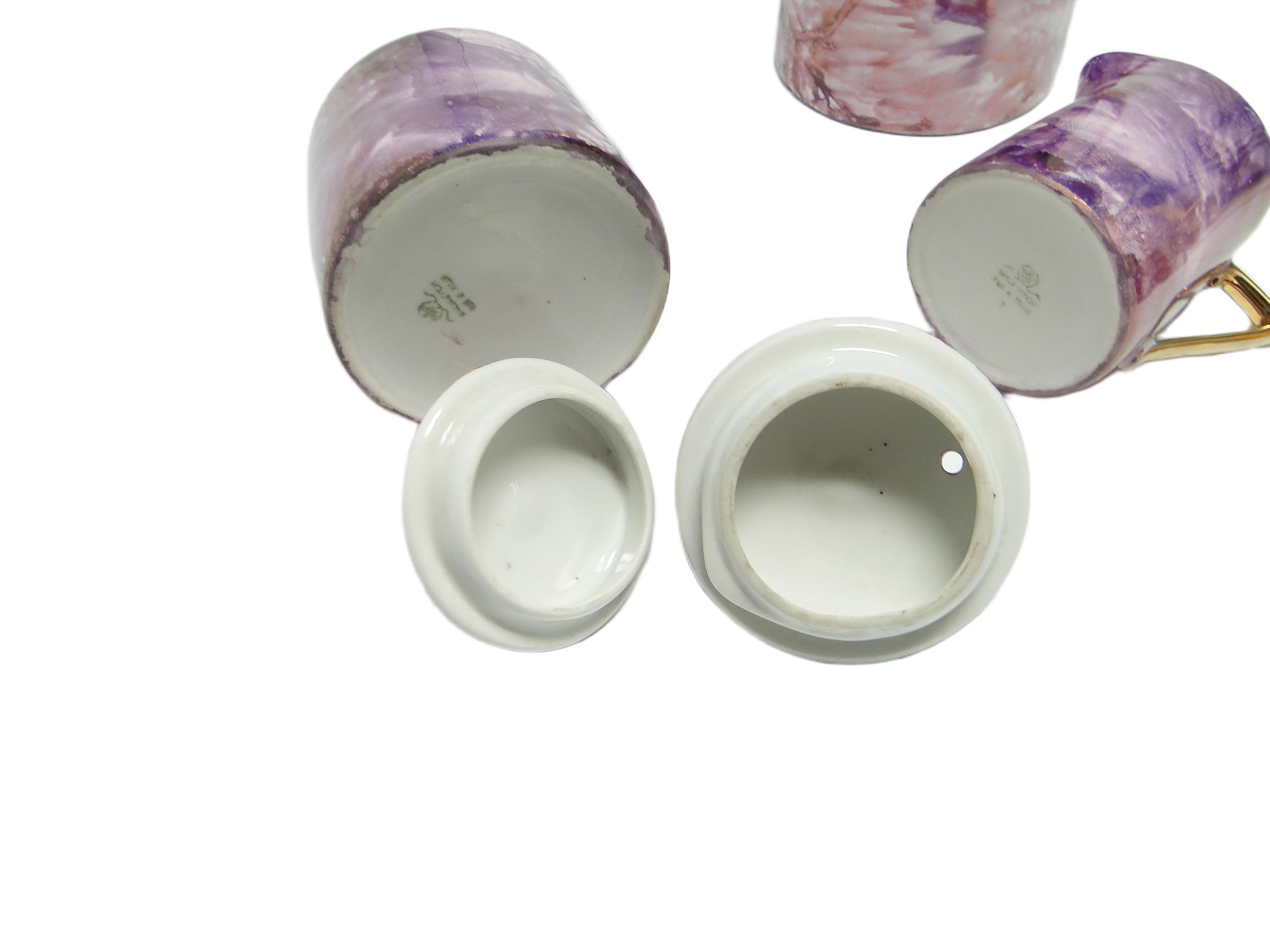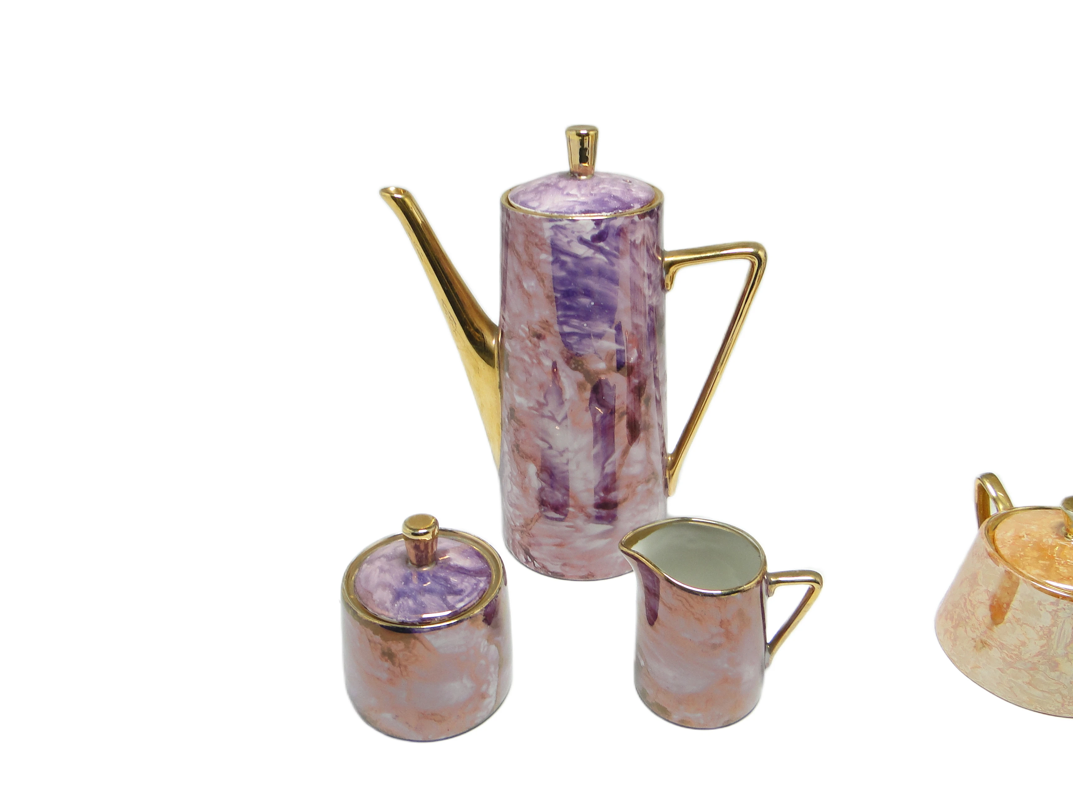 Zestaw stołowy Krzysztof z lat 70. to propozycja polskiej porcelany utrzymanej w nurcie mid-century modern. Składa się z wysokiego dzbanka, mlecznika oraz cukiernicy, z których każdy wykonano z porcelany o marmurkowej mieszance bieli, pastelowego różu i fioletu, rozmieszczonej nieregularnie na powierzchni. Smukłe, cylindryczne formy i wyraziste, geometryczne linie korespondują z estetyką epoki, a całość dopełniają lśniące, metaliczne złote akcenty: dzióbki, uchwyty i pokrywki. Powierzchnia porcelany jest gładka i błyszcząca, a złote detale zachowały pełen blask bez oznak matowienia. Precyzyjne wykonanie widoczne jest w płynnych łączeniach i starannie wyprofilowanych uchwytach. Zestaw nie posiada widocznych odprysków ani pęknięć; zachowany w dobrym stanie, z minimalnymi śladami użytkowania typowymi dla przedmiotów vintage.W tej porcelanie można usłyszeć cichy głos lat 70., kiedy marzenia o nowoczesności splatały się z przywiązaniem do rzemieślniczej dbałości o detal. Marmurkowe desenie i połyskujące złoto przywołują obraz porannego stołu, na którym codzienny rytuał kawy czy herbaty nabiera odświętnego tonu. Każdy element tego serwisu zdaje się zatrzymywać rytm dnia, zapraszając do celebrowania chwili i docenienia finezji wykończenia, jakby drobny gest – postawienie dzbanka – miał znaczyć więcej niż zwykły ruch.Zestaw można wykorzystać podczas serwowania kawy lub herbaty w salonie lub jadalni. Jego wyrazista, pastelowa kolorystyka dobrze współgra z neutralnymi tłami, ale można go także zestawić z ceramiką użytkową lub szklanymi paterami o prostych formach. Sprawdzi się w aranżacjach mid-century modern, jak i w kolekcjonerskich wnętrzach o eklektycznym charakterze. Warto połączyć go z minimalistycznym obrusem lub drewnianą tacą, by wydobyć głębię kolorów i podkreślić blask złotych detali.