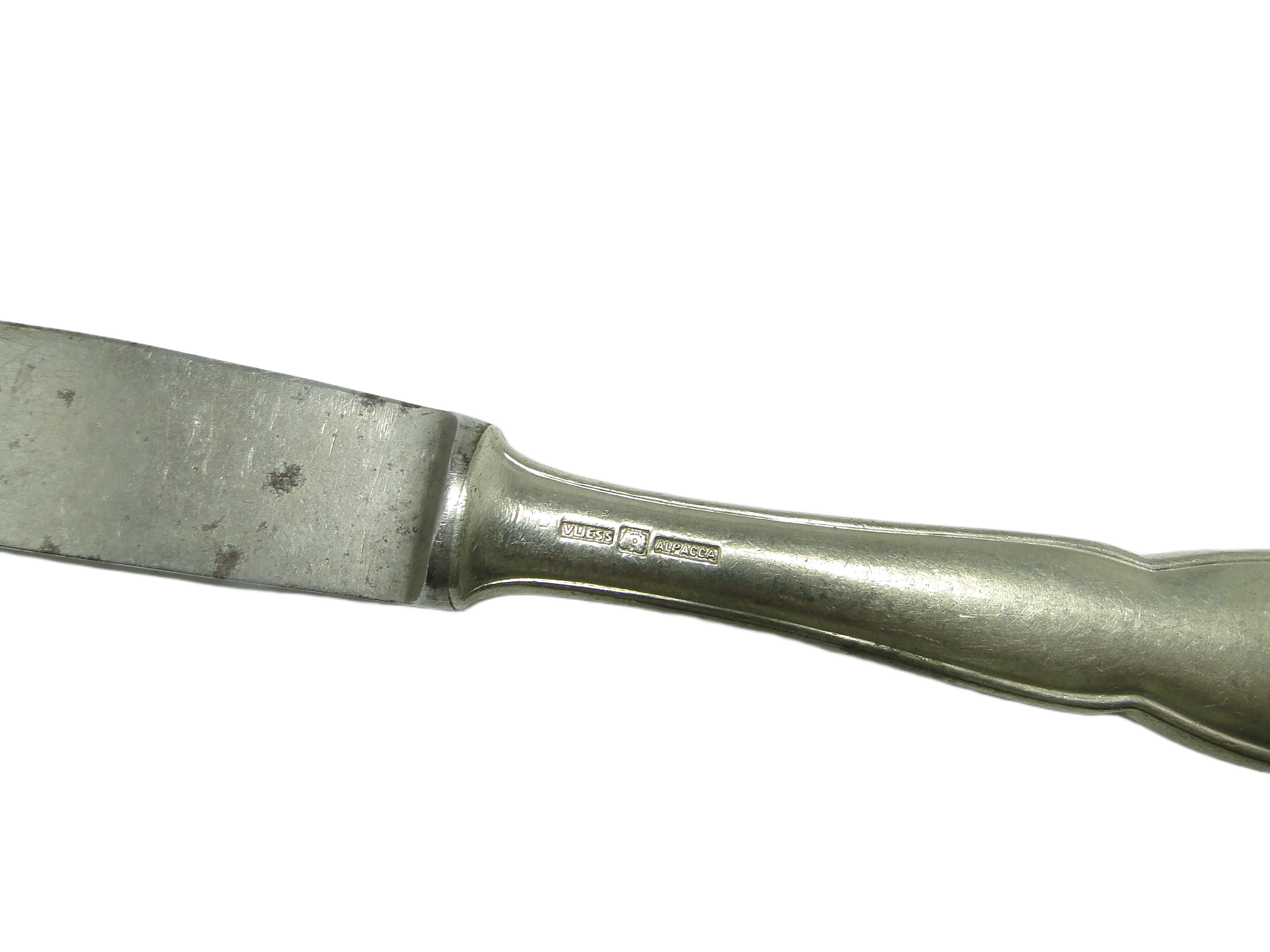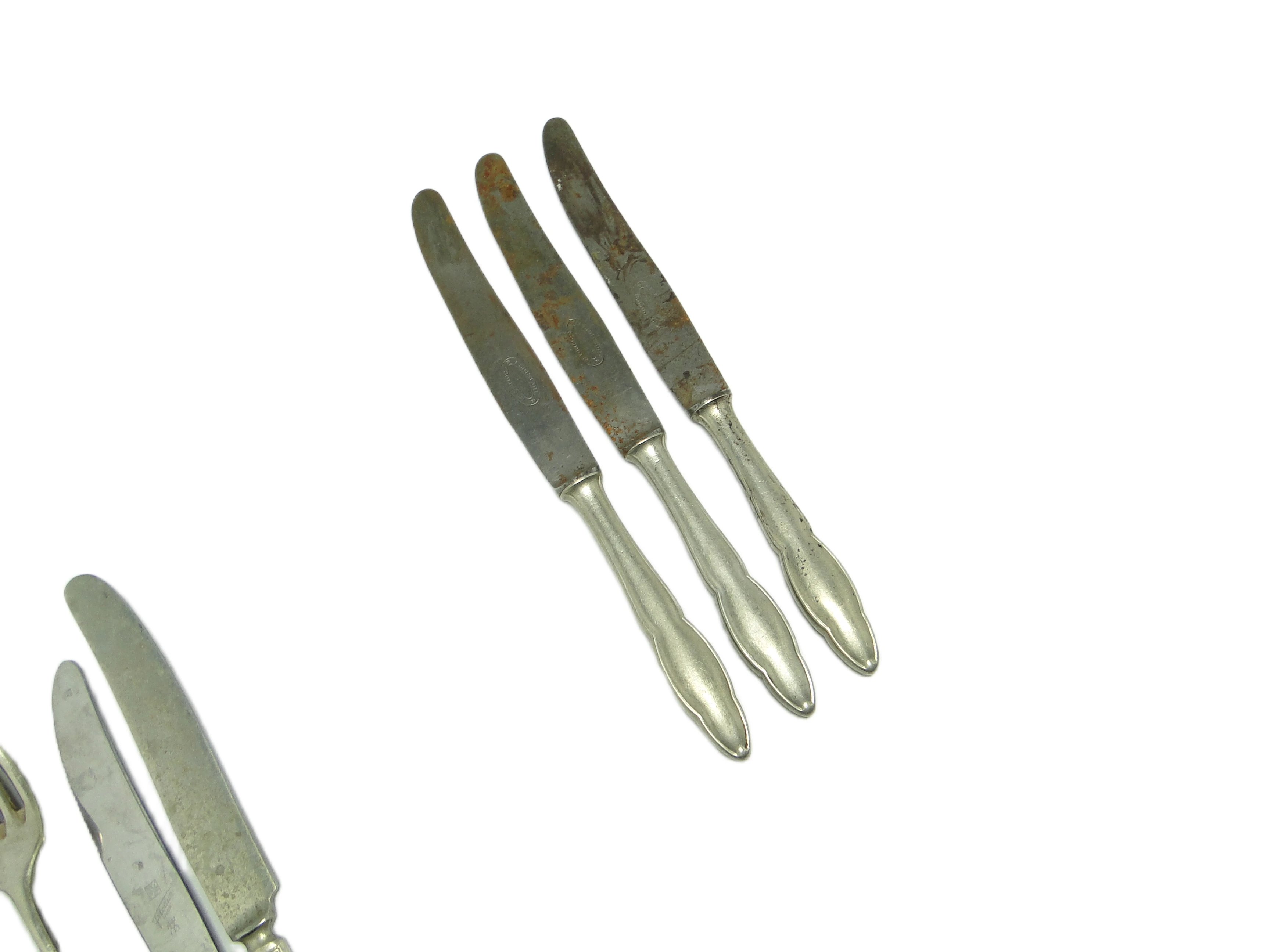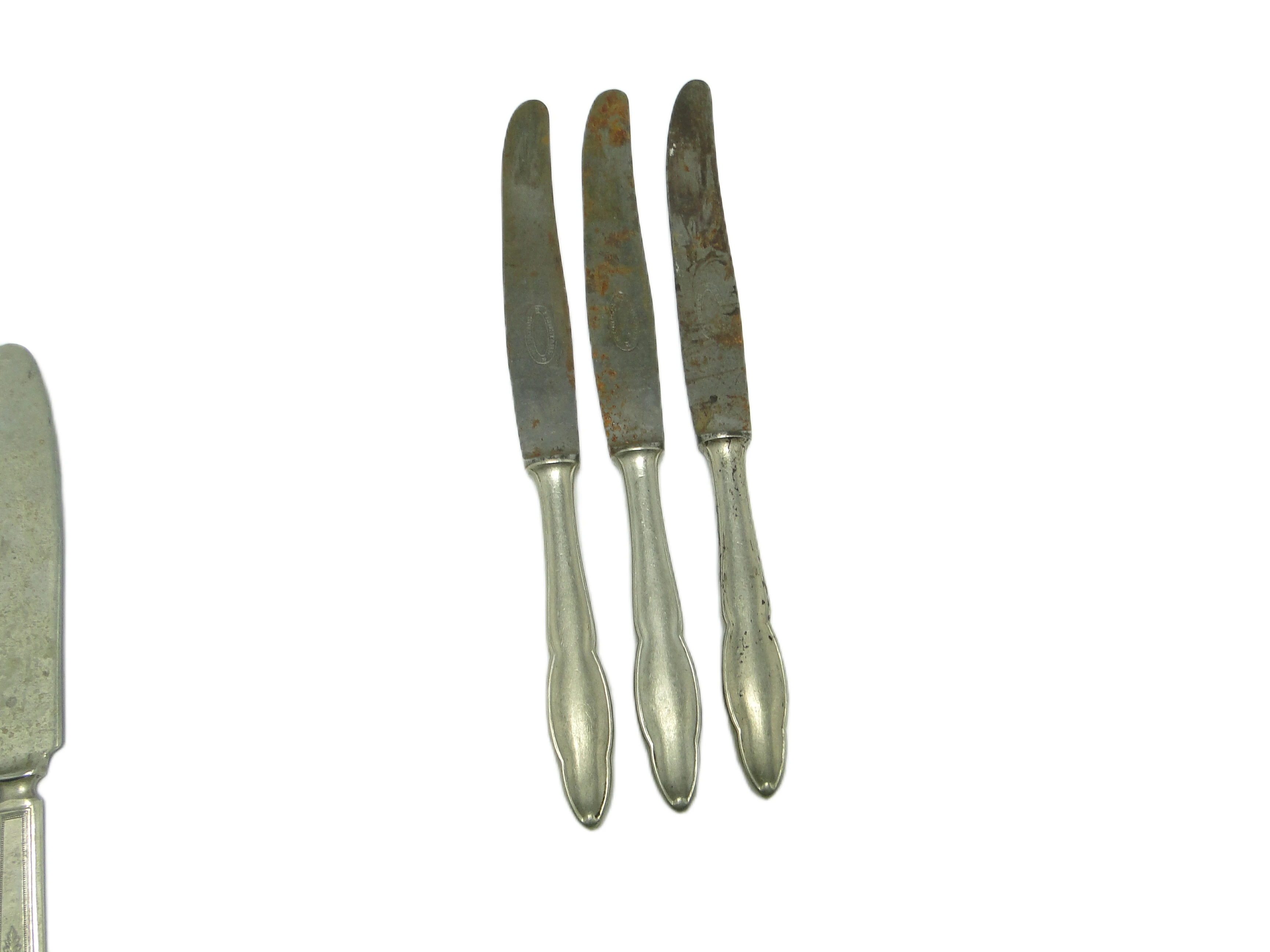 Zestaw trzech noży do chleba z lat 50. wykonany w Polsce to przykład powojennego wzornictwa użytkowego, opartego na funkcjonalności i szczerości materiałów. Noże wykonano z mosiądzu pokrytego warstwą srebra, co nadaje całości chłodny, lekko matowy połysk. Konstrukcja jest monolityczna – bez widocznych łączeń czy zdobień. Rękojeści mają organiczną, opływową linię, płynnie przechodzącą w szerokie, zaokrąglone ostrza. Brak grawerunków i dekoracji podkreśla nacisk na praktyczność, charakterystyczny dla polskiego modernizmu połowy XX wieku. Na powierzchni zachowała się wyrazista patyna, z wyraźnymi śladami utlenienia, drobnymi rysami i przebarwieniami, widocznymi zwłaszcza na górnych częściach ostrzy. Zestaw zachowany w dobrym stanie, z wyraźnymi śladami użytkowania i naturalną patyną odpowiednią dla wieku.Te noże opowiadają historię epoki, w której wartość przedmiotu tkwiła w jego trwałości i prostocie. Srebrzysta powierzchnia, miejscami zmatowiona, przywołuje obrazy powojennych kuchni – codziennych śniadań, rodzinnych spotkań przy stole, prostych gestów. Opływowy profil rękojeści zdradza inspiracje modernistycznym umiarkowaniem, gdzie forma podporządkowana była funkcji, a materiał miał przemawiać własnym głosem. Patyna i przebarwienia to ślady historii – dowód na obecność tych noży w wielu domowych scenariuszach minionych dekad.Komplet można zestawić z kamionkowymi naczyniami, lnianymi serwetami lub deską z litego drewna, uzyskując autentyczny klimat retro. Dobrze sprawdzi się w minimalistycznej kuchni mid-century, gdzie wyeksponowana prostota noży podkreśli szczerość materiałów. Warto połączyć je z innymi elementami vintage – szklanymi karafkami, ręcznie tkanym obrusem czy ceramiką o oszczędnej formie – by zbudować spójną narrację użytkowego dziedzictwa lat 50.
