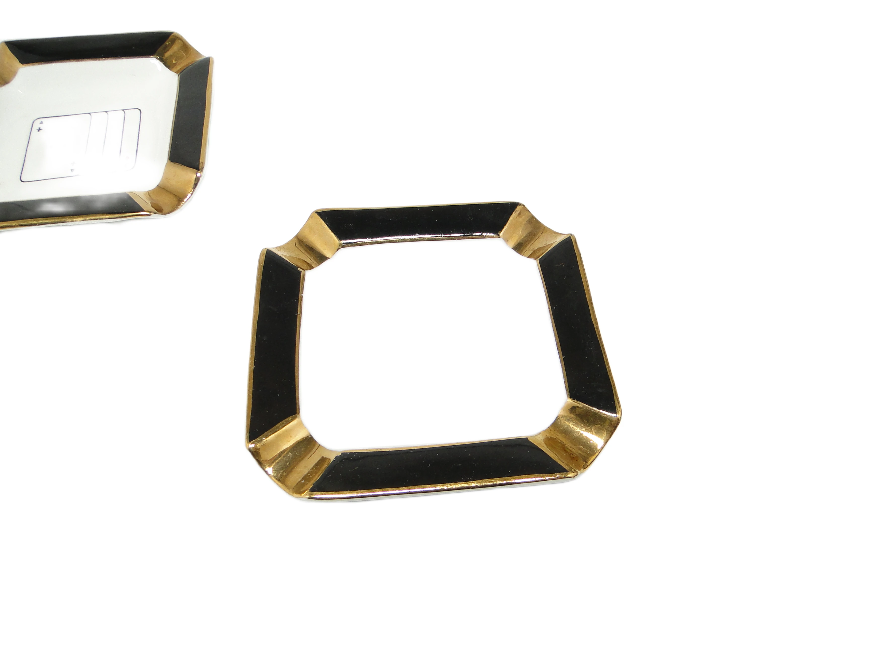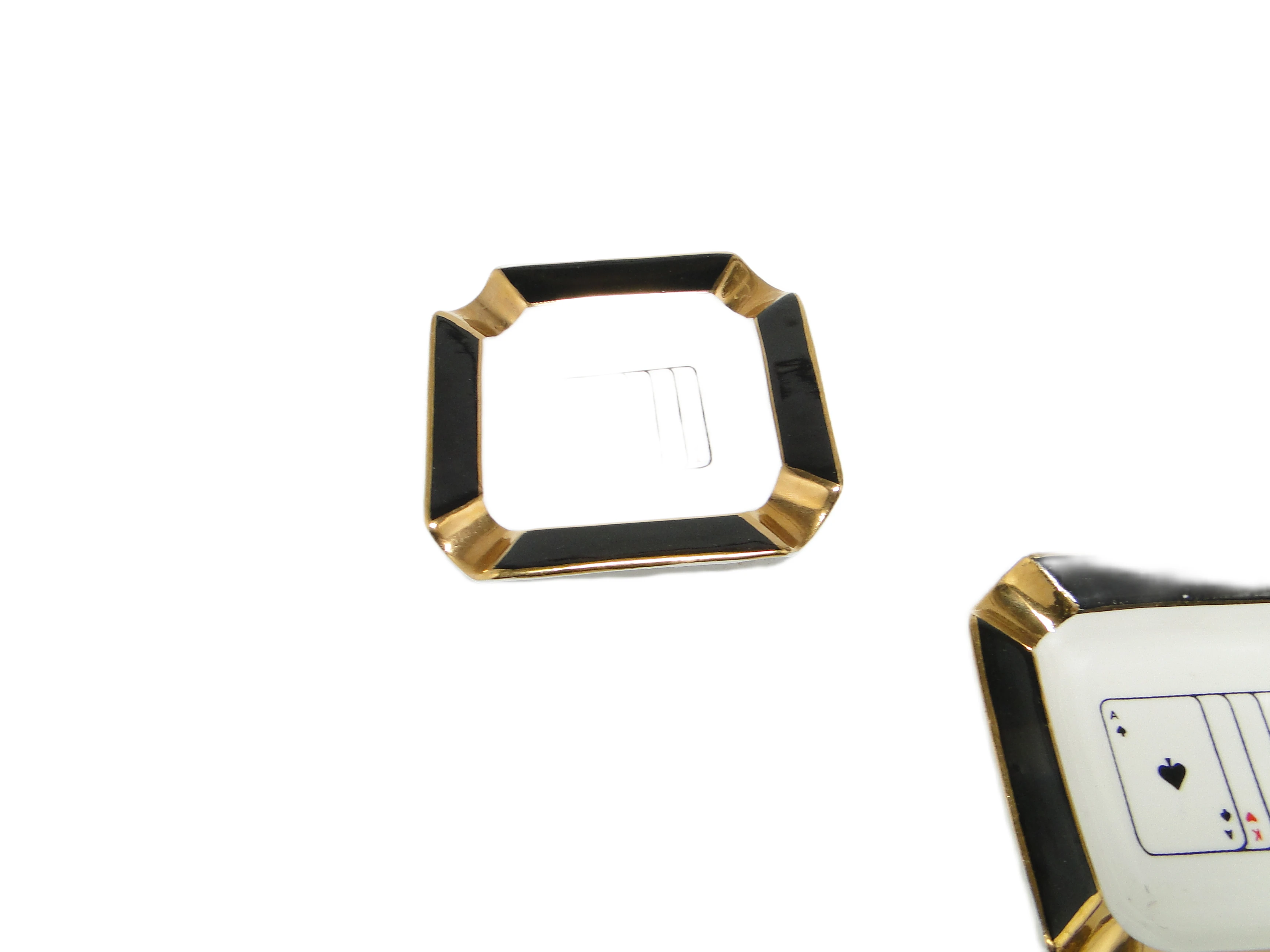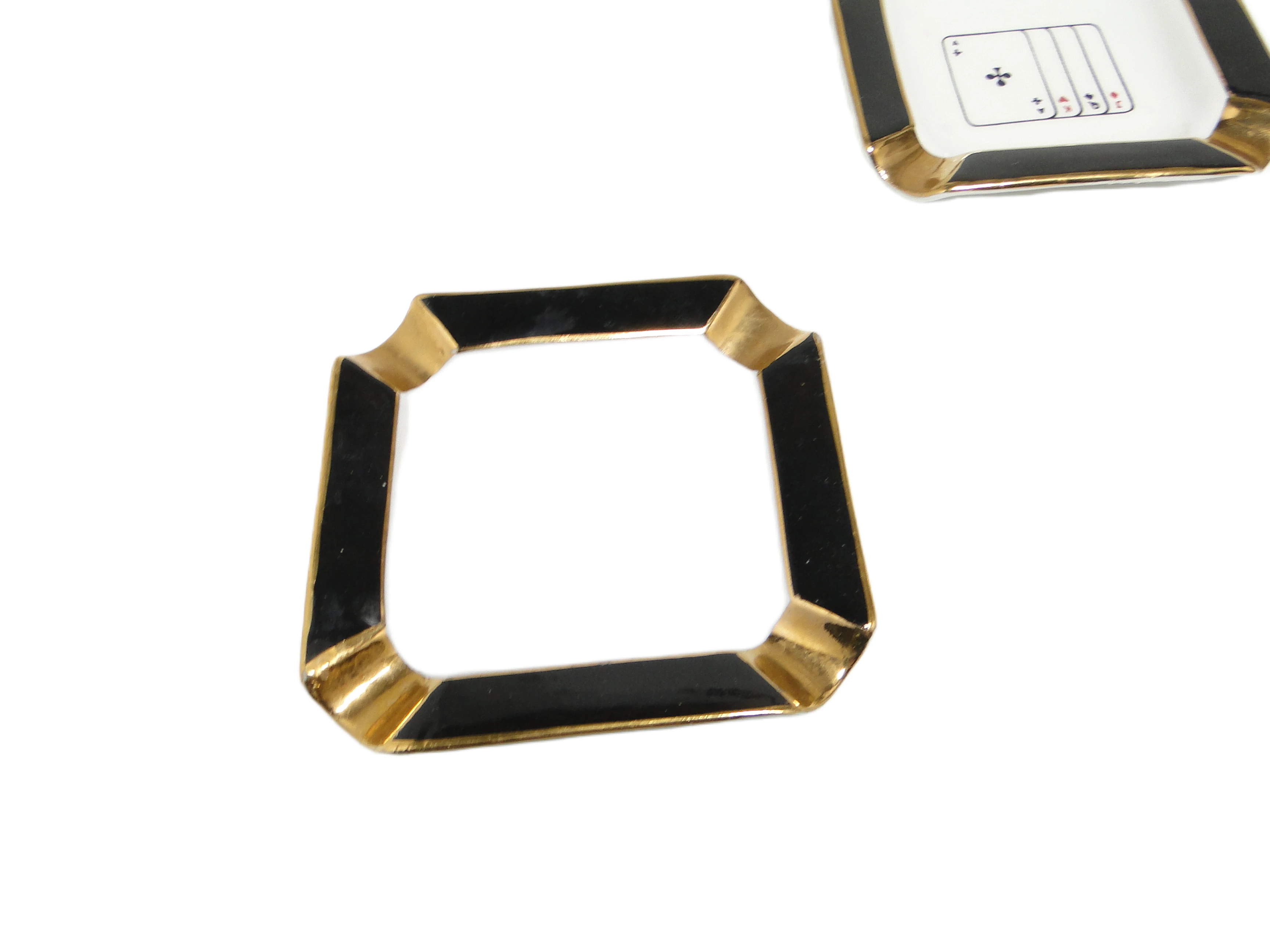 Zestaw trzech brydżowych popielniczek z Ćmielowa, wyprodukowany w Polsce w latach 60., to wyraz charakterystycznej dla epoki estetyki mid-century modern. Każda z porcelanowych popielniczek ma geometryczną, prostokątną formę z delikatnie ściętymi narożnikami, które przywodzą na myśl subtelny ośmiokąt. Dominuje lśniąca biel porcelany, kontrastująca z szerokim, czarnym rantem wykończonym na wysoki połysk. W narożnikach znajdują się ręcznie malowane złote akcenty, a centralną część każdej popielniczki zdobi minimalistyczny motyw karty do gry – karo, trefl lub pik – przedstawiony cienką czarną i czerwoną linią. Powierzchnia porcelany jest gładka i silnie połyskująca, a złote oraz czarne zdobienia zachowały swoją intensywność. Stan zachowania bardzo dobry – brak widocznych uszkodzeń, odprysków czy większych śladów użytkowania.Te popielniczki zdają się przywoływać atmosferę salonowych wieczorów lat 60., kiedy gra w brydża była synonimem towarzyskiej elegancji. Biała tafla porcelany opowiada o dyskretnym luksusie, a graficzne motywy kart i złote detale przypominają o umiłowaniu do subtelnej dekoracji, typowej dla powojennego modernizmu. Forma i kolorystyka zestawu niosą wspomnienie spotkań przy karcianym stoliku, rozmów prowadzonych ponad dymem papierosów i gestów, które na chwilę zatrzymywały czas.Komplet można wyeksponować na konsoli lub stoliku kawowym w salonie inspirowanym wzornictwem połowy XX wieku, gdzie podkreśli kolekcjonerski lub vintage charakter wnętrza. Popielniczki sprawdzą się również jako niewielkie naczynia na biżuterię, drobiazgi lub klucze – dobrze współgrają z innymi porcelanowymi dodatkami, złotymi świecznikami czy szkłem barwionym na żywe kolory. Wnętrza z ciemnym drewnem, aksamitnymi tkaninami lub geometrycznymi akcentami wydobędą ich dekoracyjny potencjał, a minimalistyczna ceramika w sąsiedztwie pozwoli uzyskać kontrast epok i faktur.