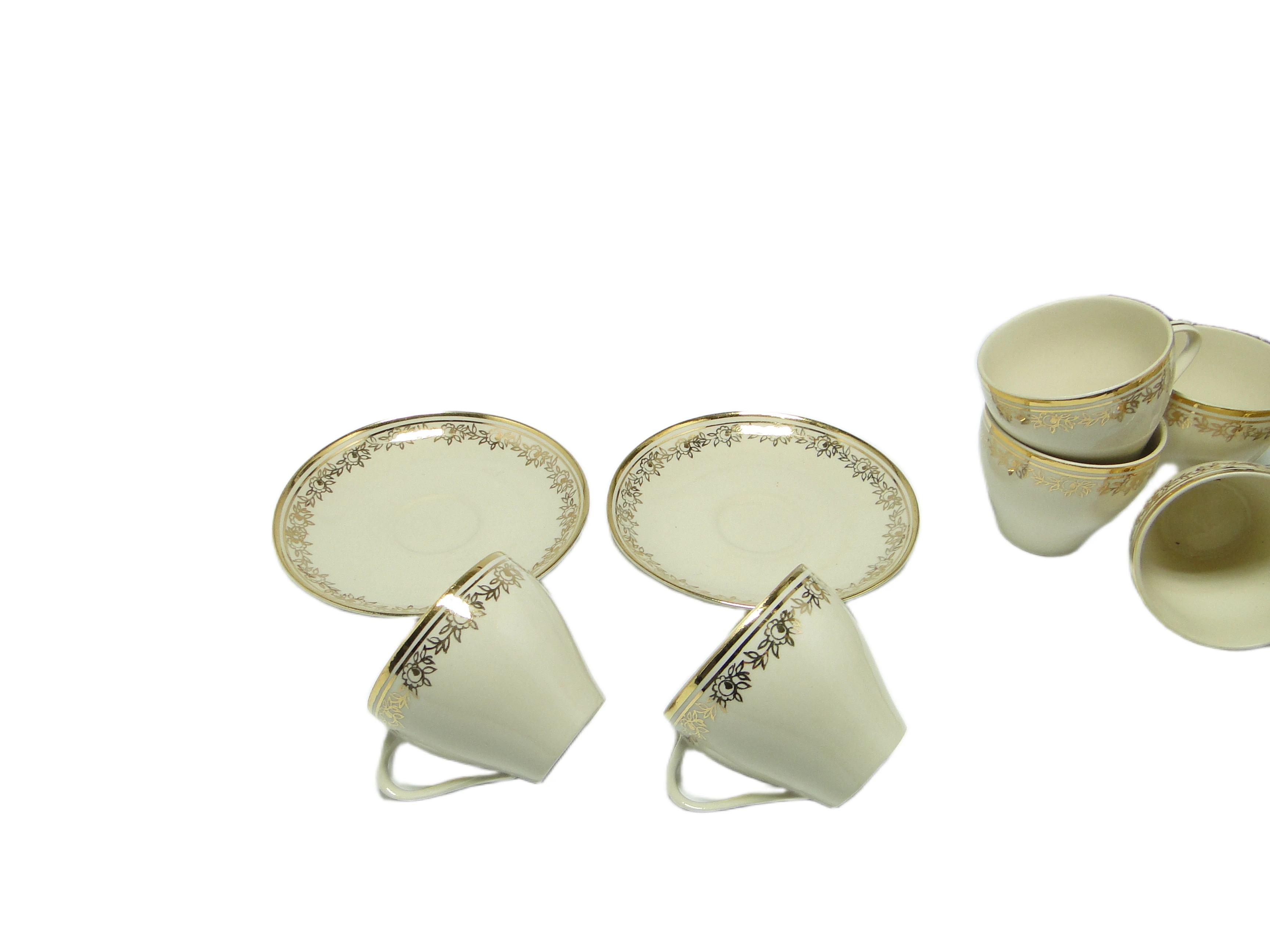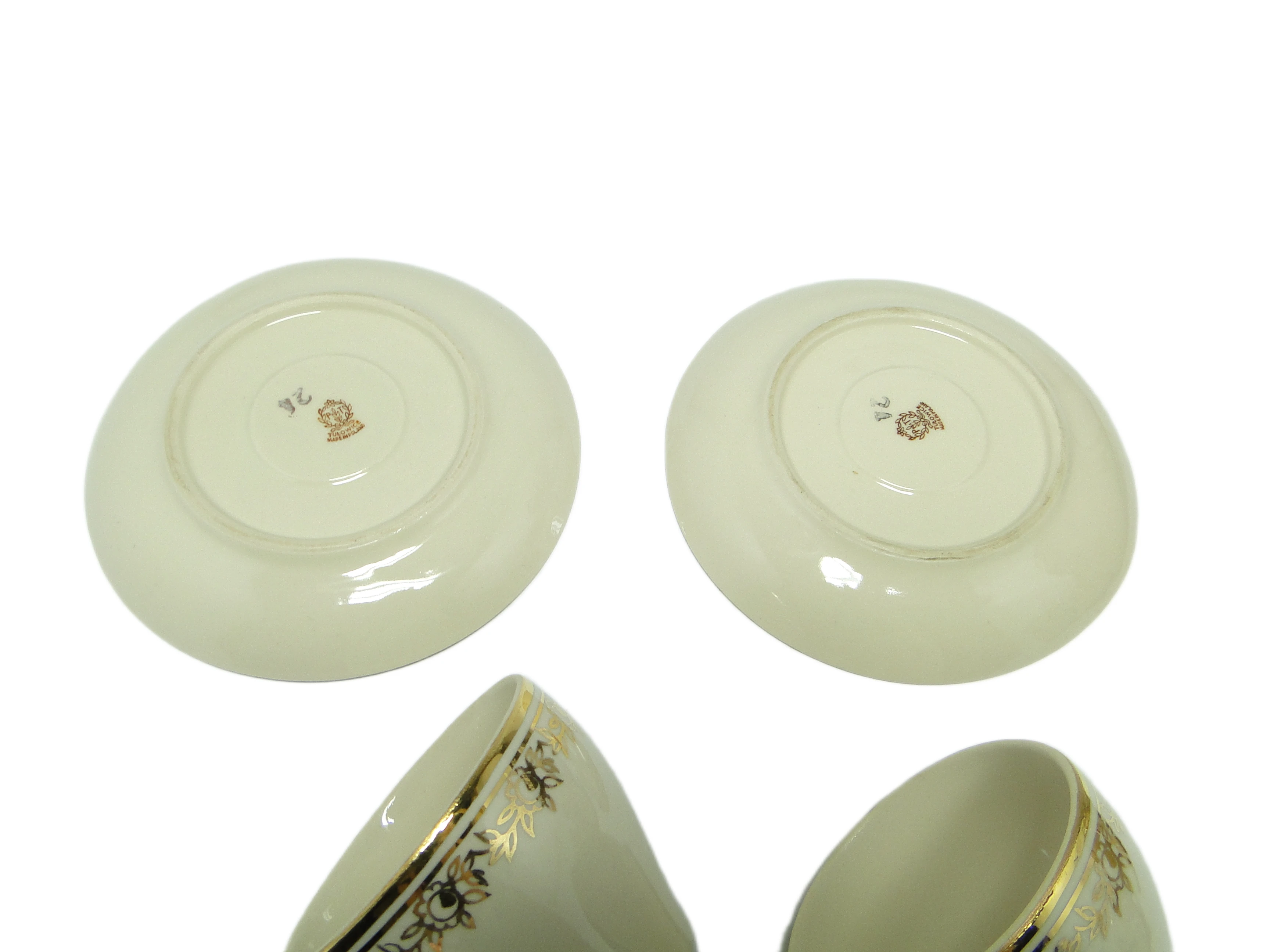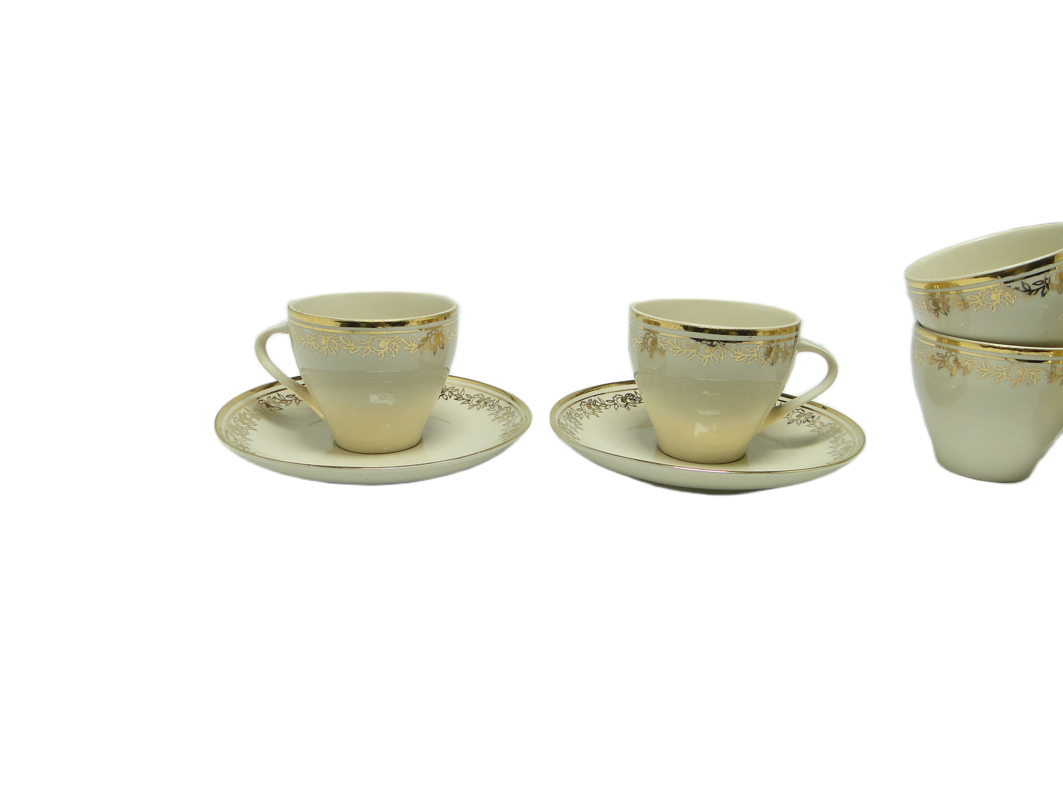 Para filiżanek z kolekcji „Ewa”, wyprodukowana w Polsce w latach 70., stanowi przykład późnego modernizmu w polskim wzornictwie użytkowym. Wykonane z porcelany o ciepłym odcieniu kości słoniowej, zestaw obejmuje dwie filiżanki i dwa spodki, każdy element o wysokim połysku i gładkiej fakturze. Delikatna girlanda kwiatowa, wykonana złotą farbą, biegnie wokół górnej krawędzi filiżanek i spodków, uzupełniona cienkim złotym paskiem na rantach. Smukłe, wyprofilowane uchwyty podkreśla subtelna linia złocenia, a proporcje naczyń – lekko rozchylone ku górze czarki oraz szerokie, stabilne spodki – odwołują się do klarownych linii i łagodnych krzywizn charakterystycznych dla epoki. Na spodzie spodków widnieje sygnatura producenta, potwierdzająca autentyczność. Zestaw zachowany jest w bardzo dobrym stanie, bez widocznych uszkodzeń ani przetarć złocenia.W tych filiżankach pobrzmiewa głos lat 70., kiedy polskie wzornictwo balansowało pomiędzy funkcjonalnością a subtelną dekoracyjnością. Porcelana lśni jakby przechowywała wspomnienia o domowych popołudniach i rodzinnych spotkaniach, a złote girlandy nawiązują do codziennych, małych świąt, jakie niosła kawa czy herbata. Forma przemawia łagodnością i zaproszeniem do zatrzymania się – w czasach, gdy estetyka mid-century modern otwierała się na miękkie światło i przyjazne linie.Zestaw „Ewa” można wykorzystać zarówno użytkowo, jak i dekoracyjnie. Filiżanki dobrze zaprezentują się na niskiej konsoli w salonie, obok wazonu ze świeżymi kwiatami lub grafiki w duchu modernizmu. Warto zestawić je z białą ceramiką o prostych liniach, by wydobyć ciepły odcień porcelany i delikatność złocenia. Sprawdzą się w aranżacjach inspirowanych mid-century modern, jak również w eklektycznych kolekcjach, gdzie liczy się detal i historia.