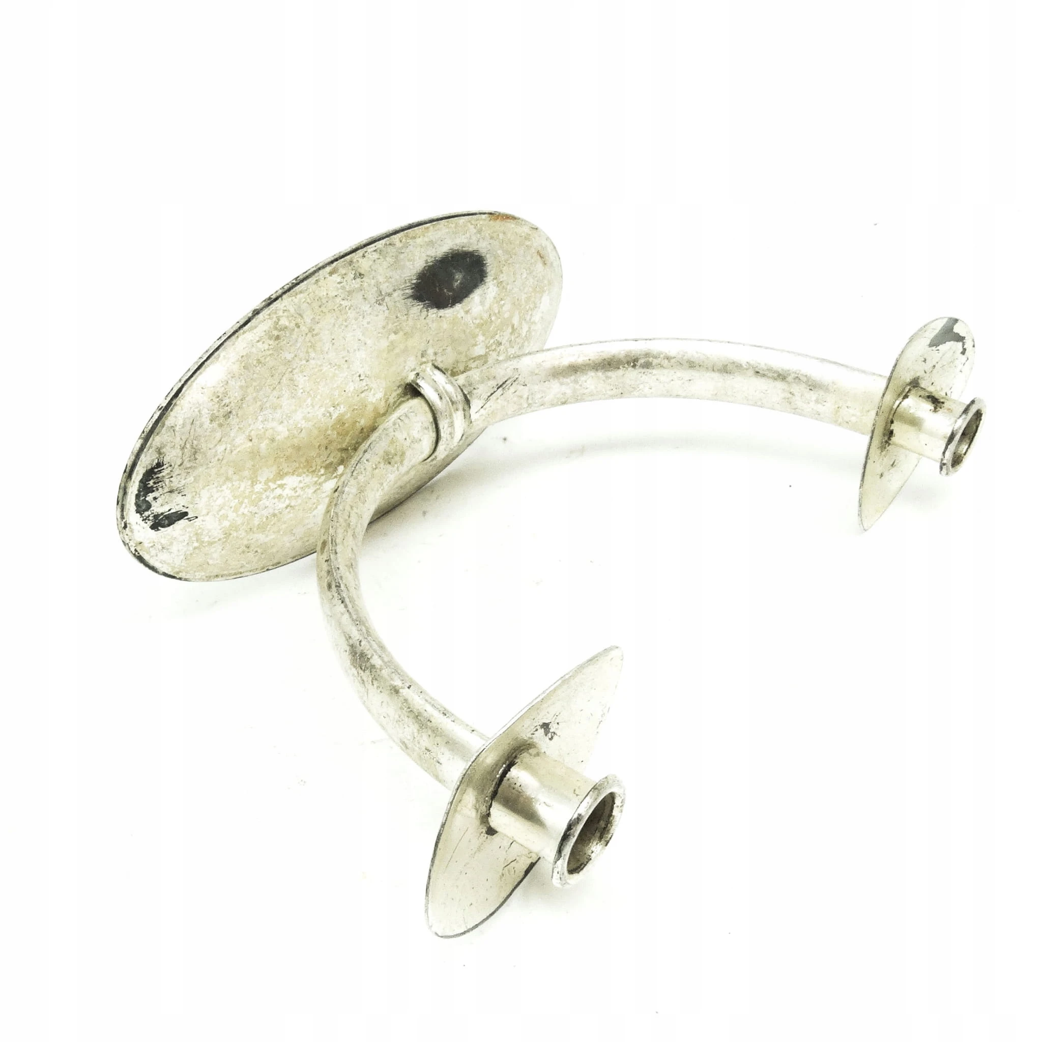 Wspiera się na szerokiej podstawie, ramiona wyprofilowane na kształt litery U, zakończone uchwytami na świecę.