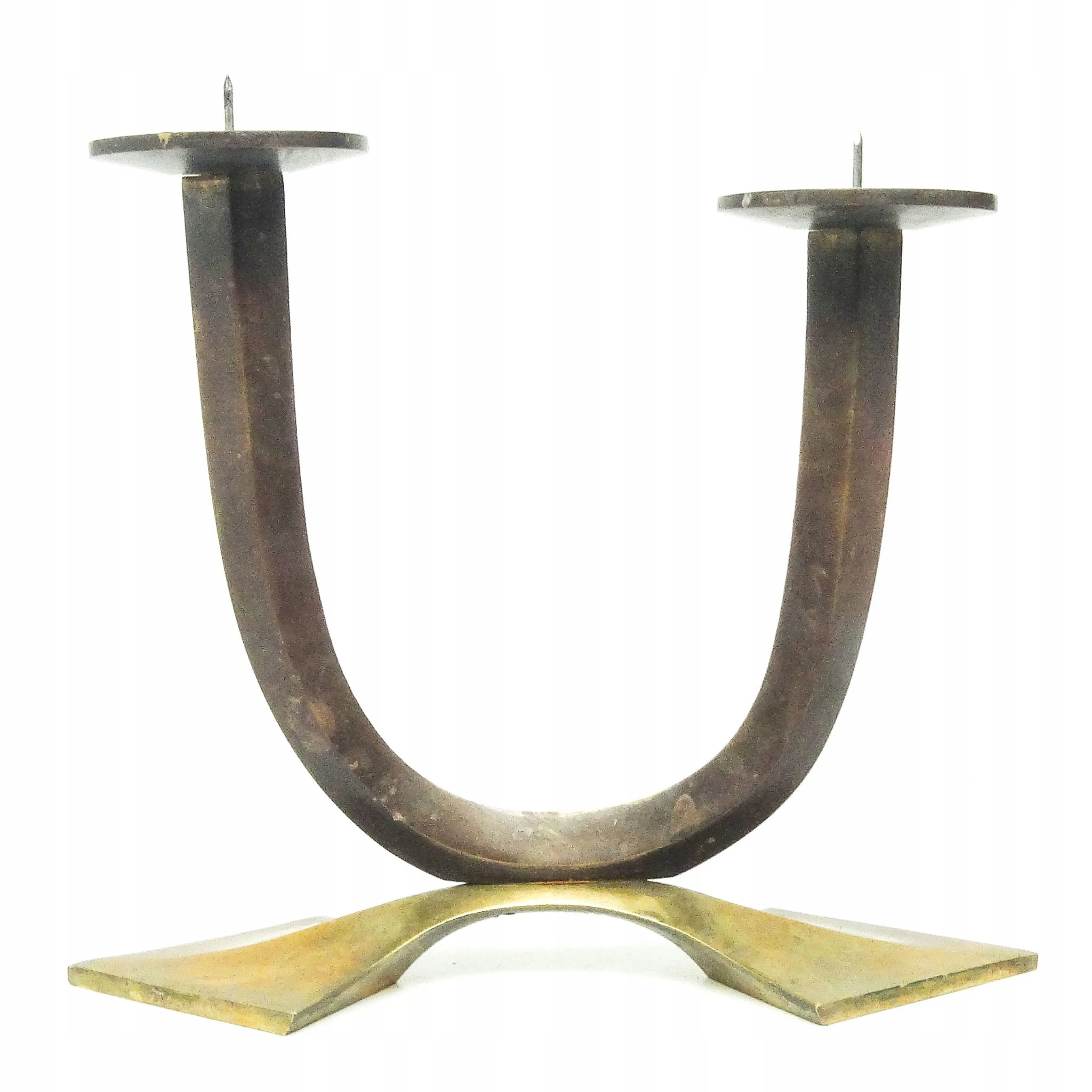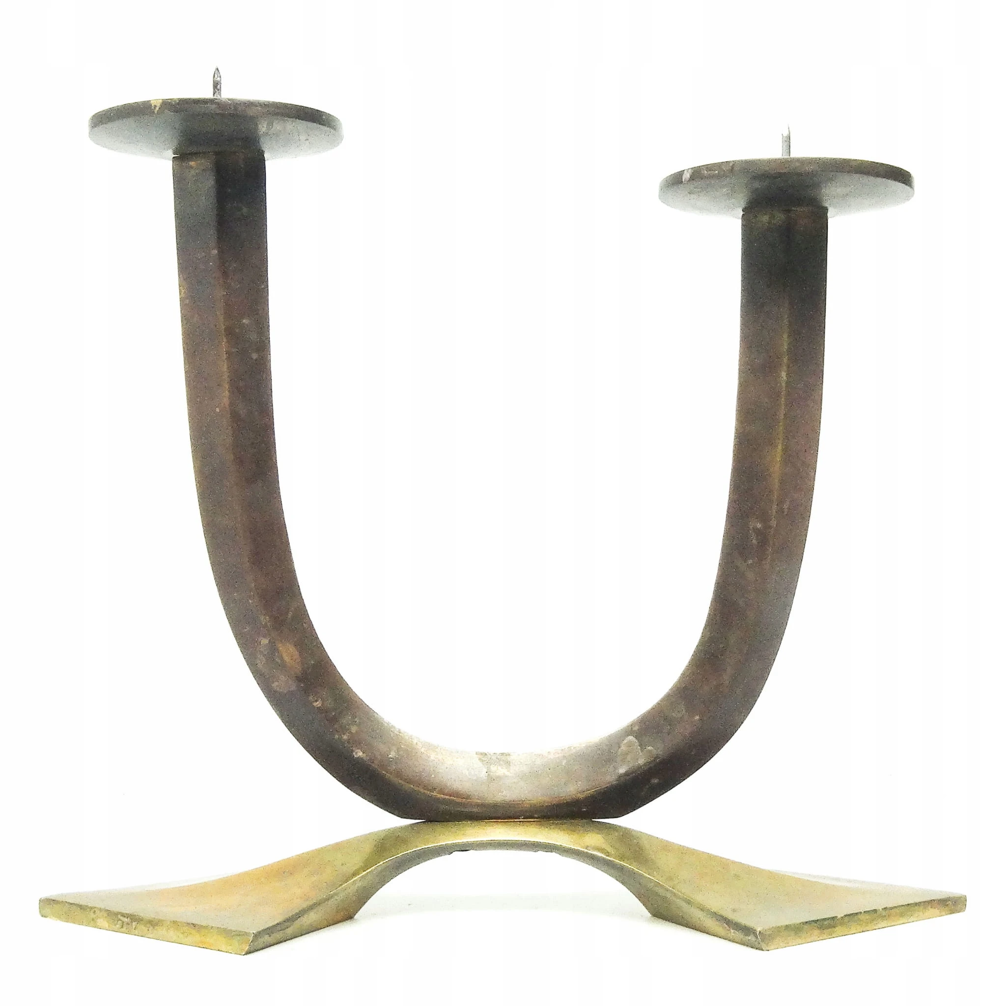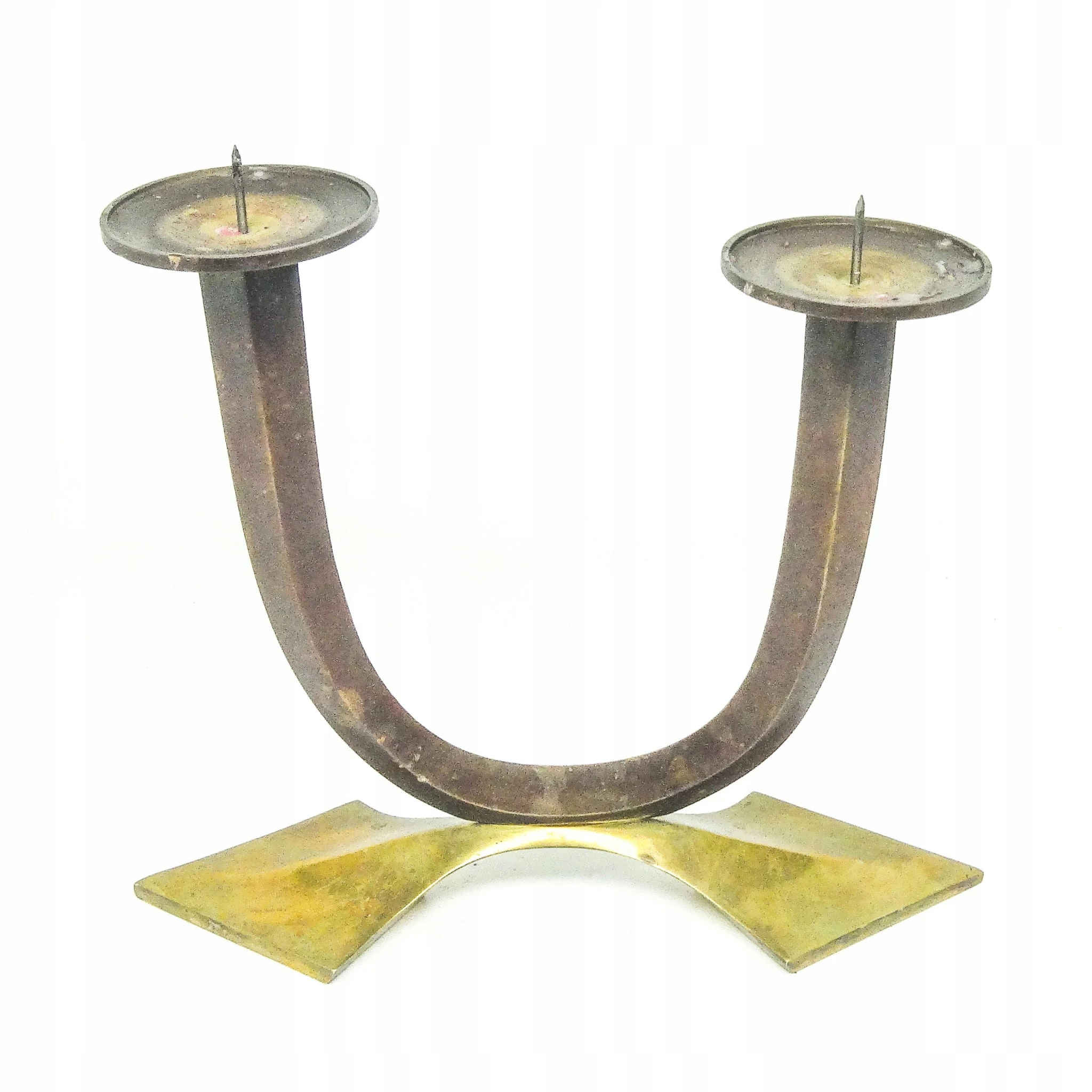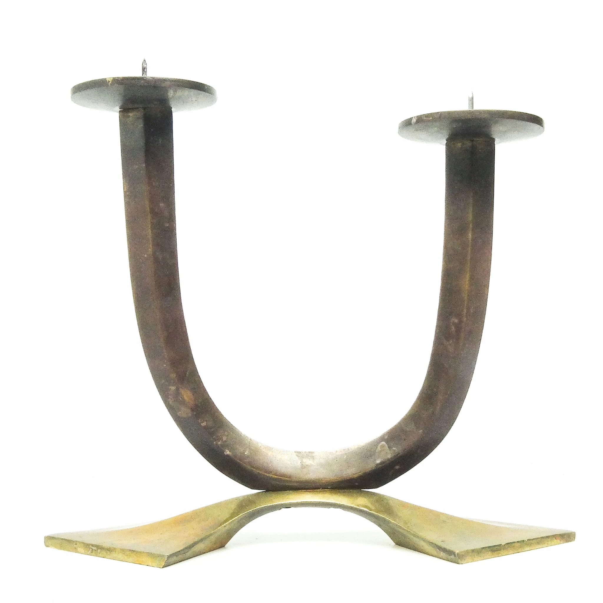 Wspiera się na szerokiej podstawie, ramiona wyprofilowane na kształt litery U, zakończone uchwytami na świecę.