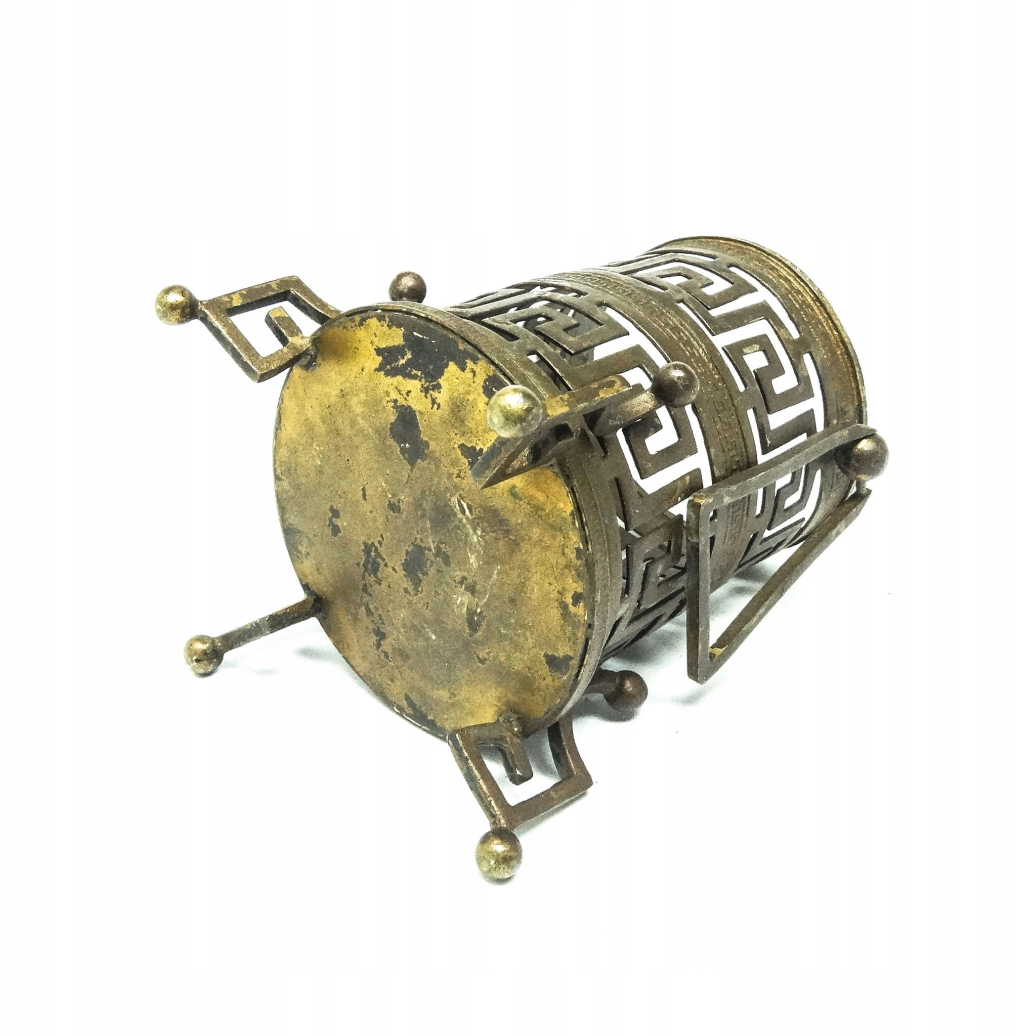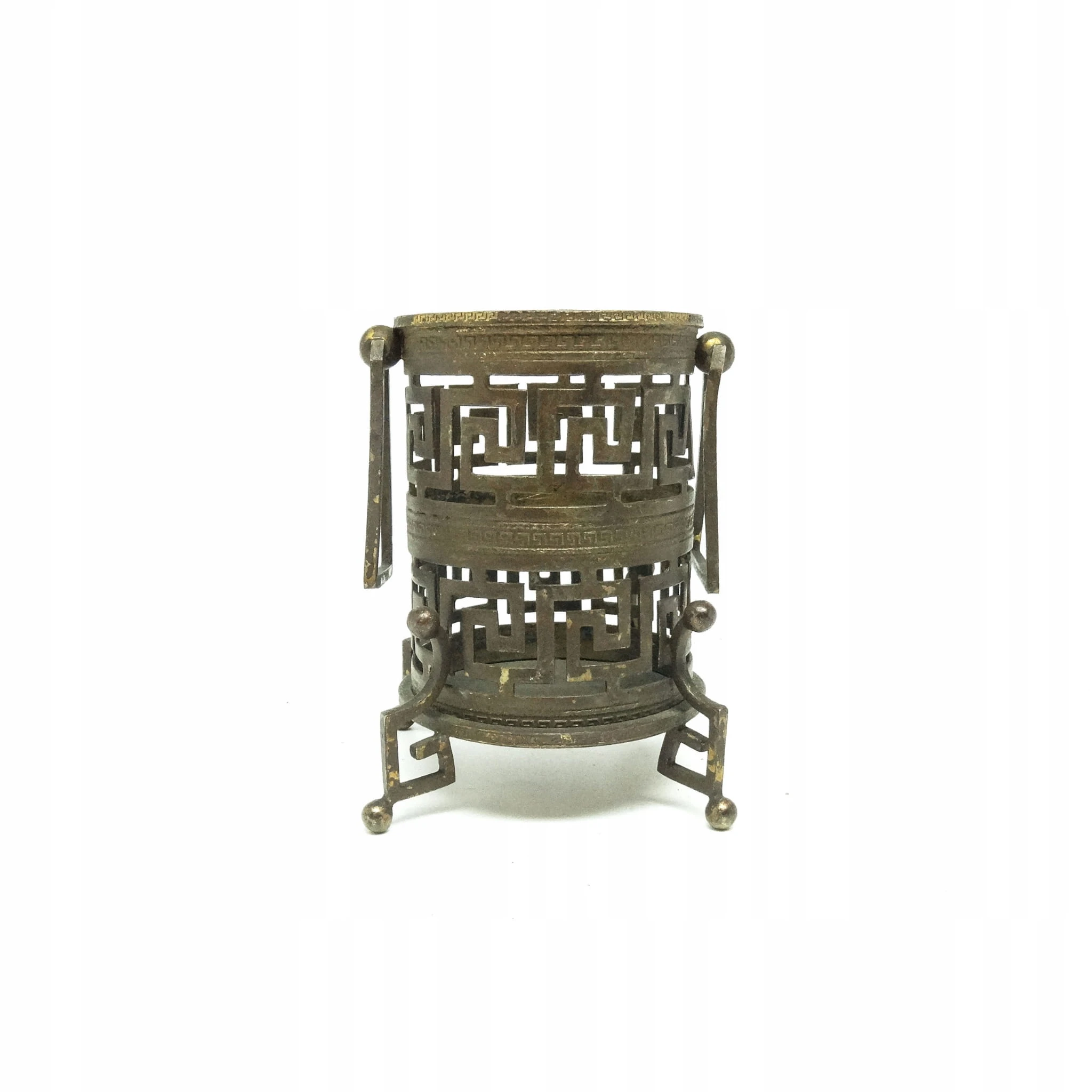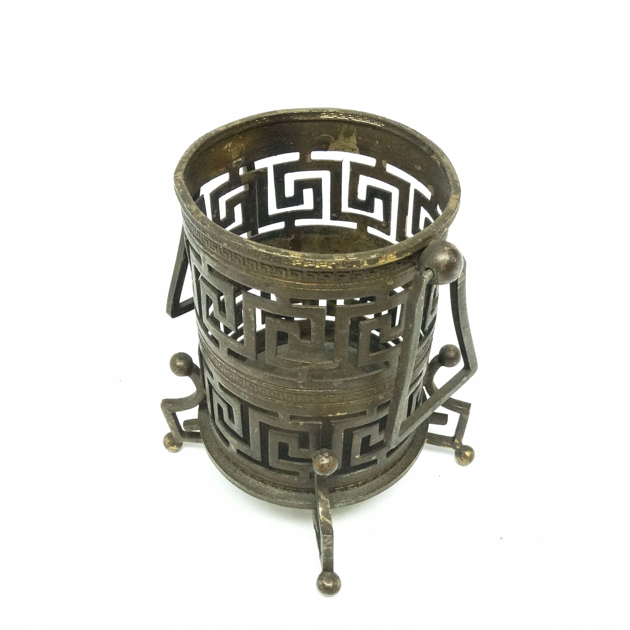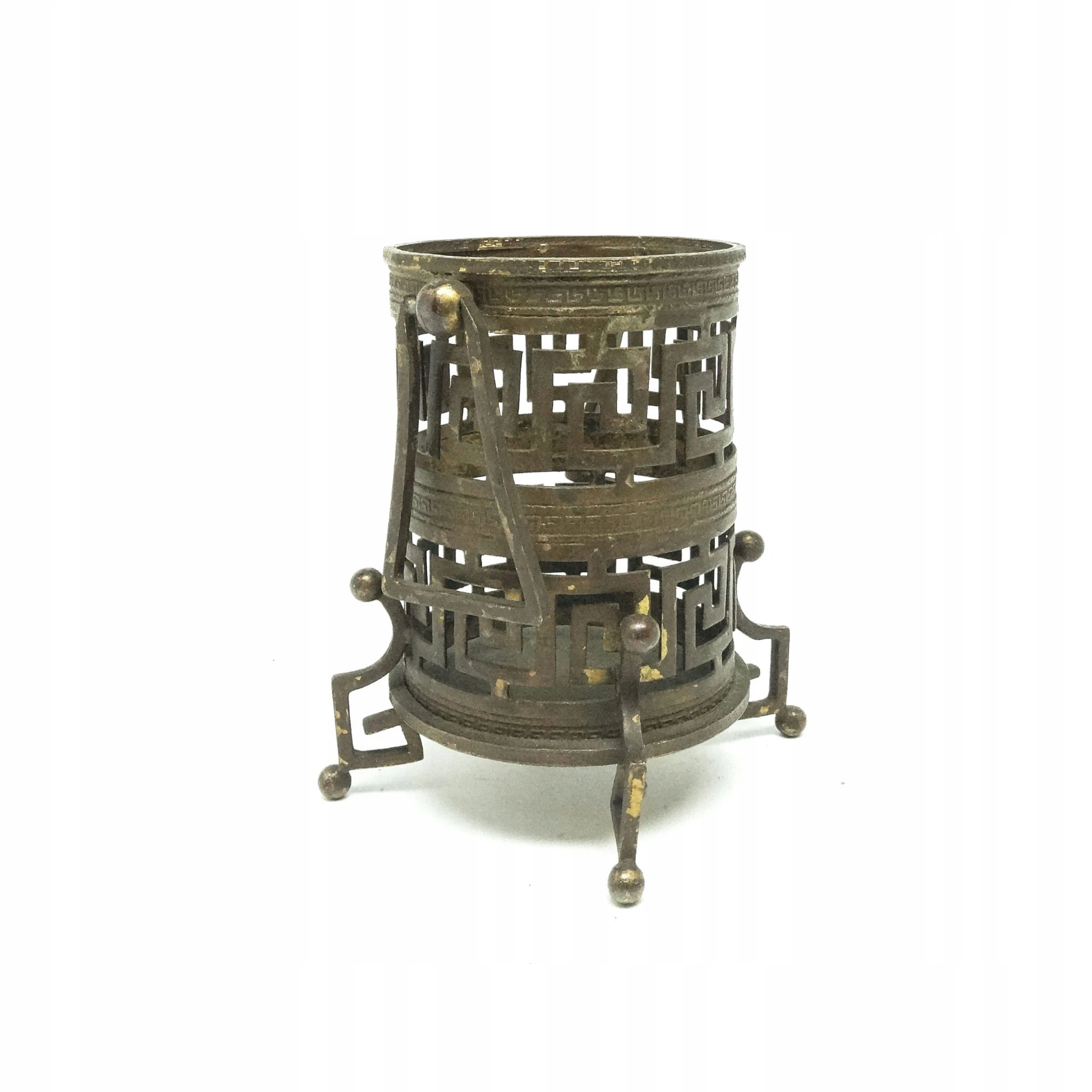 Wazon pochodzi z lat 1880-1900. Stan przedmiotu jest dobry. Wykonany na terenie Austro-Węgier. Wykonany w stylu eklektycznym. W całości składa się z połączonych wstęg nazywanych wzorem greckim. Naje się idealnie do suszonych lub sztucznych kwiatów. Wykonany z brązu.