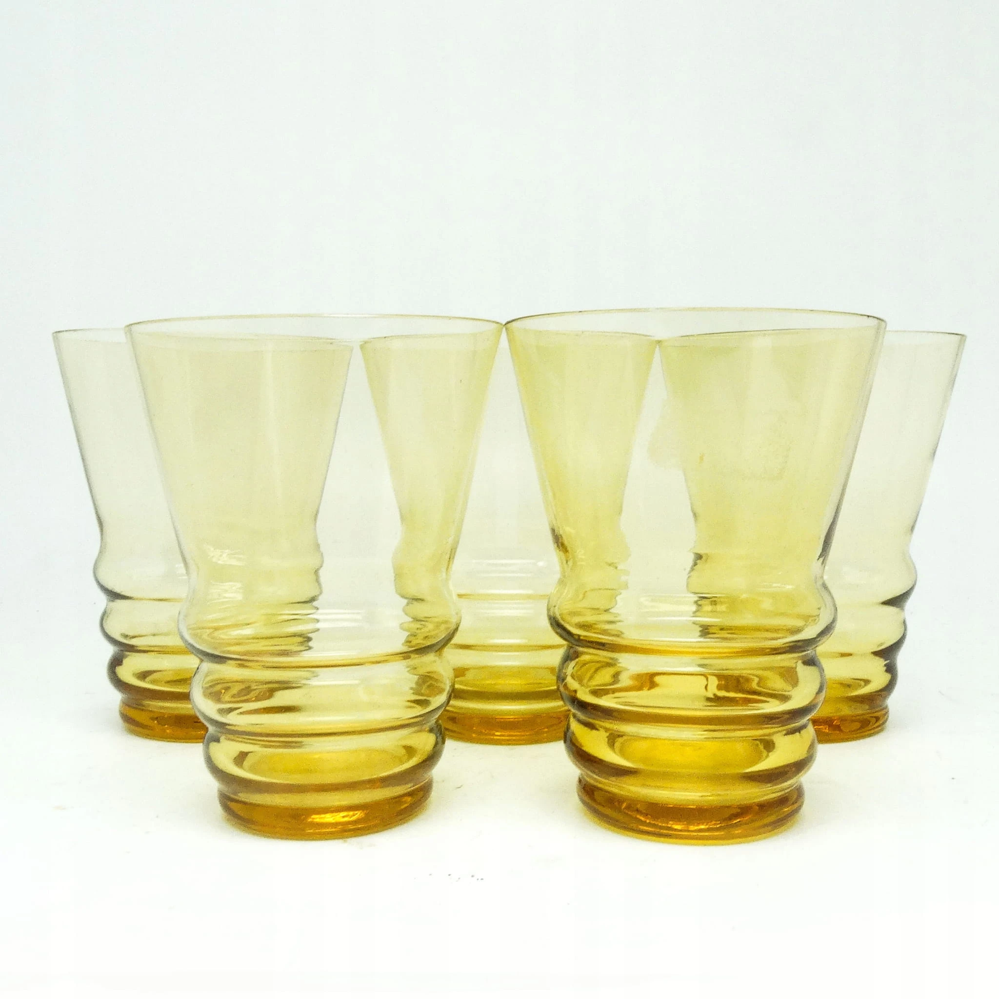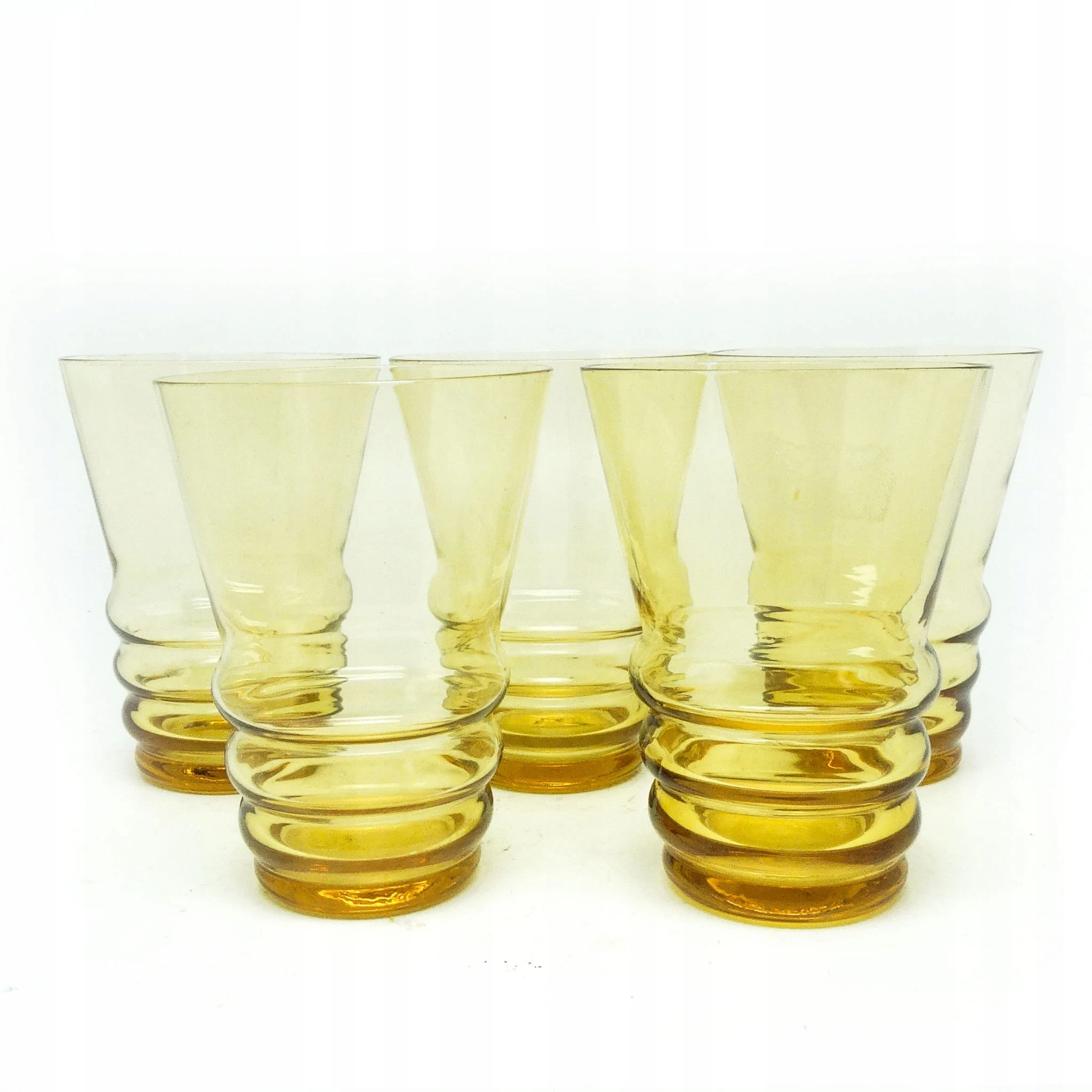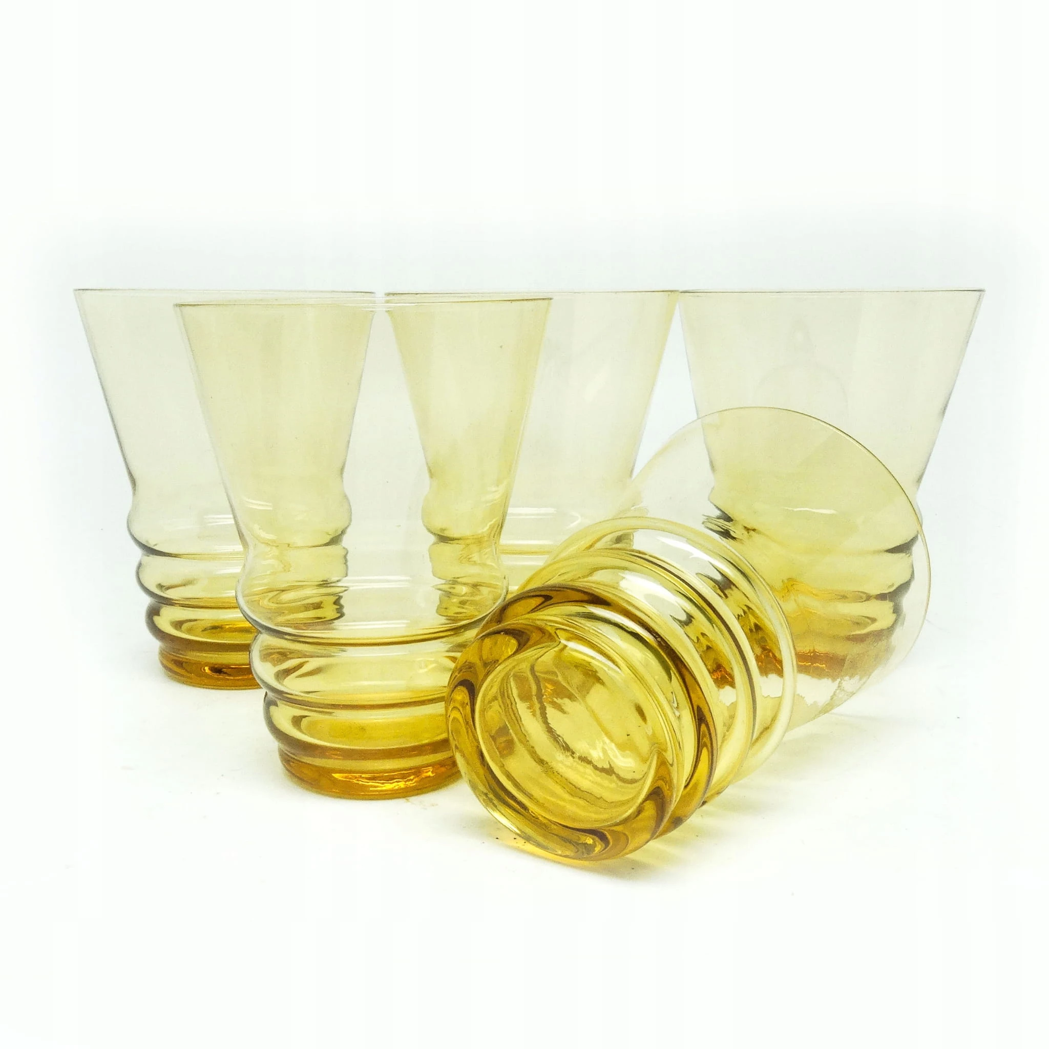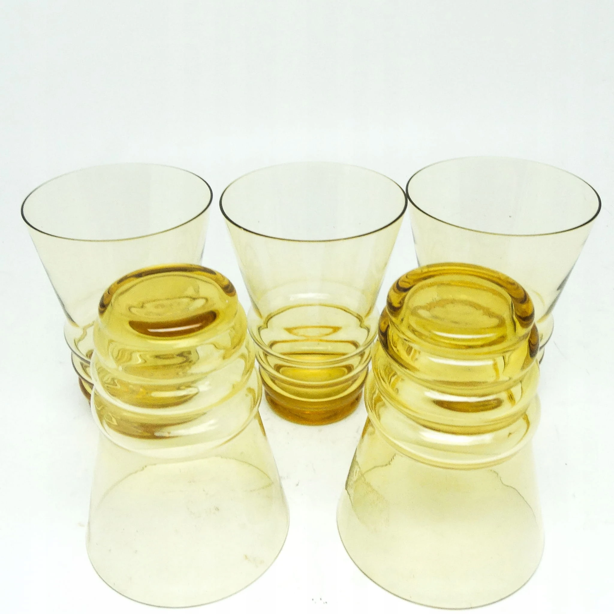 Szklanki wykonane metodą prasowania, ze szkła w odcieniu żółtym. Wykonane na terenie Czechosłowacji w latach 50. Stan dobry.