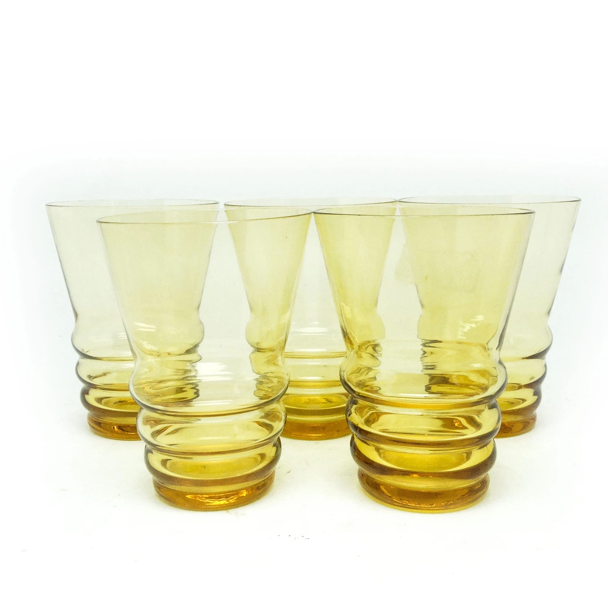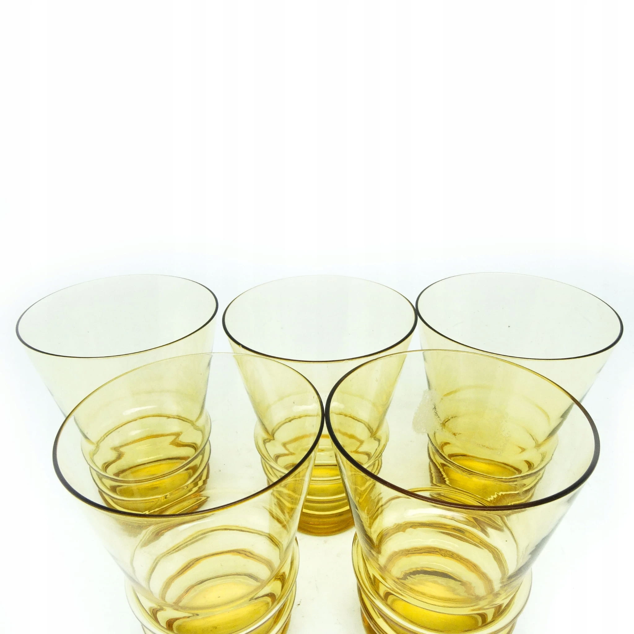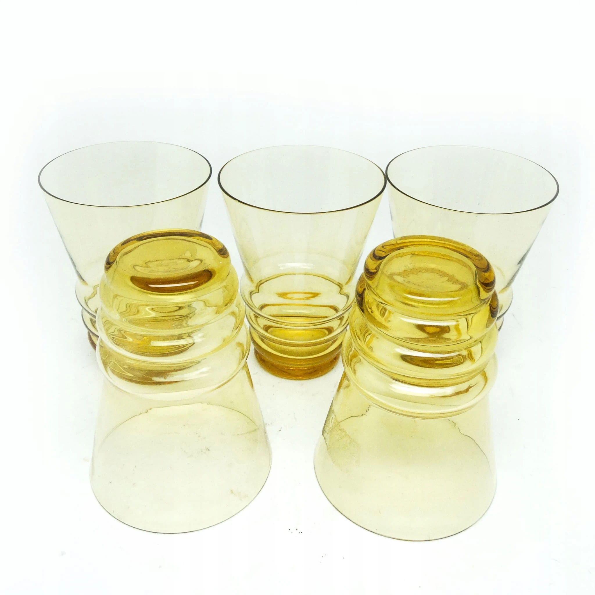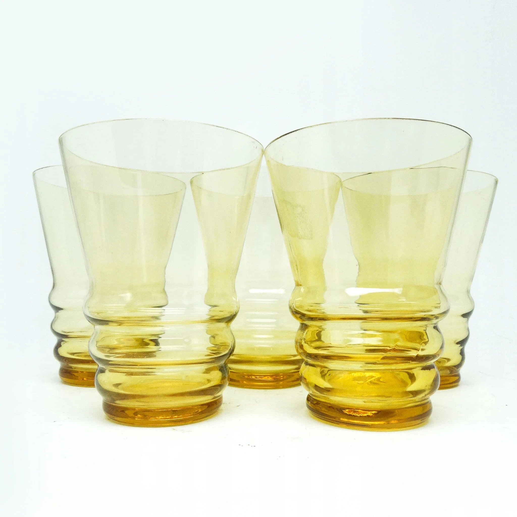 Szklanki wykonane metodą prasowania, ze szkła w odcieniu żółtym. Wykonane na terenie Czechosłowacji w latach 50. Stan dobry.